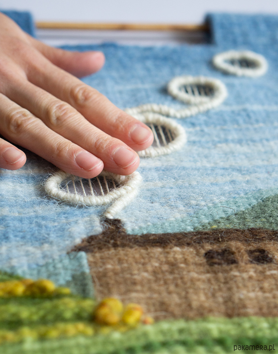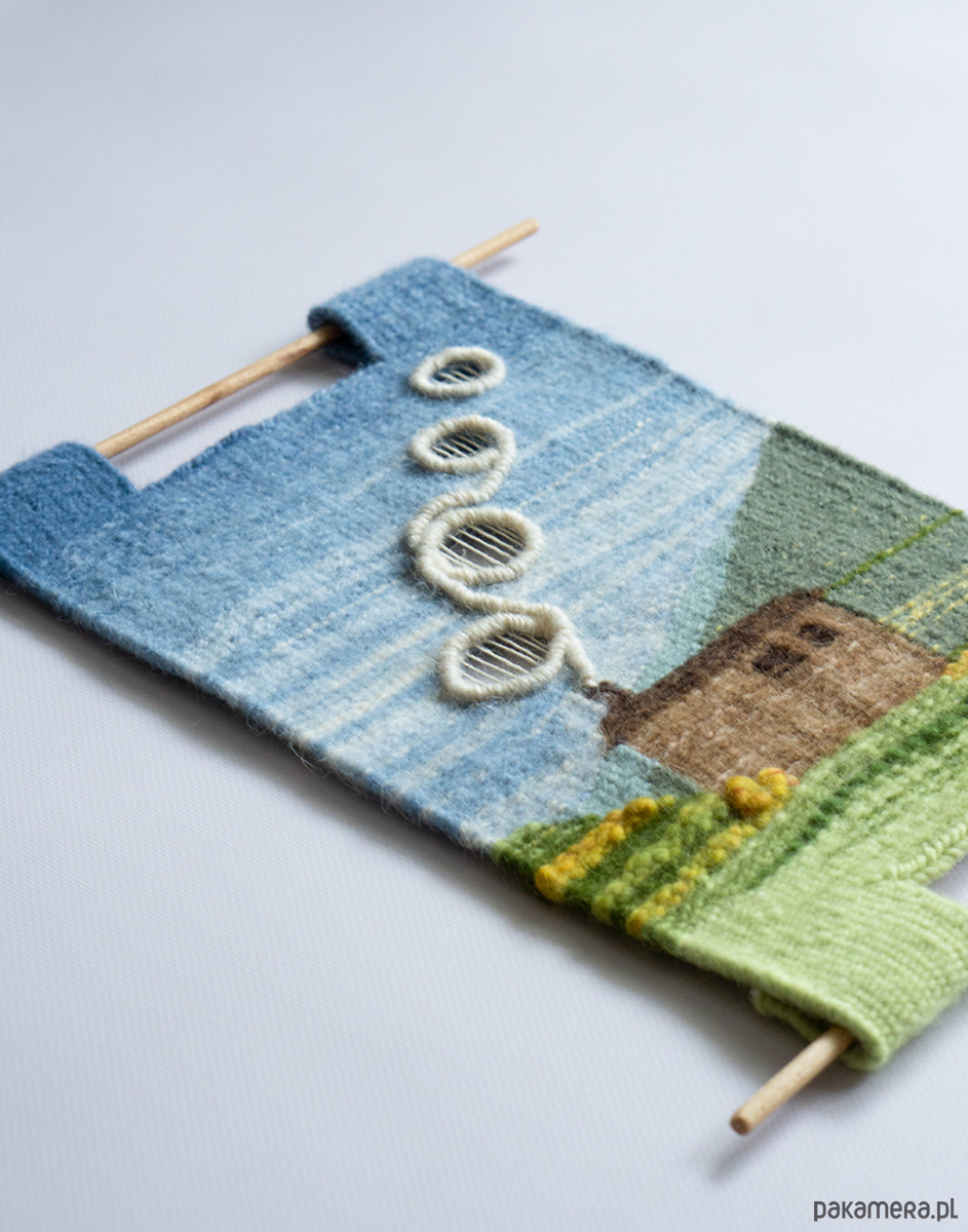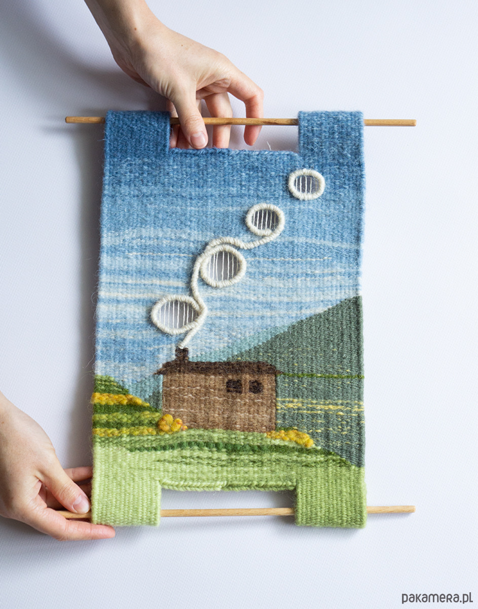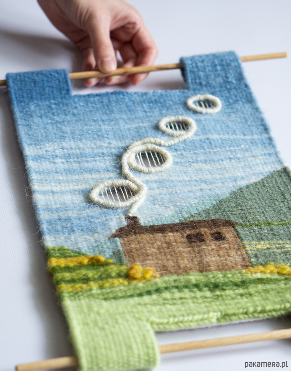 Ręcznie tkany gobelin „Domek w górach” to unikatowa dekoracja ścienna stworzona na klasycznej ramce tkackiej. Projekt przedstawia urokliwy, górski domek otulony spokojnym krajobrazem i niebem wykonanym w wielu odcieniach błękitu. Całość tworzy przytulną, niemal malarską kompozycję, która wniesie do wnętrza atmosferę ciepła i wyciszenia.