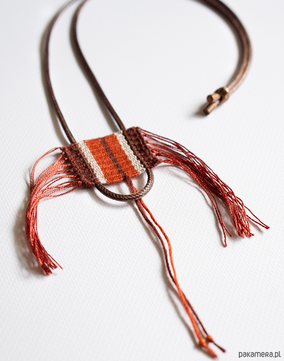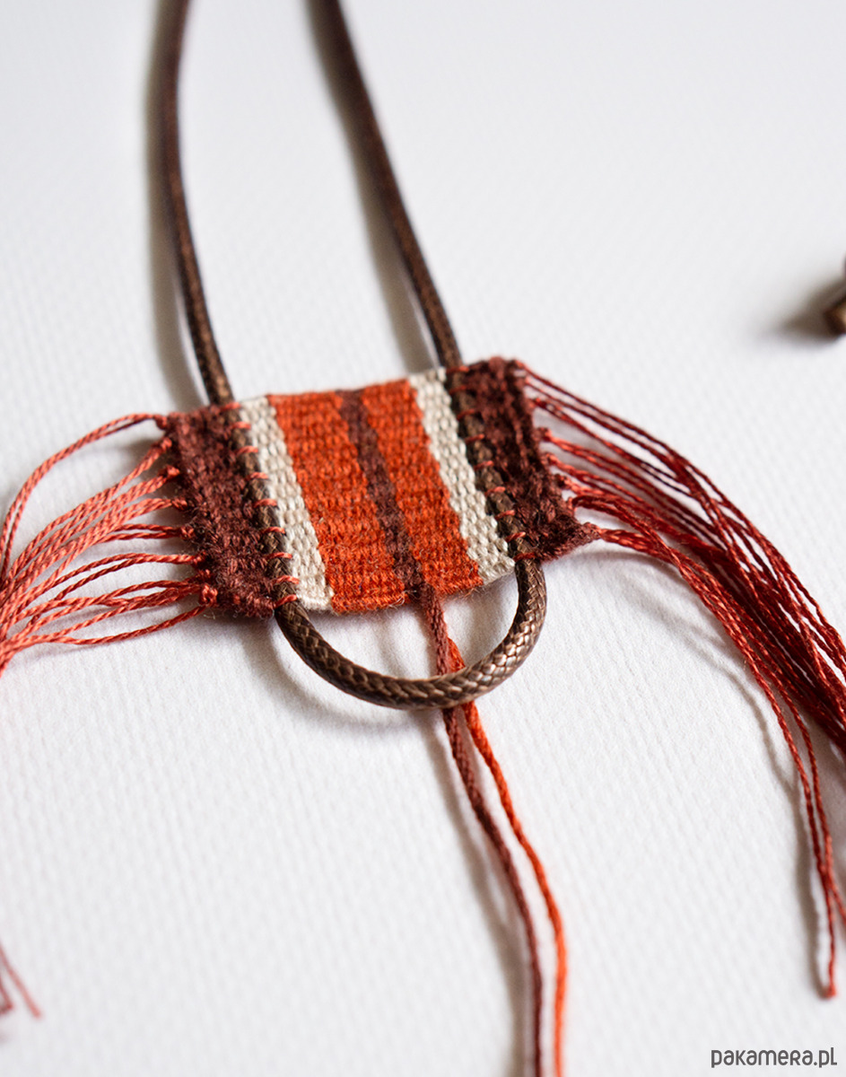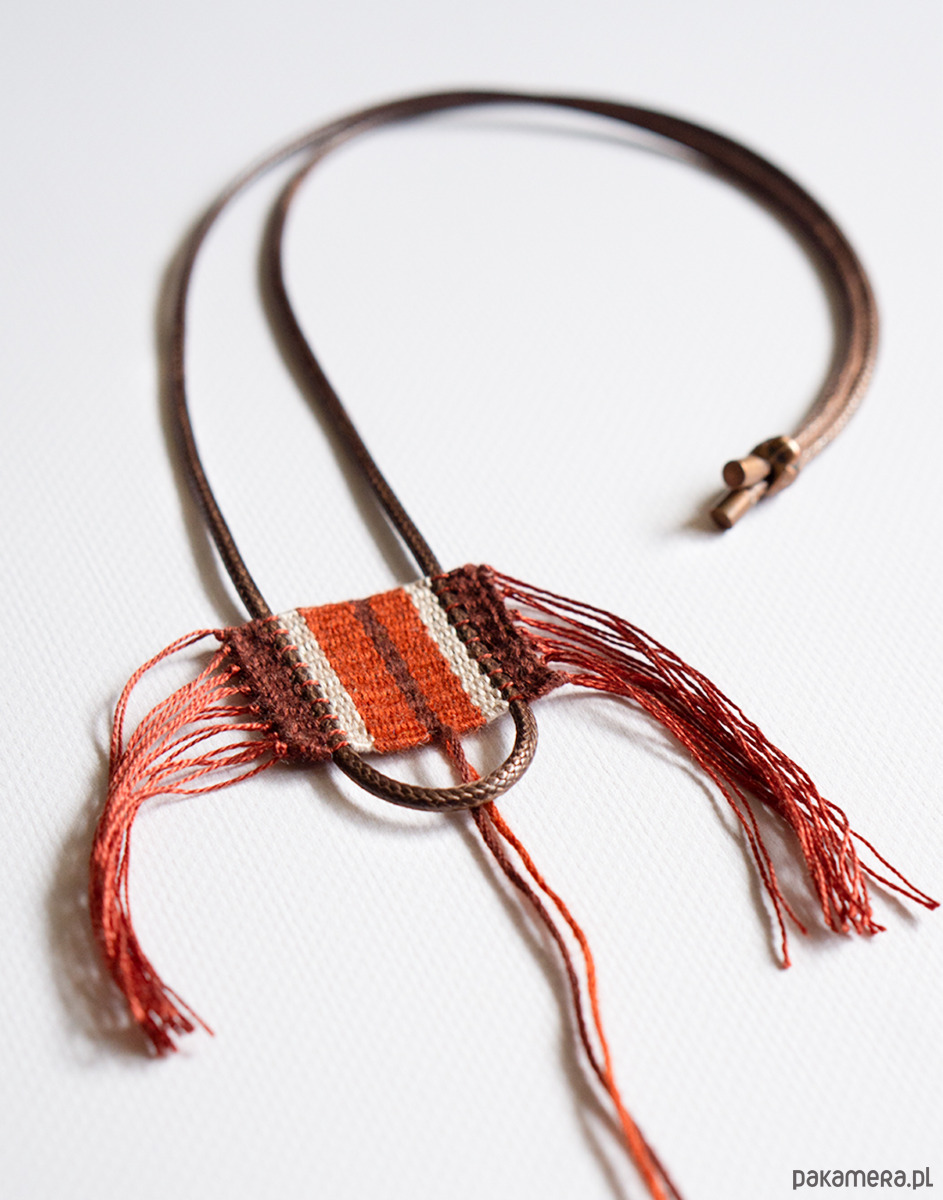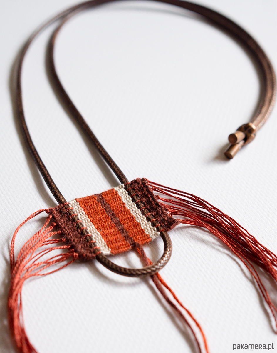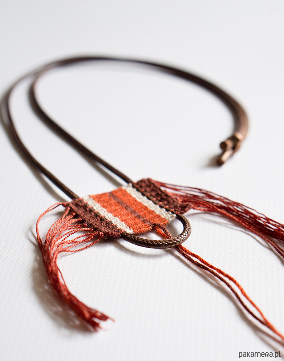 Unikalny ręcznie tkany naszyjnik w ciepłych odcieniach czerwieni. Centralnym elementem jest misternie wykonany wisiorek w odcieniach ciepłej czerwieni, rdzawego brązu i delikatnego beżu. Subtelne frędzle dodają mu lekkości i oryginalnego, etnicznego charakteru.