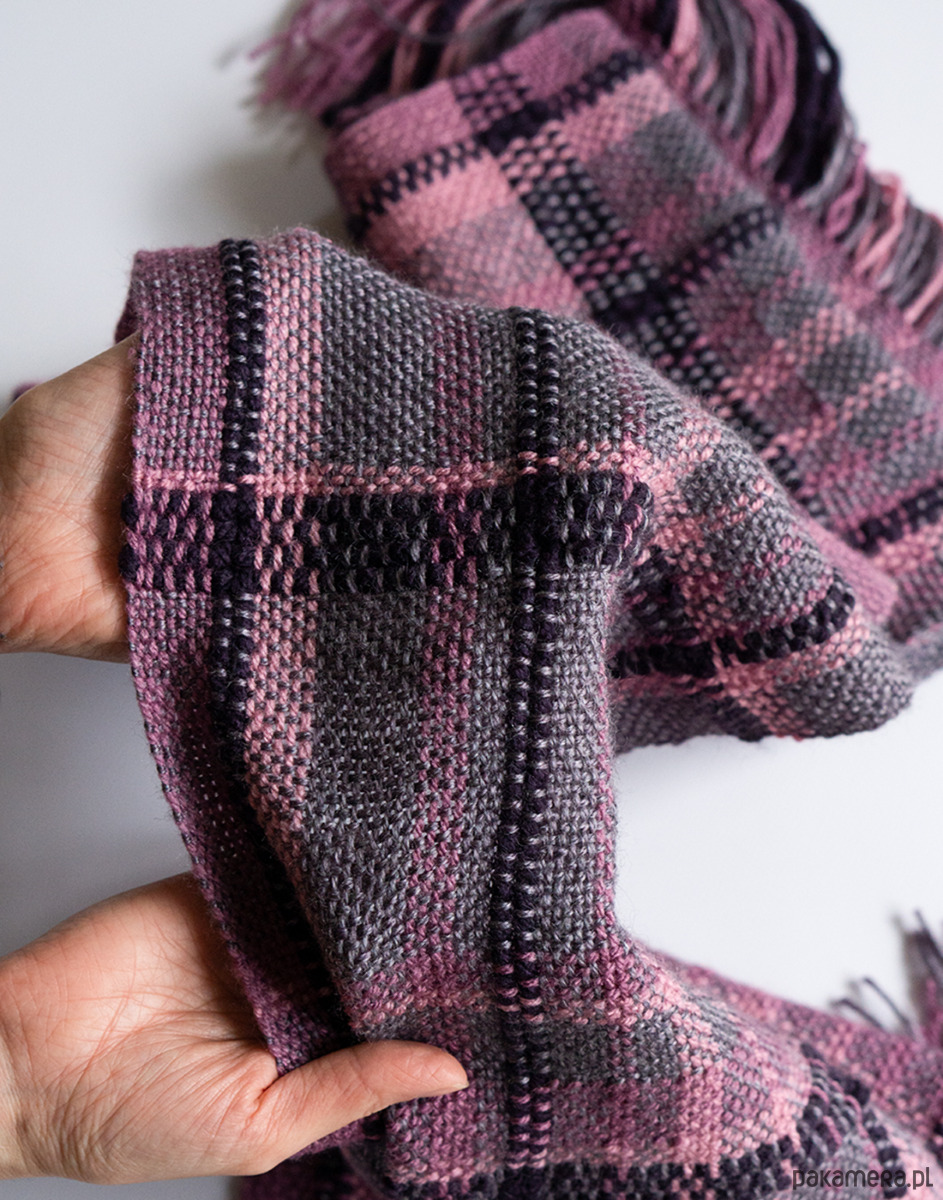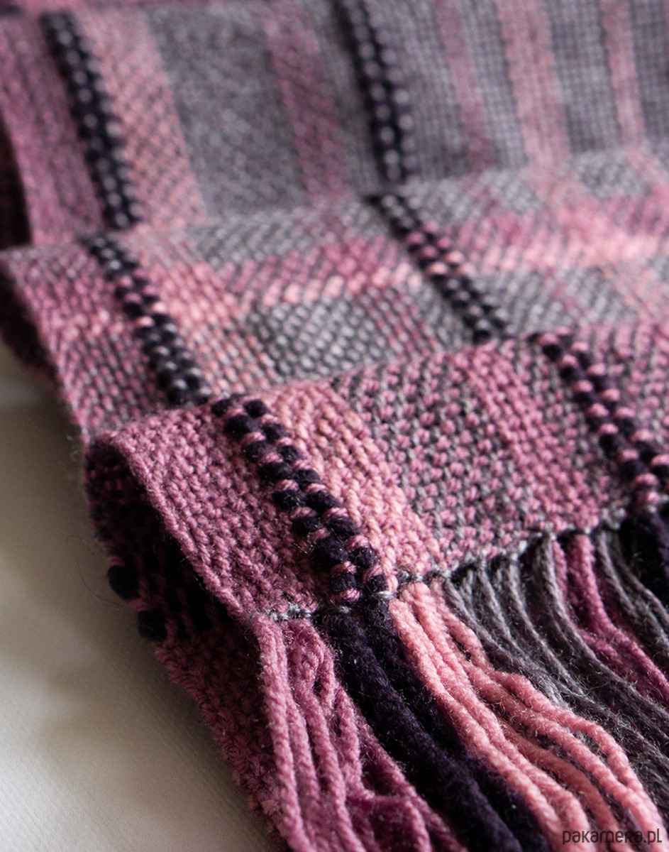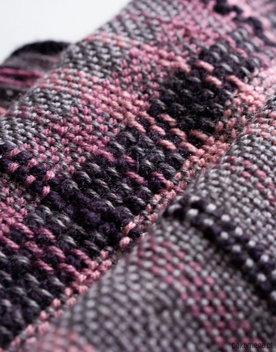 Ten szalik został utkany ręcznie na krośnie stołowym. Połączenie fioletu i różu ciekawą paletę kolorystyczną, która dobrze wpisuje się w codzienne stylizacje, ale nie jest oczywista.