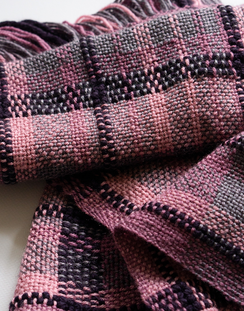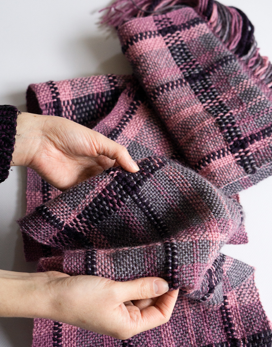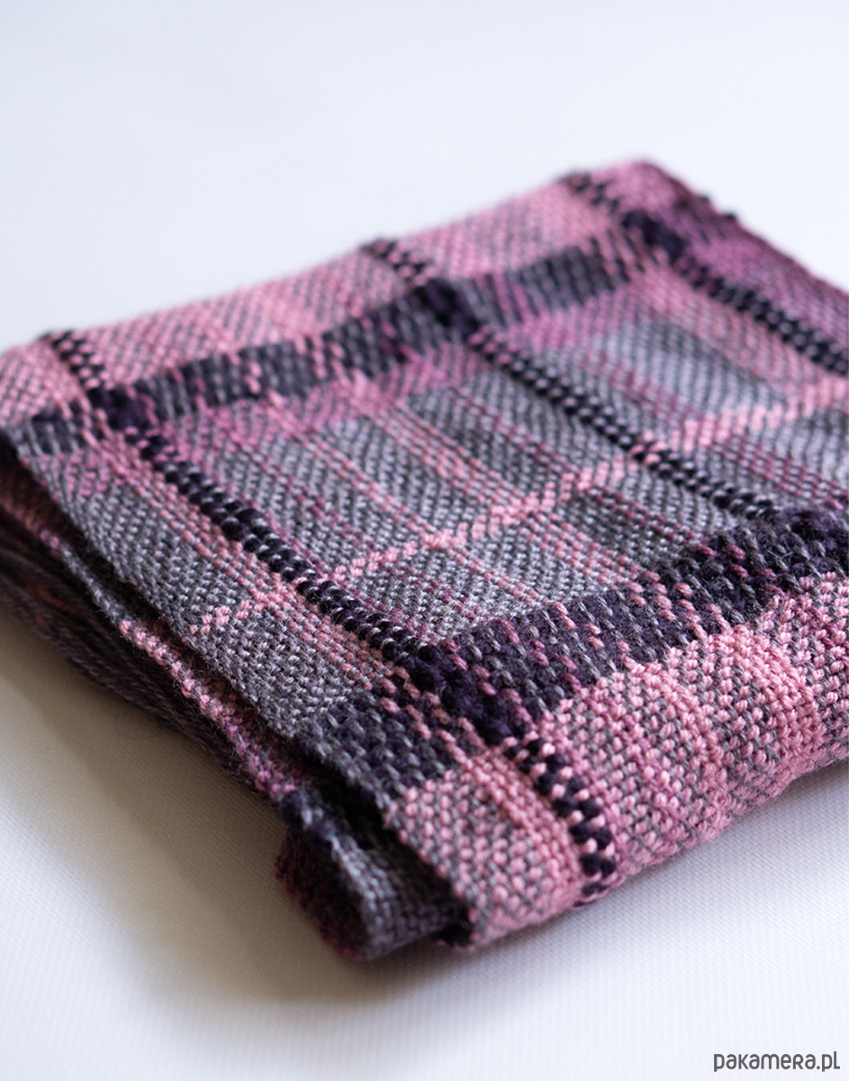 Ten szalik został utkany ręcznie na krośnie stołowym. Połączenie fioletu i różu ciekawą paletę kolorystyczną, która dobrze wpisuje się w codzienne stylizacje, ale nie jest oczywista.