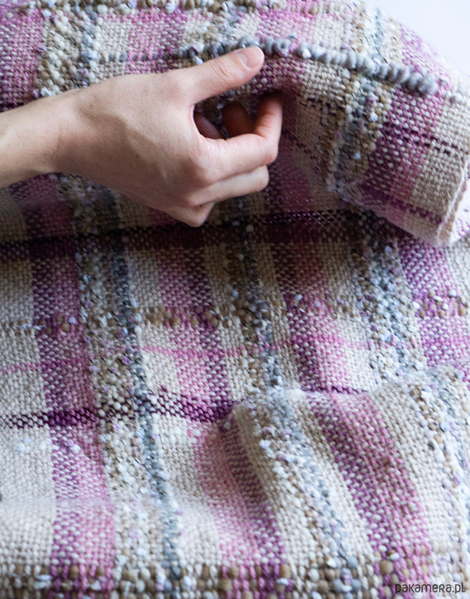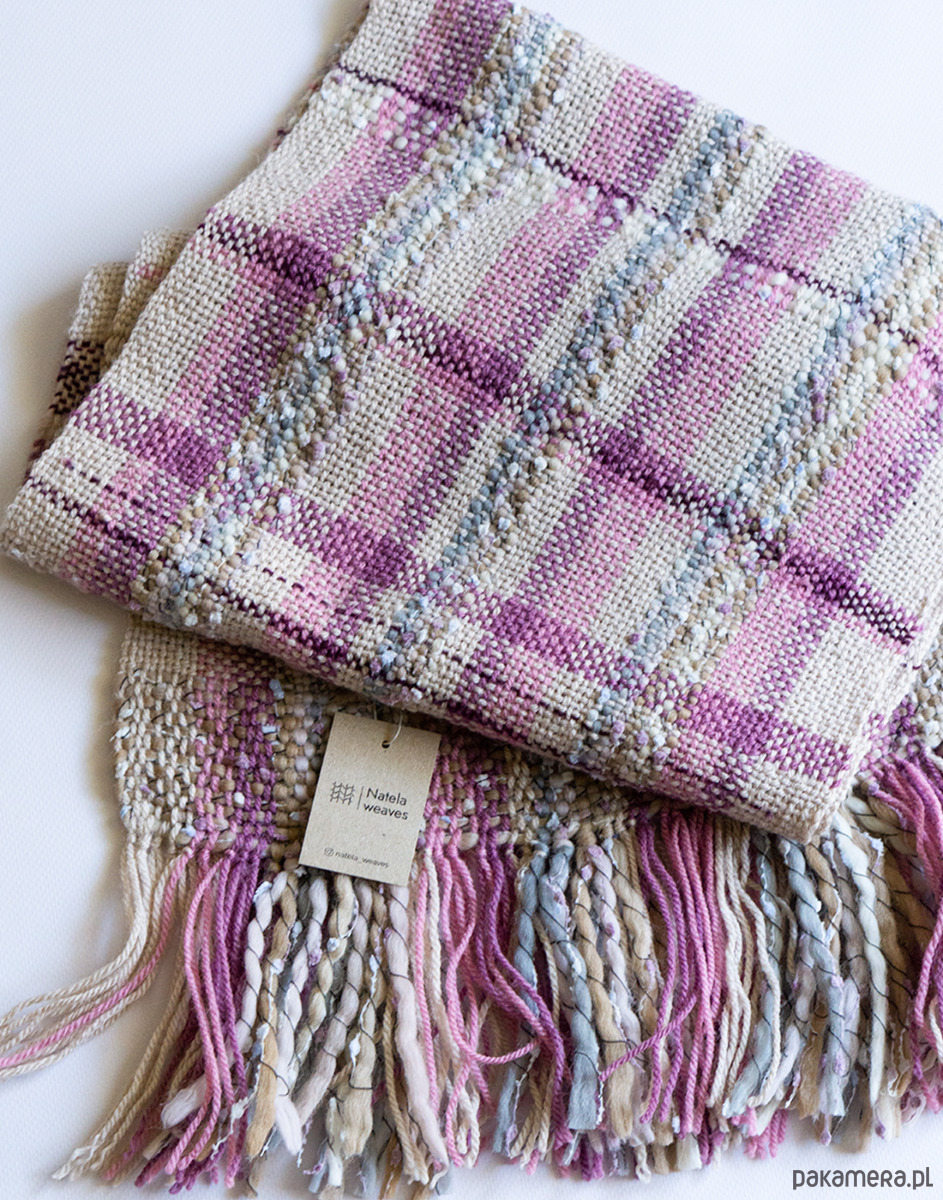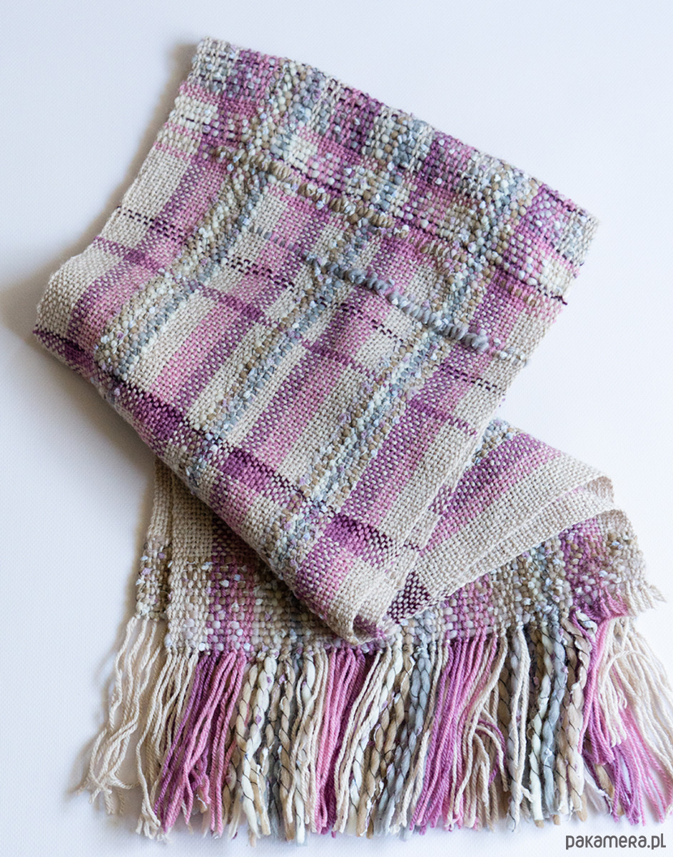 Ten szalik został utkany ręcznie na krośnie stołowym. Połączenie fioletu, różu i beżu tworzy miękką, harmonijną paletę, która dobrze wpisuje się w codzienne stylizacje, ale nie jest oczywista.