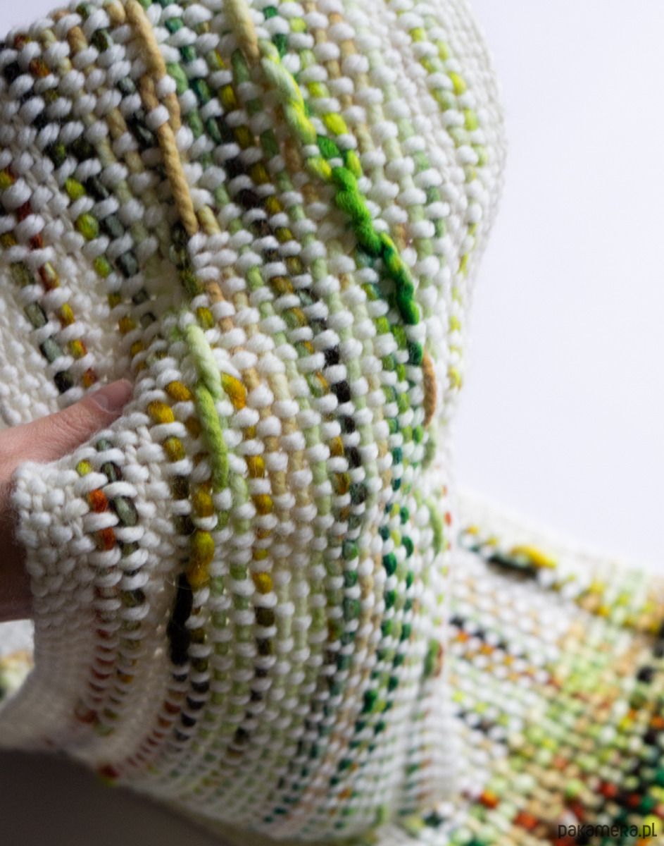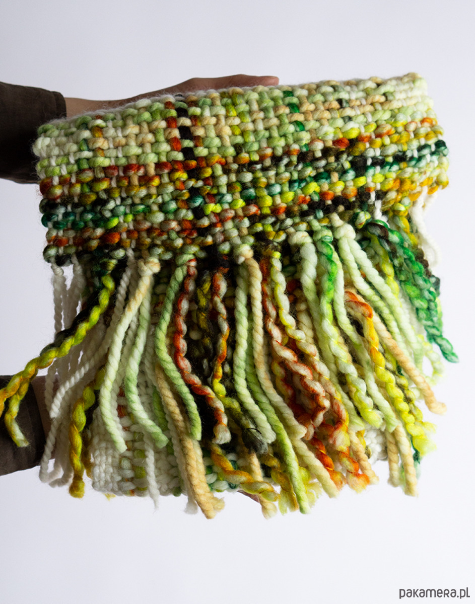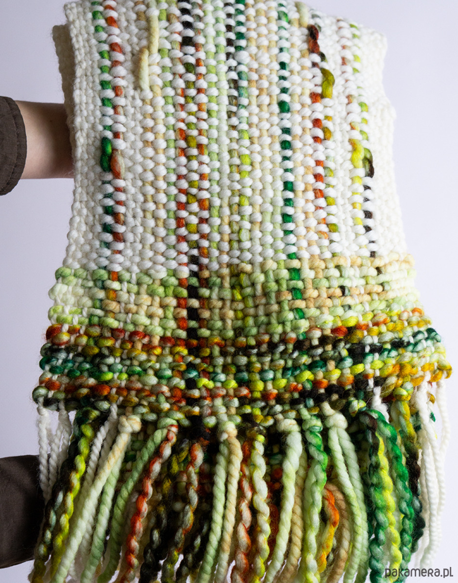Szalik został wykonany ręcznie na krośnie stołowym, co sprawia, że każdy detal jest dopracowany, a całość niepowtarzalna. Połączenie zieleni, pomarańczu i bieli tworzy świeżą, energetyczną kompozycję, która przyciąga uwagę. To dodatek, który ożywi codzienne stylizacje i nada im artystycznego charakteru.
