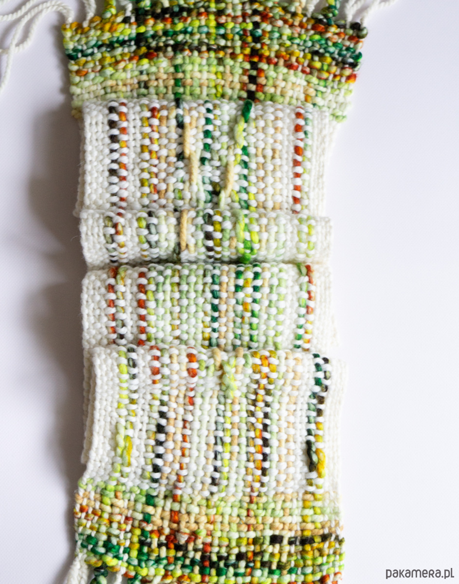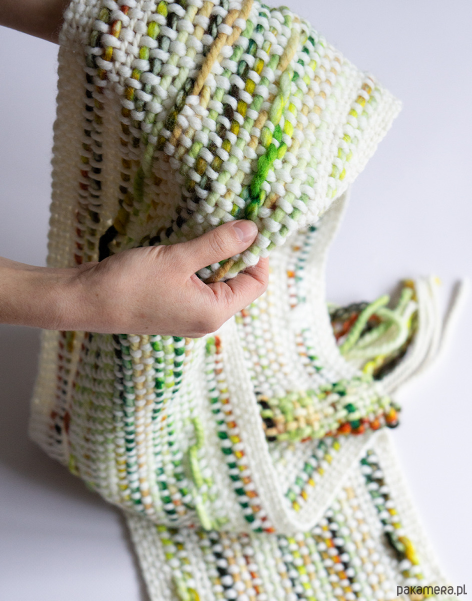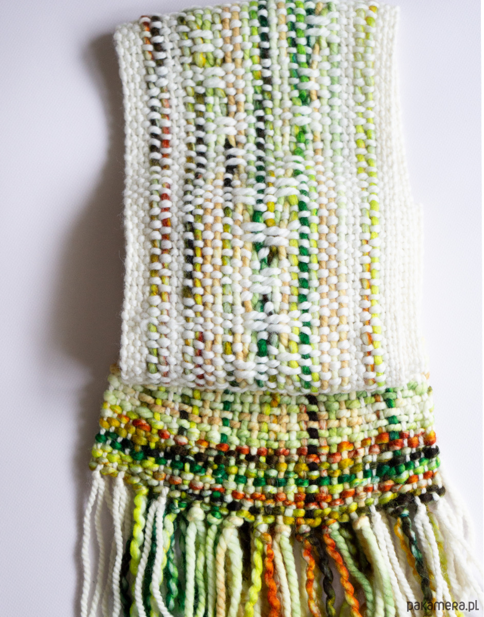 Ręcznie tkany szalik artystyczny w odcieniach zieleni i bieli