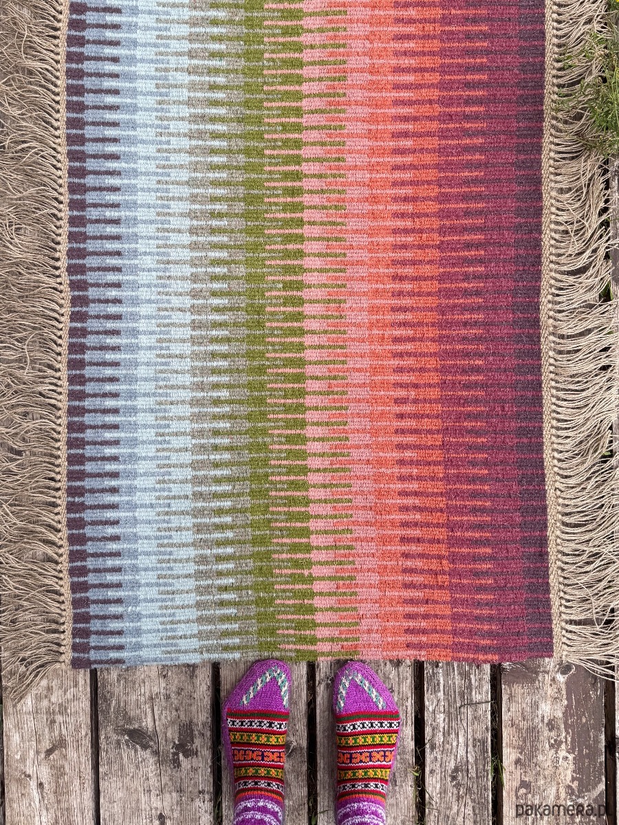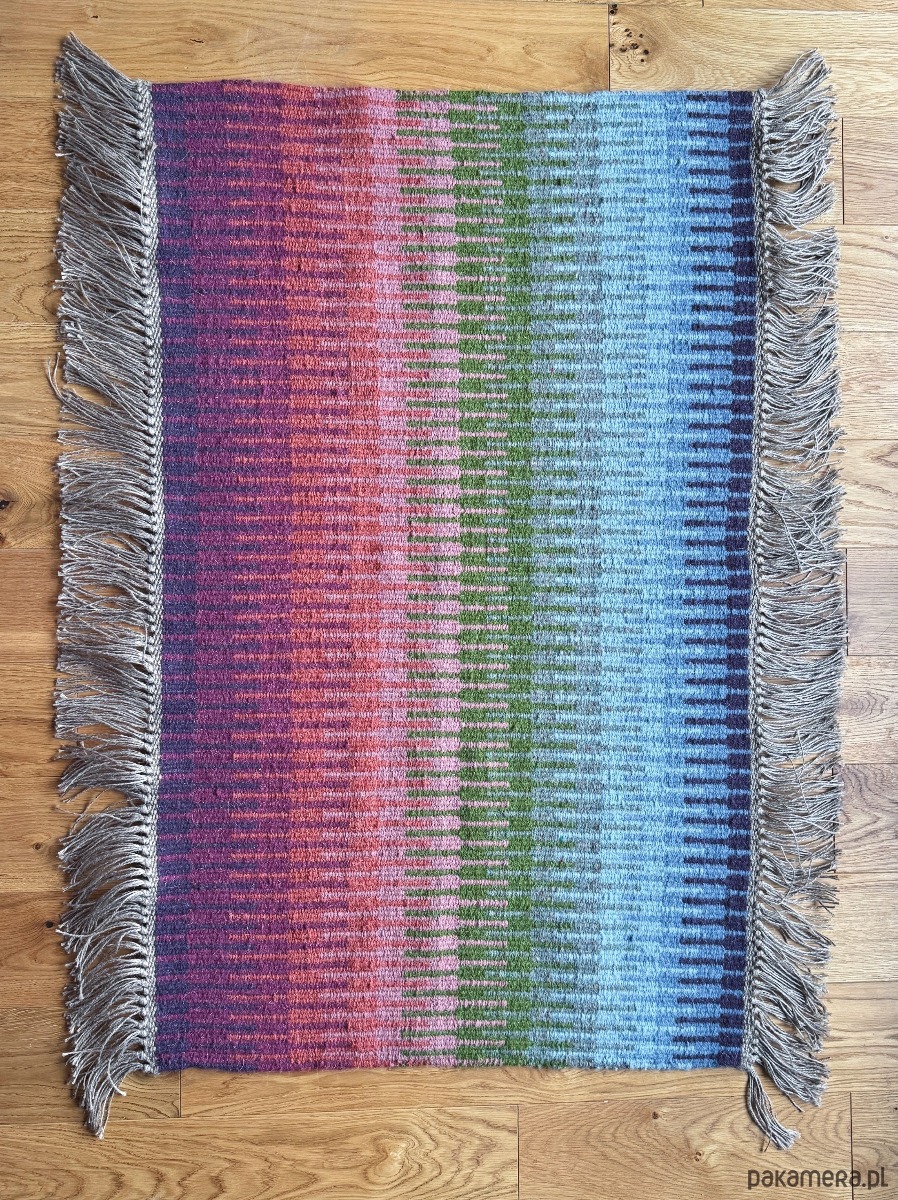 Używamy tradycyjnych technik - każdy element wykonany jest ręcznie. Dywan jest gruby i odporny. Został utkany tradycyjną norweską techniką - krokbragd. Może być używany również jako ozdoba ścienna / tkanina dekoracyjna.