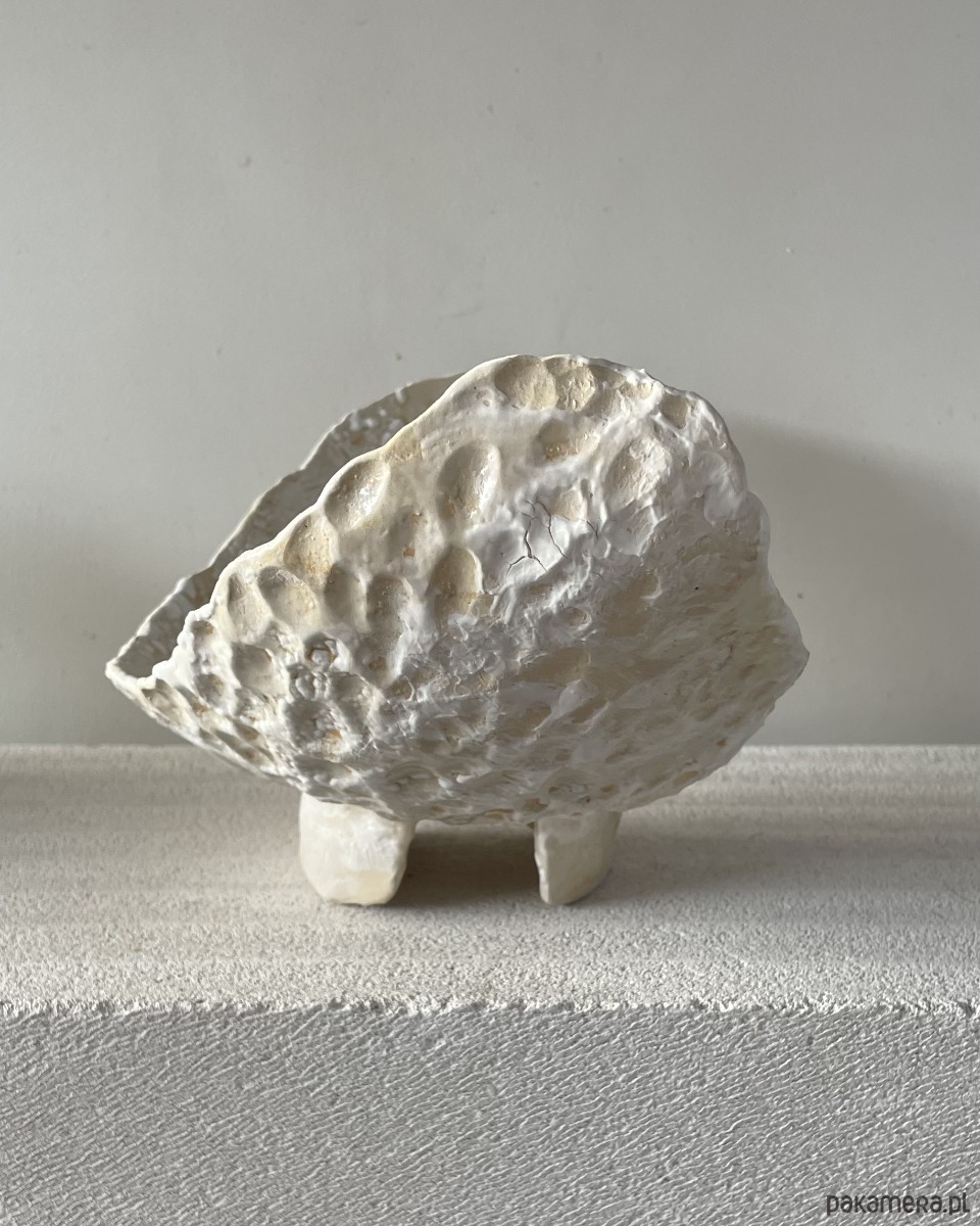 Forma jest asymetryczna, płynna, miękka w linii — balansująca pomiędzy rzeźbą a przedmiotem użytkowym.