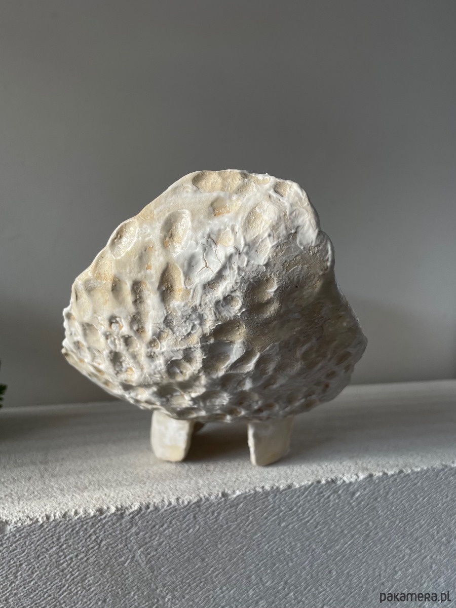 Kamionka została pokryta porcelanowym slipem, który tworzy subtelną, mlecznobiałą powierzchnię o naturalnej strukturze i delikatnych spękaniach. Tekstura jest żywa, nieregularna, organiczna — każda nierówność jest śladem procesu, ognia i transformacji materiału.