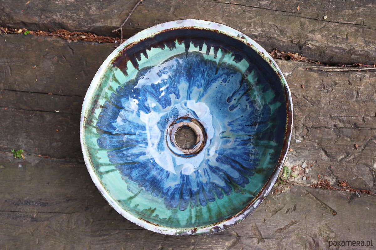 Wnętrze umywalki ozdobione jest dwoma warstwami szkliwa, tworząc nieprzewidywalne, fascynujące wzory w odcieniach granatu i turkusu.