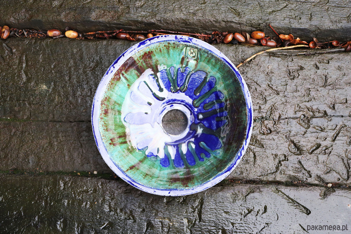 Wnętrze umywalki ozdobione jest dwoma warstwami szkliwa, tworząc nieprzewidywalne, fascynujące wzory w odcieniach granatu i turkusu.