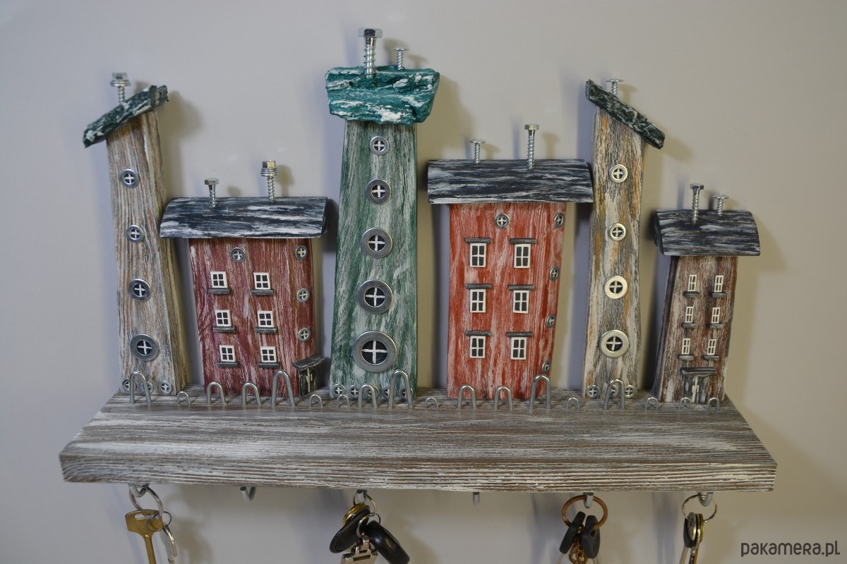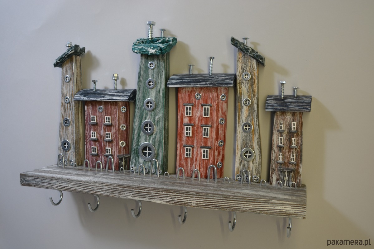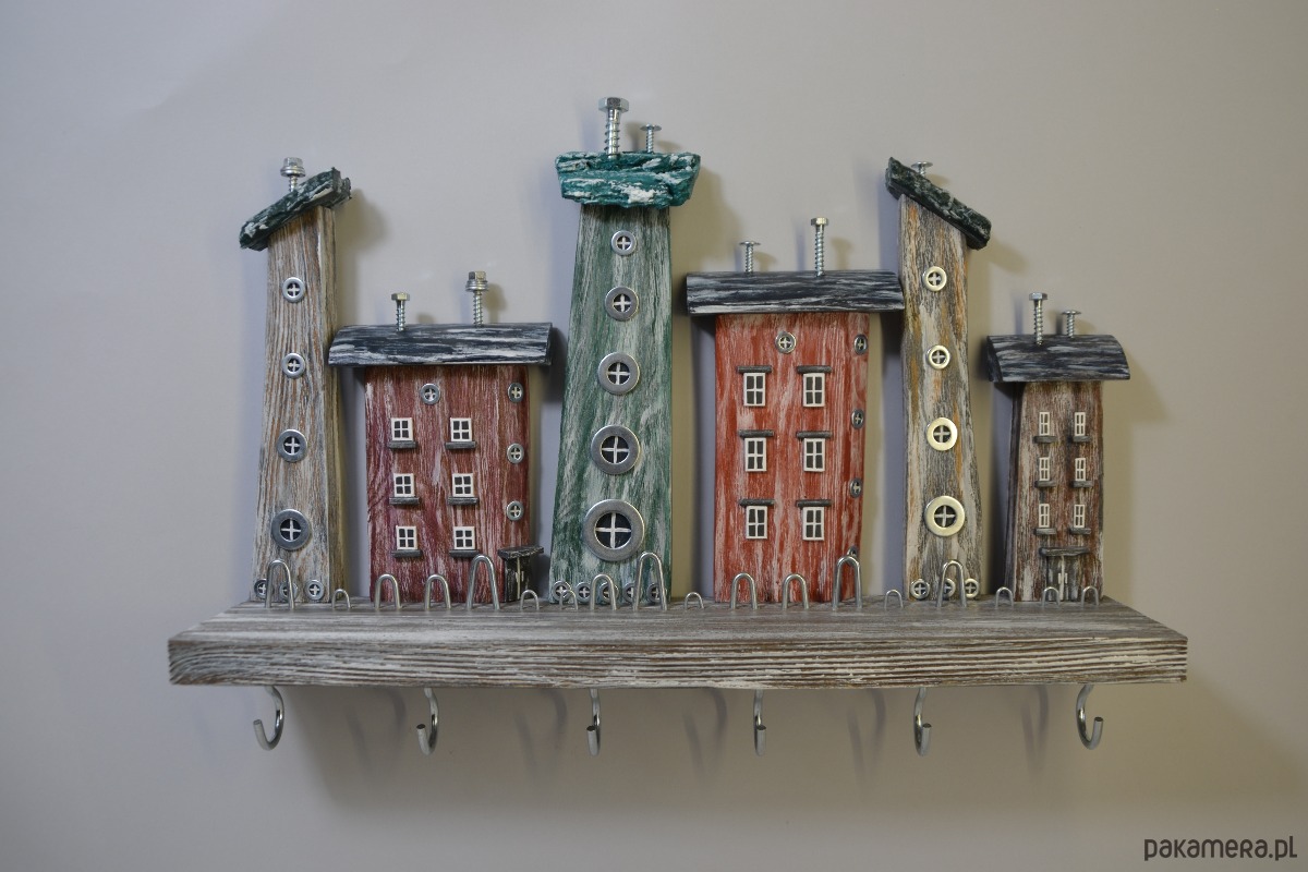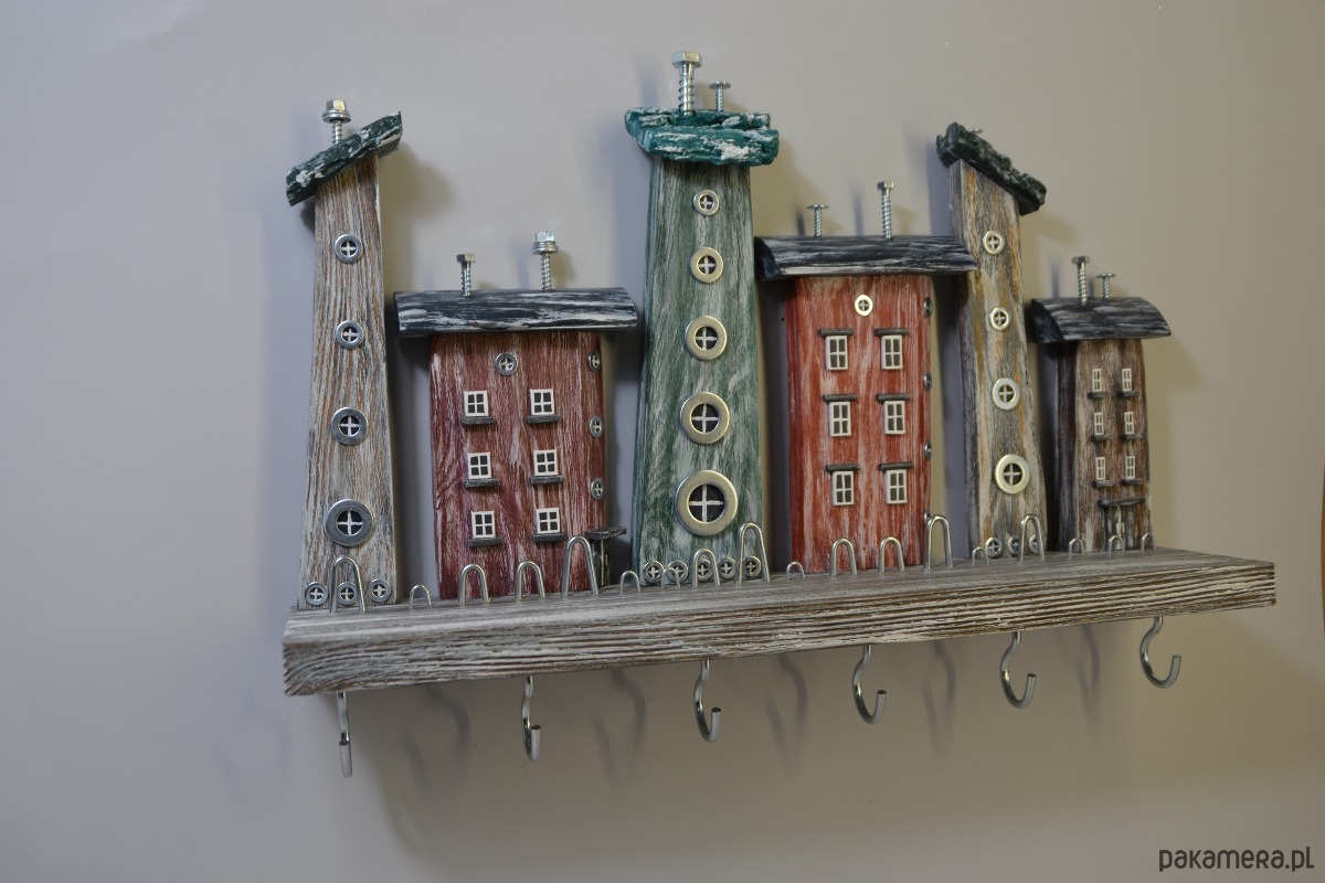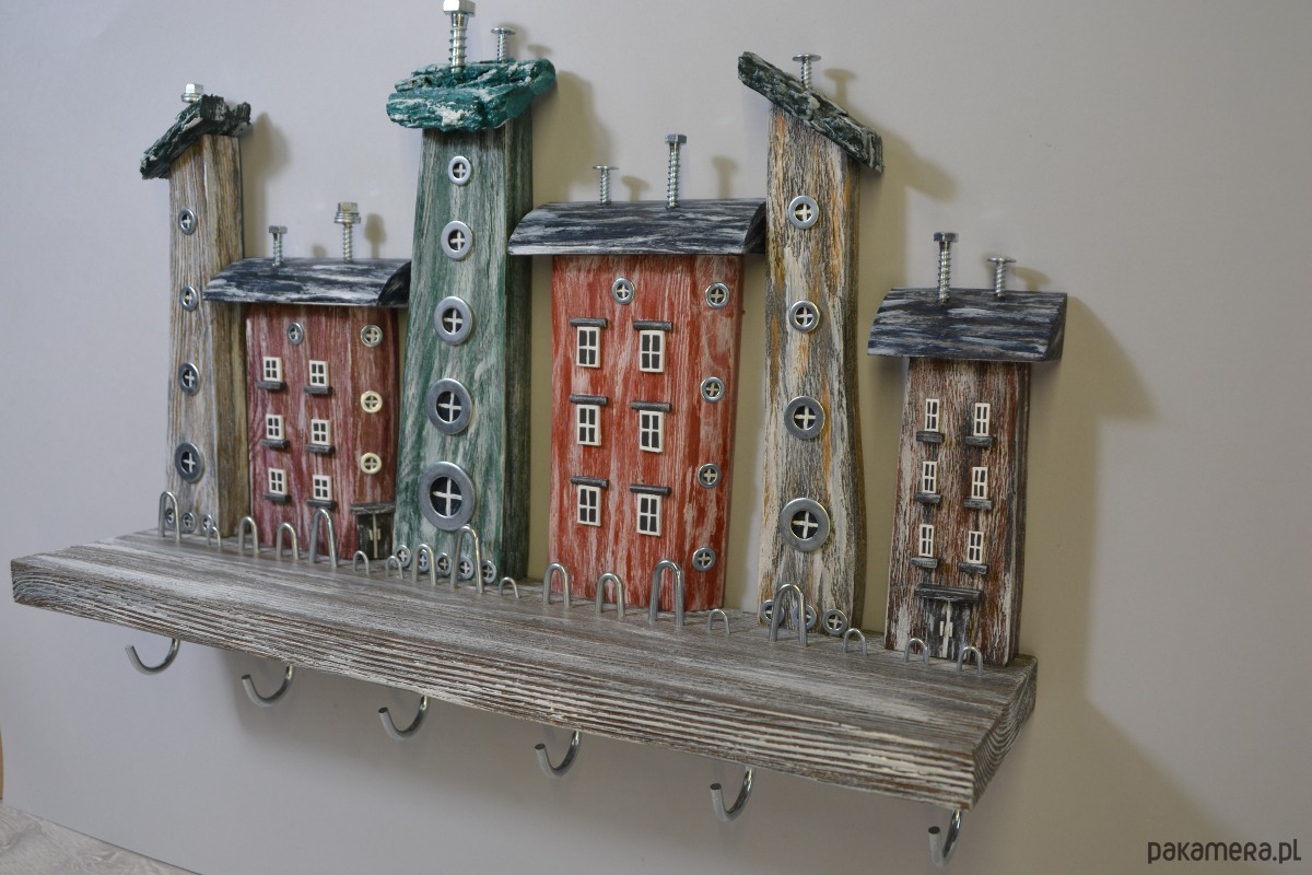 Ten ręcznie wykonany wieszak na klucze to wyjątkowe połączenie funkcjonalności i dekoracji. Kompozycja drewnianych domków w stylu rustykalnym nadaje wnętrzu ciepły, przytulny charakter i sprawia, że wieszak staje się nie tylko praktycznym organizerem, ale również ozdobą ściany.