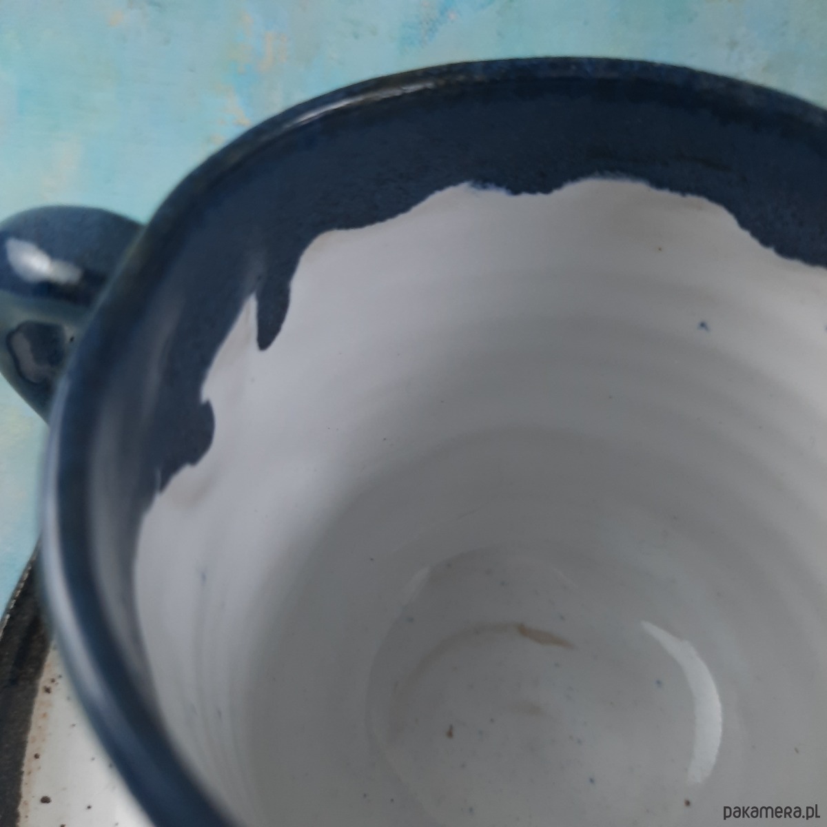 Unikalny zestaw kubek i talerzyk, stworzony ręcznie przez polskiego ceramika. Każdy egzemplarz to indywidualne dzieło, wykonane z pasją i dbałością o szczegóły.
