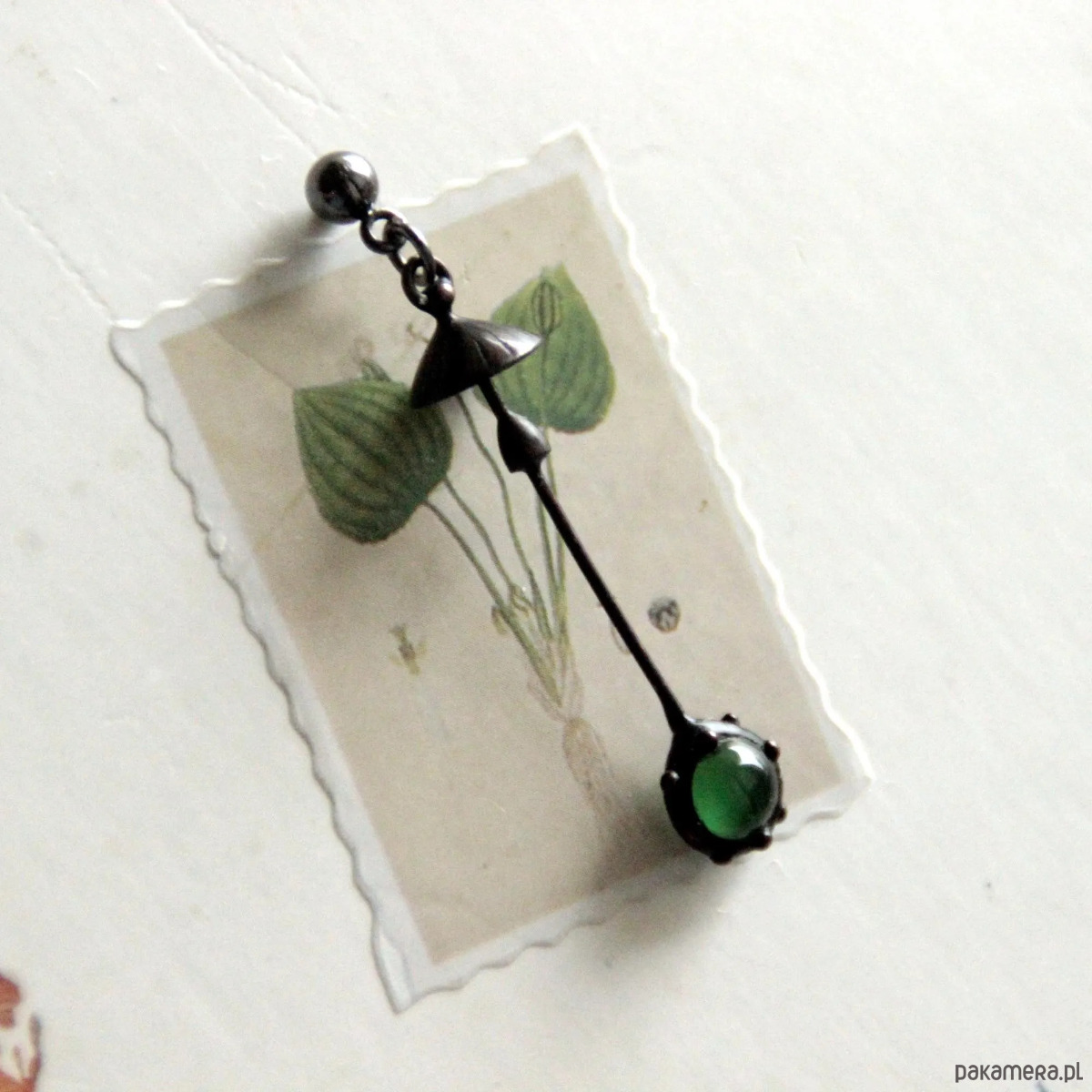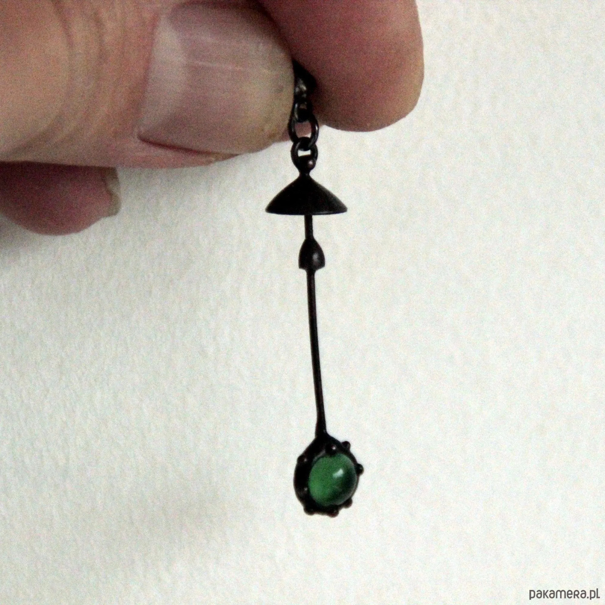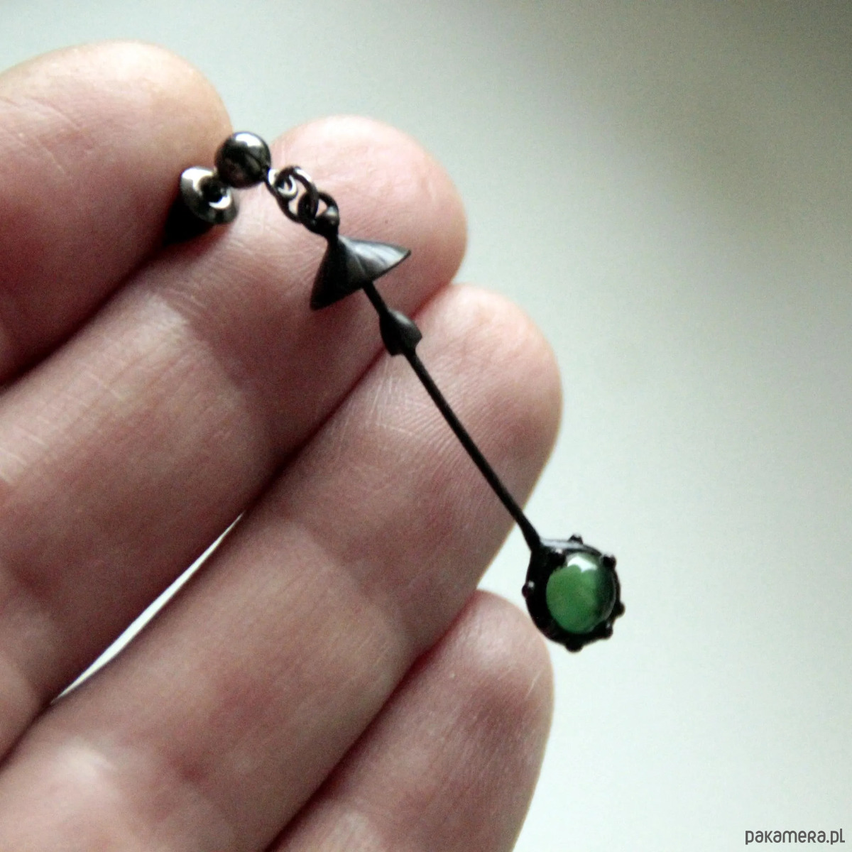 Ręcznie wykonany pojedynczy kolczyk w kształcie magicznego grzyba leśnego, wykonany z miedzi, cyny, stali i zielonego szkła. Pokryta patyną i pokryta środkiem przeciwutleniającym, szlifowana, polerowana. Lekka i wytrzymała kolczyka w kształcie muchomora. Wszystkie elementy są wykonane ręcznie, co zapewnia indywidualność każdego produktu wytworzonego w warsztacie Yadovito. Stop miedzi pokryty jest czarną patyną, aby nadać metalowi czarny kolor, wypolerowany roztworem wykończeniowym, aby nadać biżuterii szlachetny wygląd, a jednocześnie zapobiec utlenianiu się metalu. Rozmiar około 4,5/1 cm. Kolor czarny/zielony.