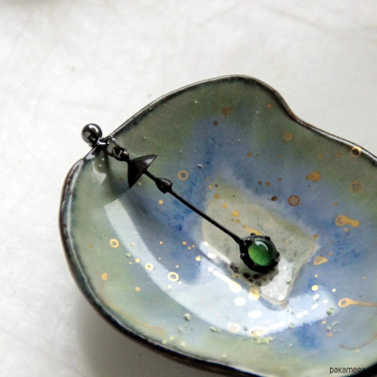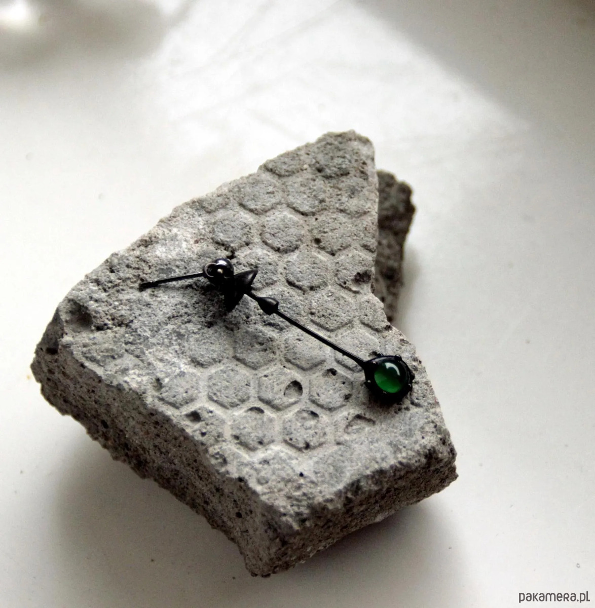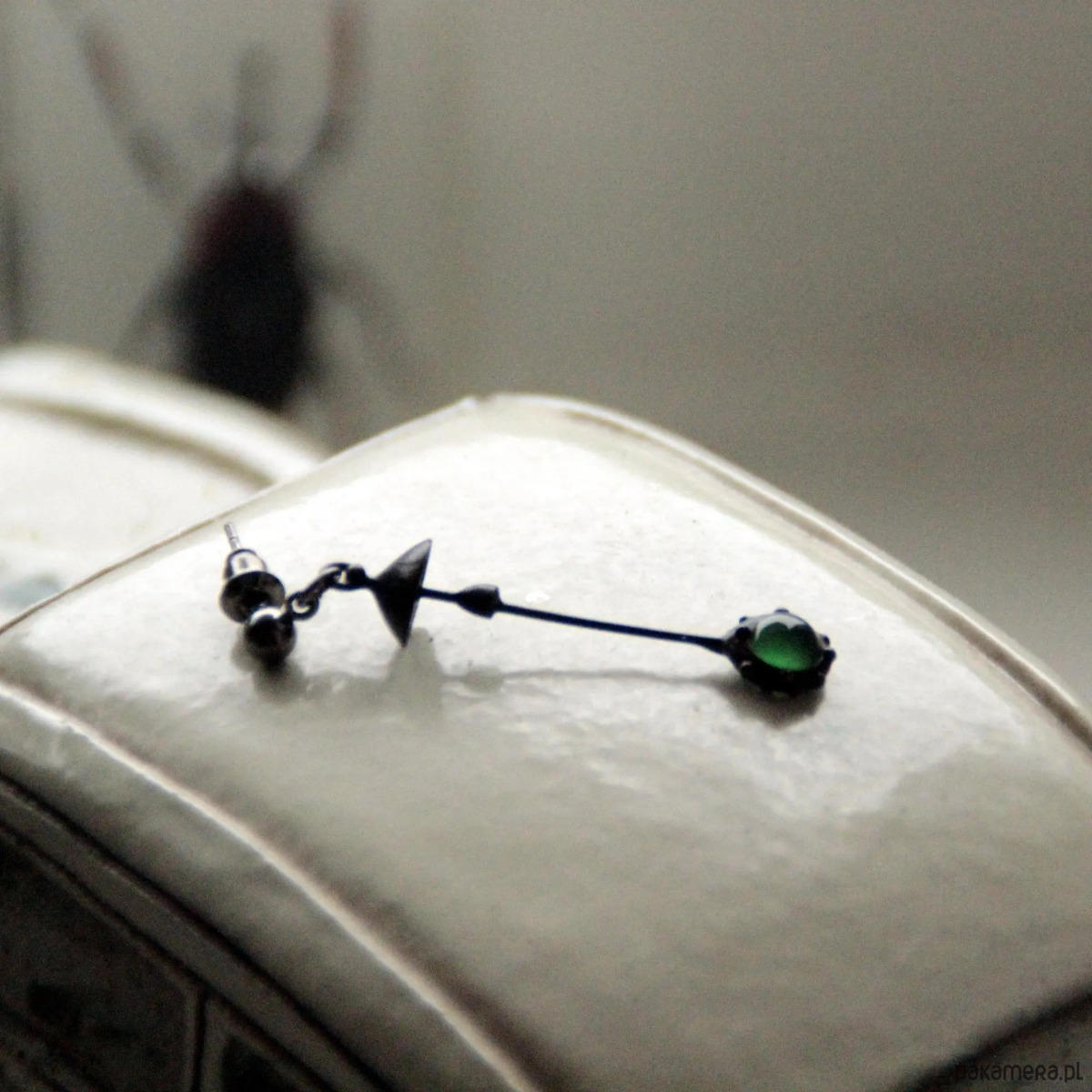 Ręcznie wykonany pojedynczy kolczyk w kształcie magicznego grzyba leśnego, wykonany z miedzi, cyny, stali i zielonego szkła. Pokryta patyną i pokryta środkiem przeciwutleniającym, szlifowana, polerowana. Lekka i wytrzymała kolczyka w kształcie muchomora. Wszystkie elementy są wykonane ręcznie, co zapewnia indywidualność każdego produktu wytworzonego w warsztacie Yadovito. Stop miedzi pokryty jest czarną patyną, aby nadać metalowi czarny kolor, wypolerowany roztworem wykończeniowym, aby nadać biżuterii szlachetny wygląd, a jednocześnie zapobiec utlenianiu się metalu. Rozmiar około 4,5/1 cm. Kolor czarny/zielony.