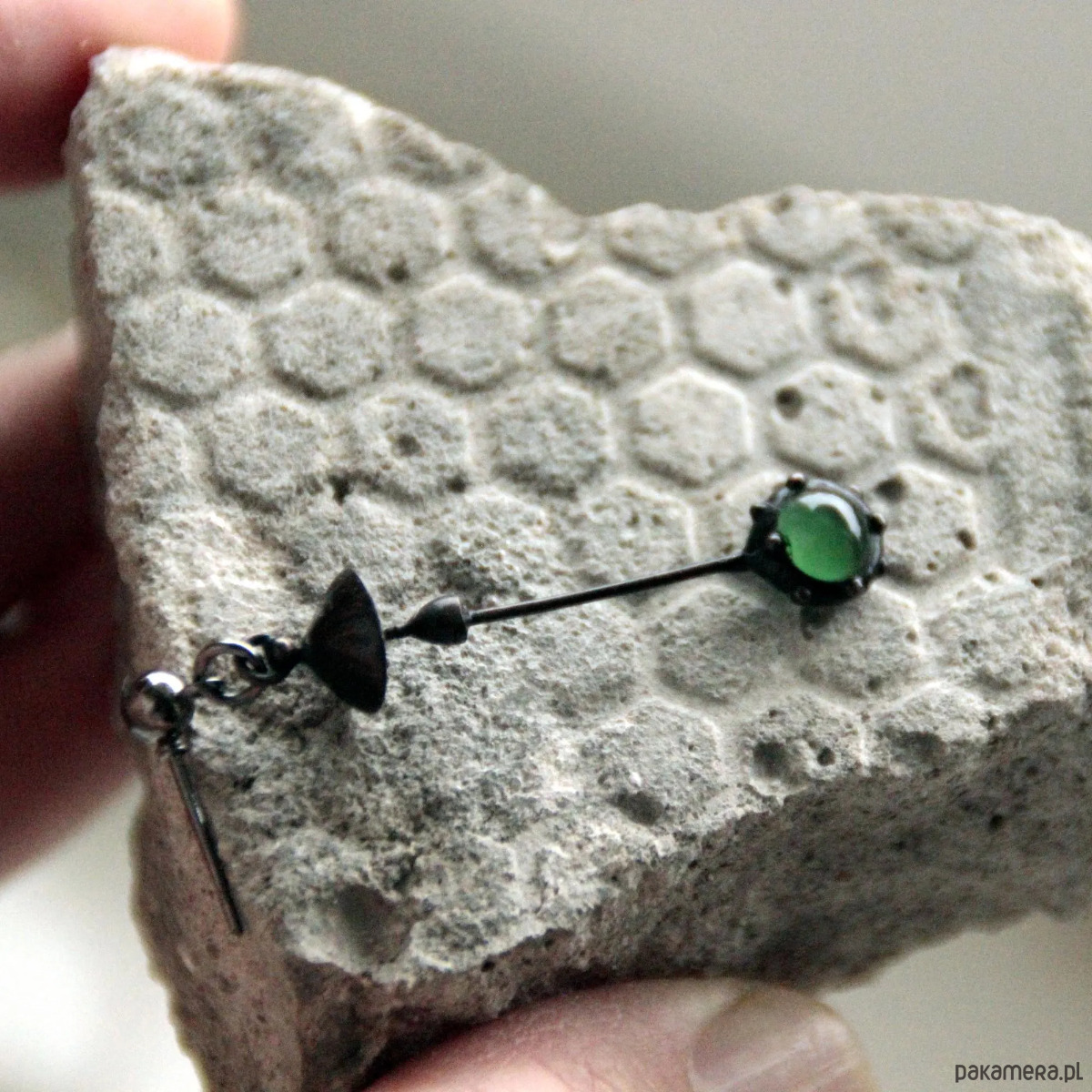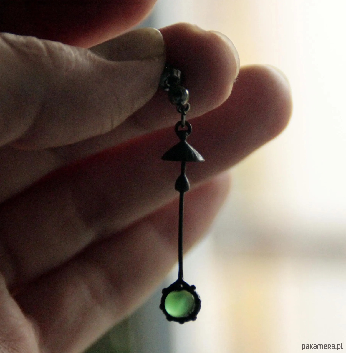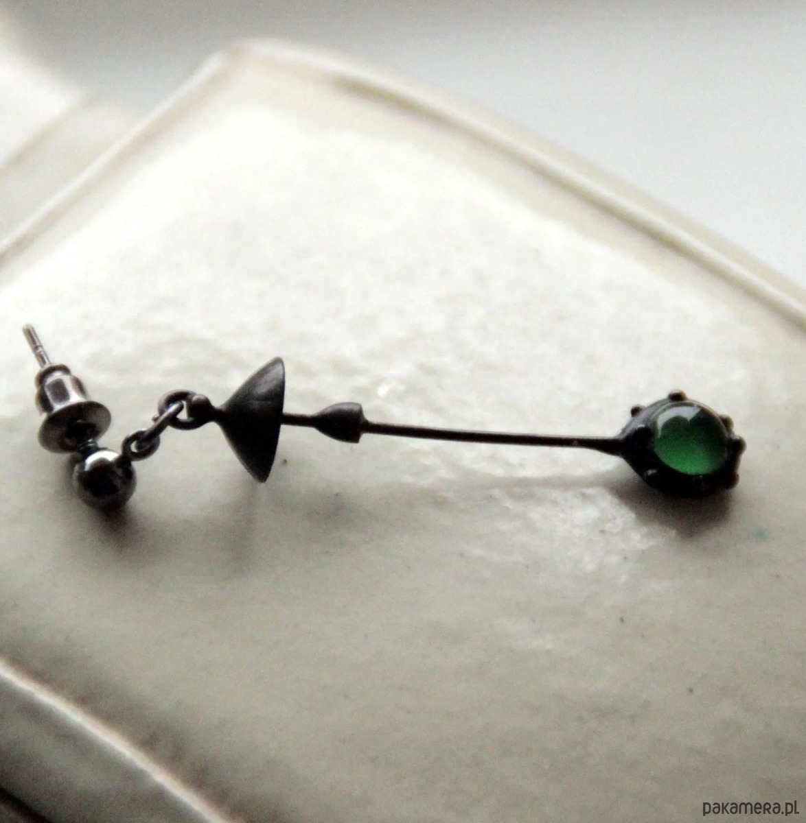 Ręcznie wykonany pojedynczy kolczyk w kształcie grzyba z zielonym szkłem