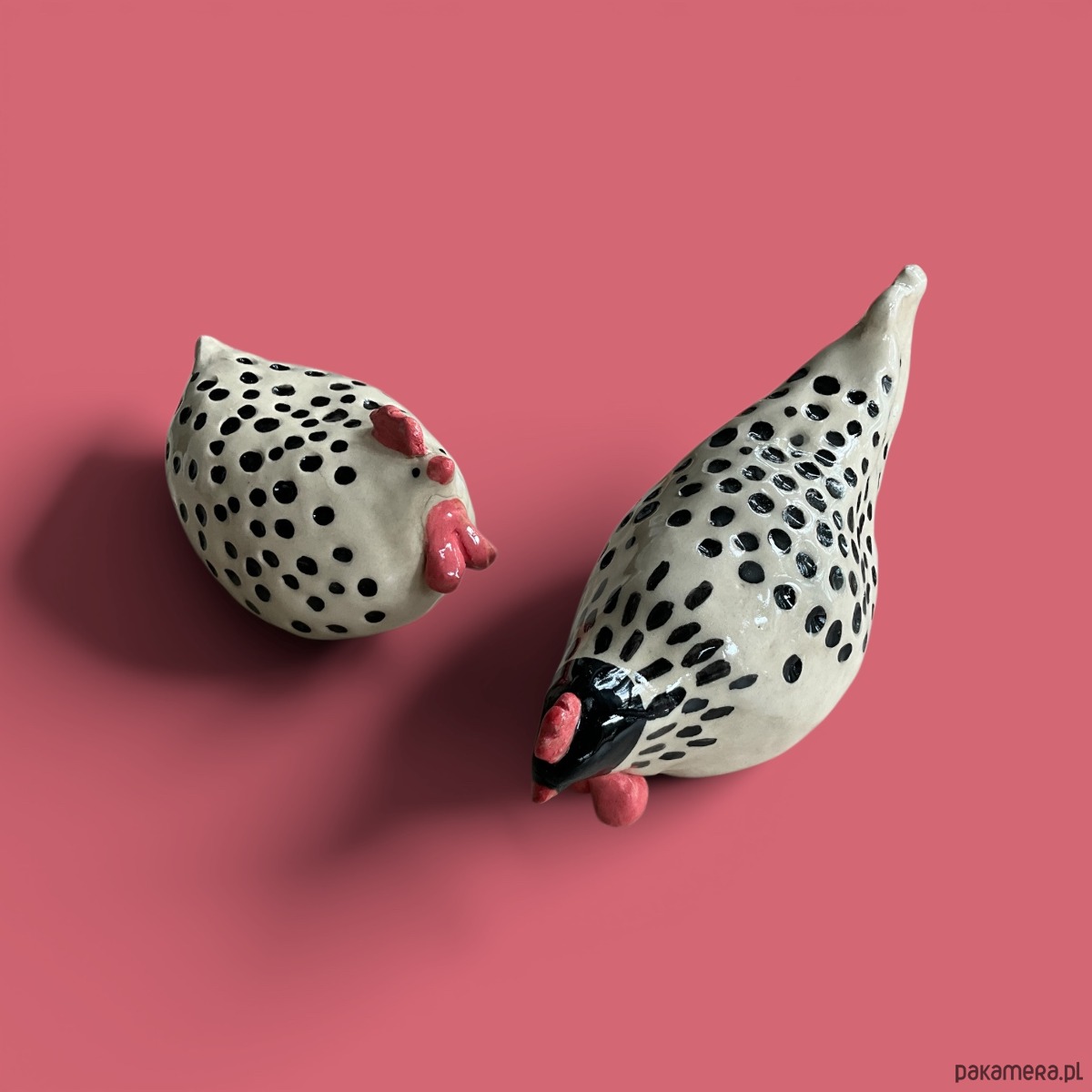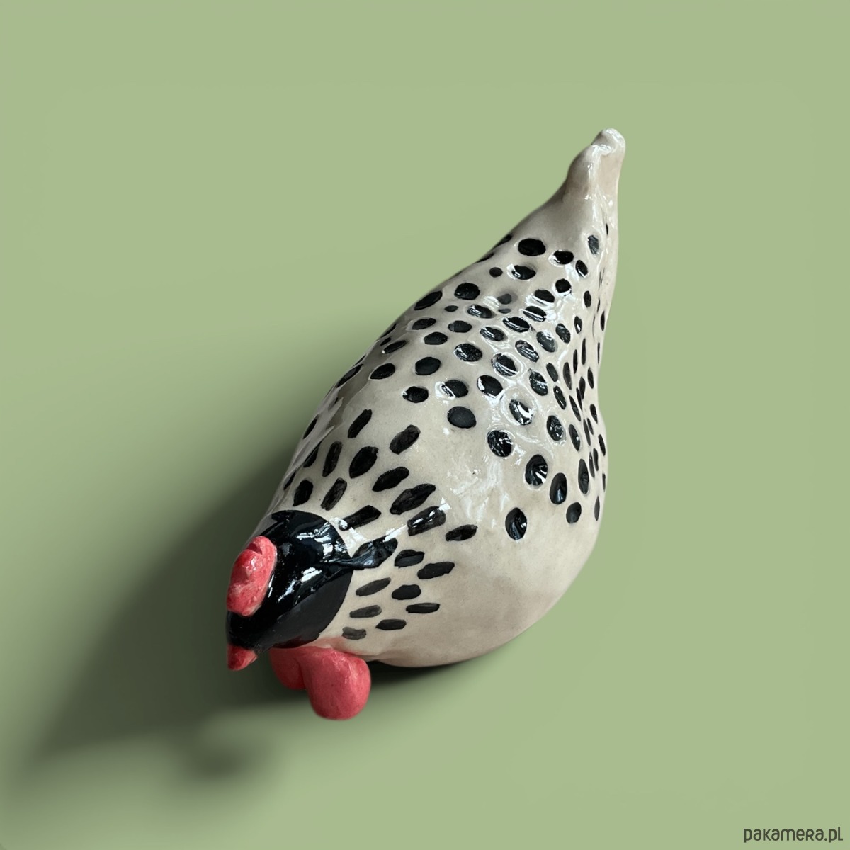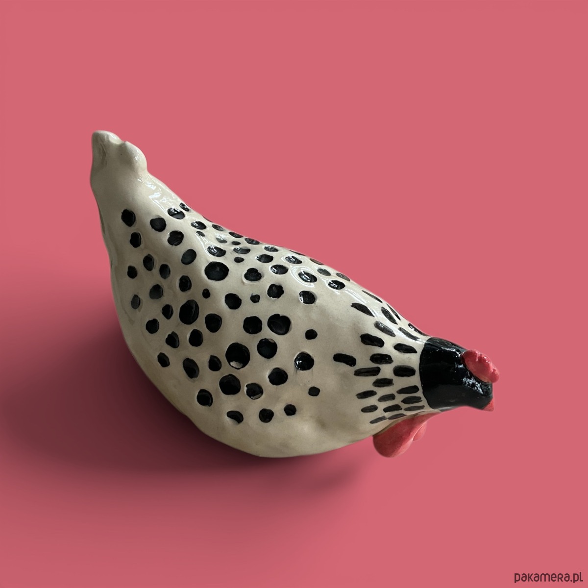 Każdy egzemplarz jest unikatowy – ręczne modelowanie oraz malowanie sprawiają, że nie ma dwóch identycznych sztuk. Charakterystyczne czarne kropki i kontrastowe detale nadają jej wyrazisty, ale wciąż lekki i dekoracyjny charakter.
