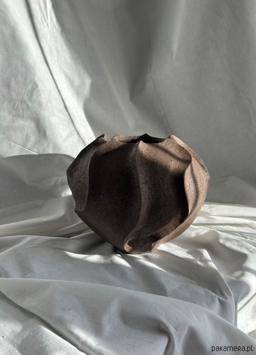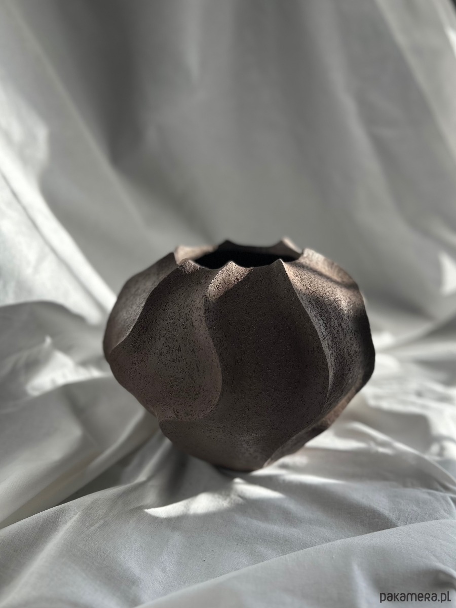 Ten wyjątkowy wazon ceramiczny powstaje ręcznie przy użyciu techniki wałeczkowej (coil-building), a następnie jest rzeźbiony bez użycia form i koła garncarskiego. Każdy egzemplarz tworzony jest w całości ręcznie, co nadaje mu organiczny, rzeźbiarski charakter oraz naturalną nieregularność.