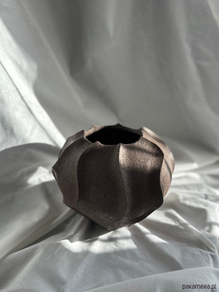 Zewnętrzna powierzchnia wazonu jest surowa, matowa i rzeźbiona, co podkreśla organiczność formy. Wnętrze zostało pokryte szkliwem, dzięki czemu wazon jest w pełni funkcjonalny i przystosowany do przechowywania wody. Może służyć jako naczynie na świeże lub suszone kwiaty, a także jako samodzielny obiekt rzeźbiarski.