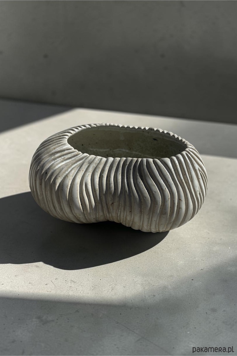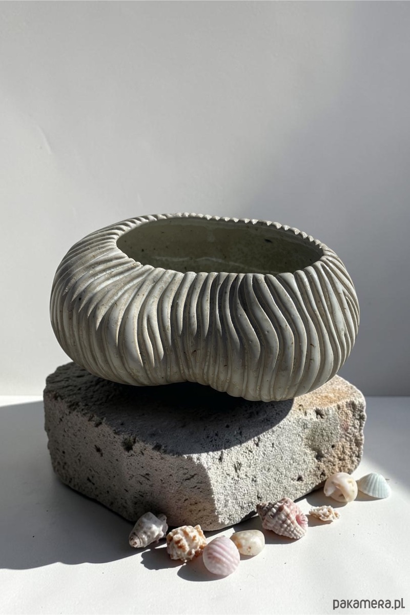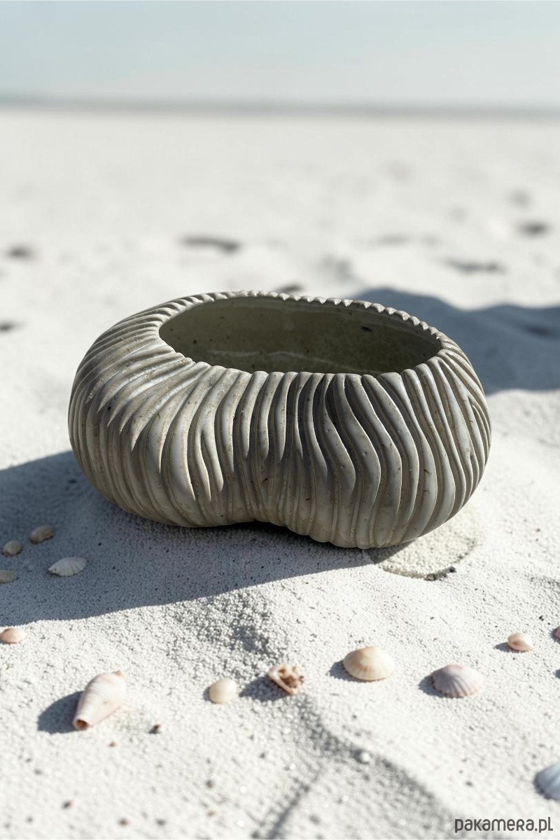 Rzeźbiarska forma łączy się z funkcjonalnością. Nieregularny wzór, przypominający muszle morskie, odbija światło i tworzy delikatną grę cieni. Organiczny kształt i naturalne, lekko surowe wykończenie sprawiają, że idealnie pasuje do minimalistycznych i japońskich wnętrz. Piękny zarówno solo, jak i z pojedynczą gałązką lub delikatnym bukietem.