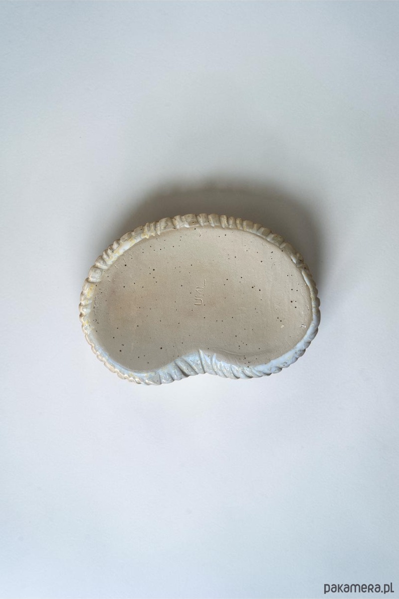 Wykonany z jasnej gliny w brązowe kropki. Zewnętrzna strona pokryta jest lśniącą białą glazurą z drobnymi beżowymi drobinkami. Wewnątrz szkliwo nawiązuje do koloru masy perłowej, z mieniącymi się drobinkami w odcieniach szarości i beżu.