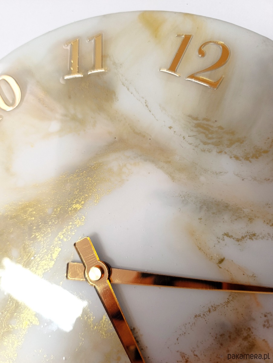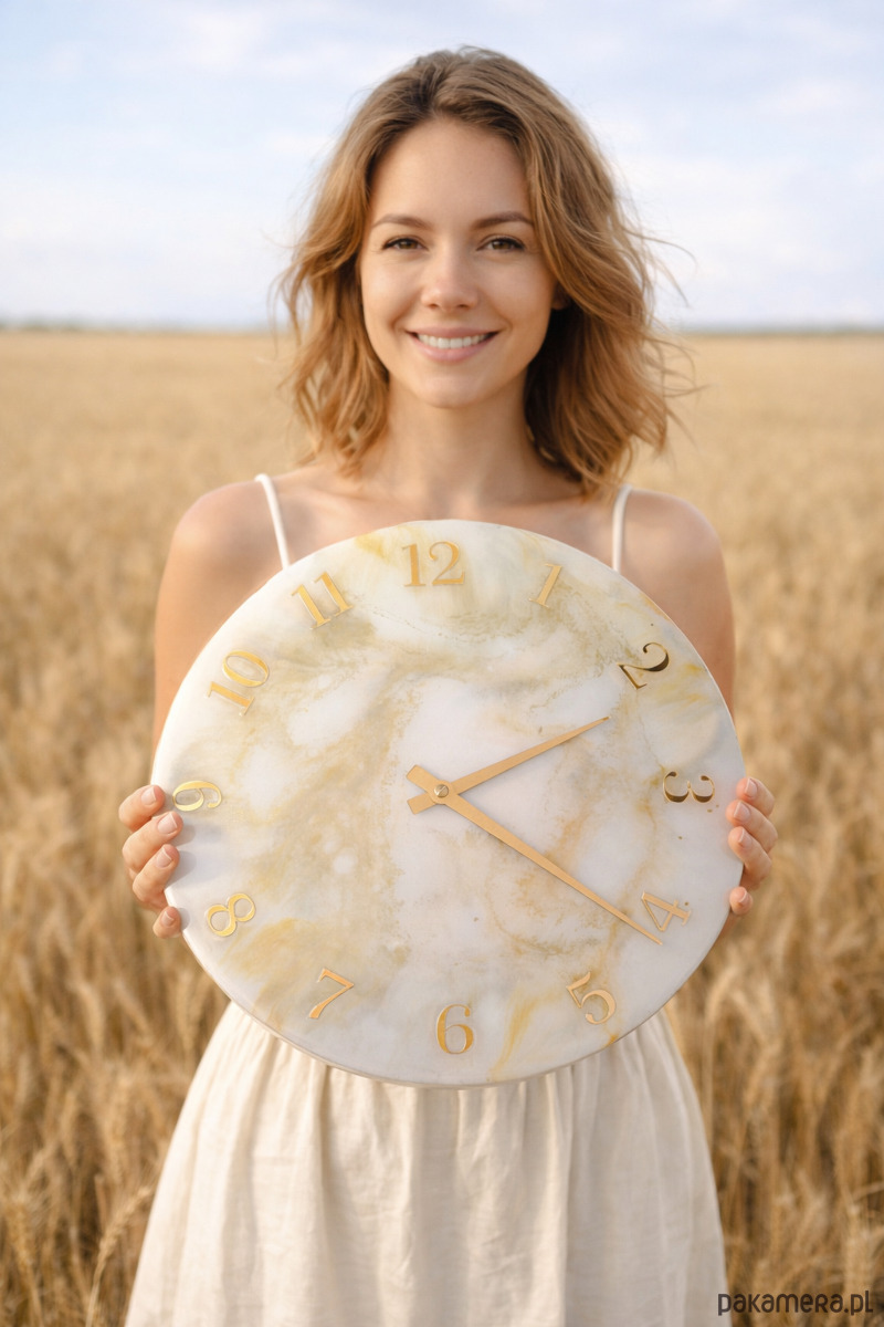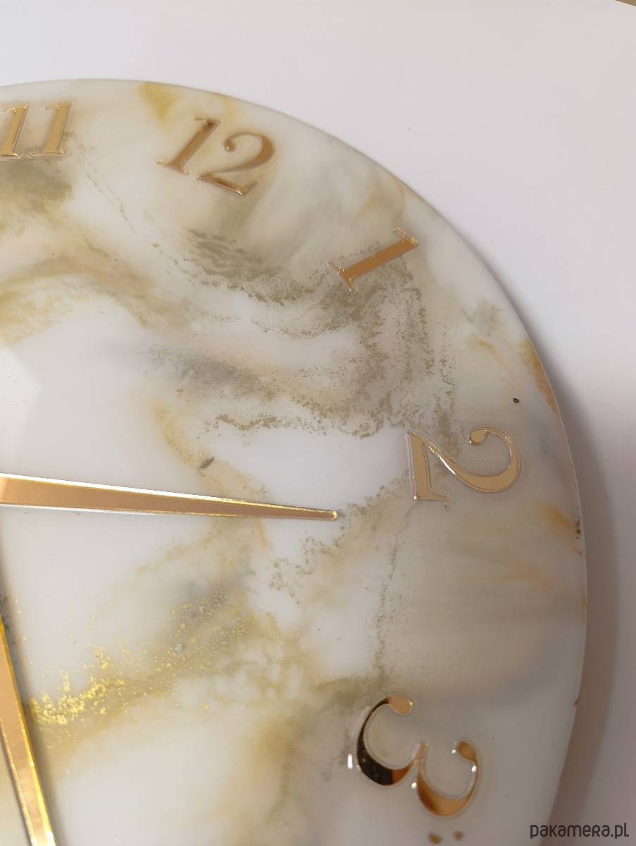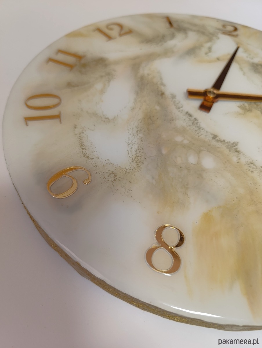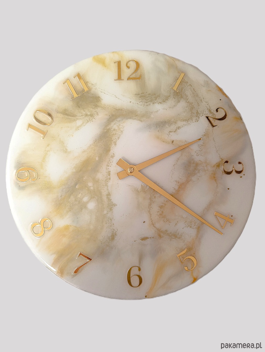 Stylowy, nowoczesny zegar ścienny wykonany ręcznie z wysokiej jakości żywicy epoksydowej. Delikatny, marmurkowy wzór w odcieniach bieli, kremu i subtelnego brązu tworzy elegancką kompozycję, która doskonale wpasuje się w każde wnętrze – od klasycznego po minimalistyczne.