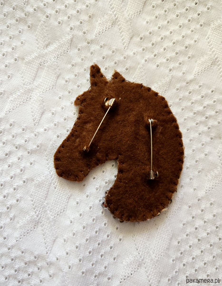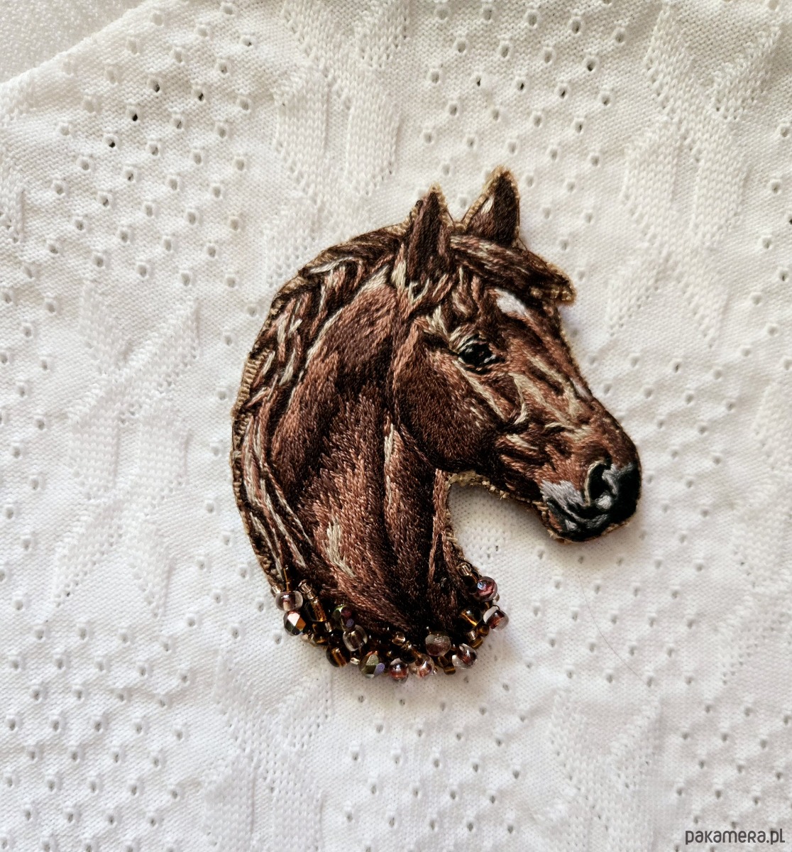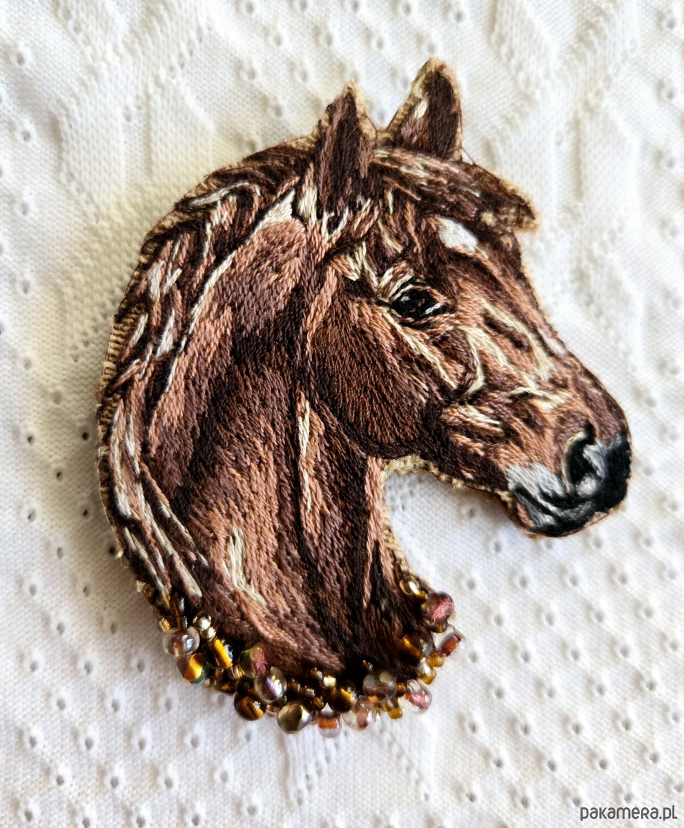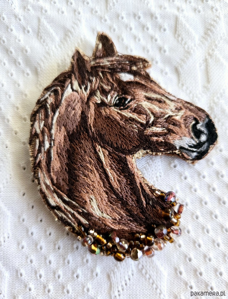 Ręcznie wyszywana broszka przedstawiająca głowę konia.Dół ozdoby został wykończony dekoracyjnymi koralikami, które dodają jej elegancji i niepowtarzalnego charakteru.