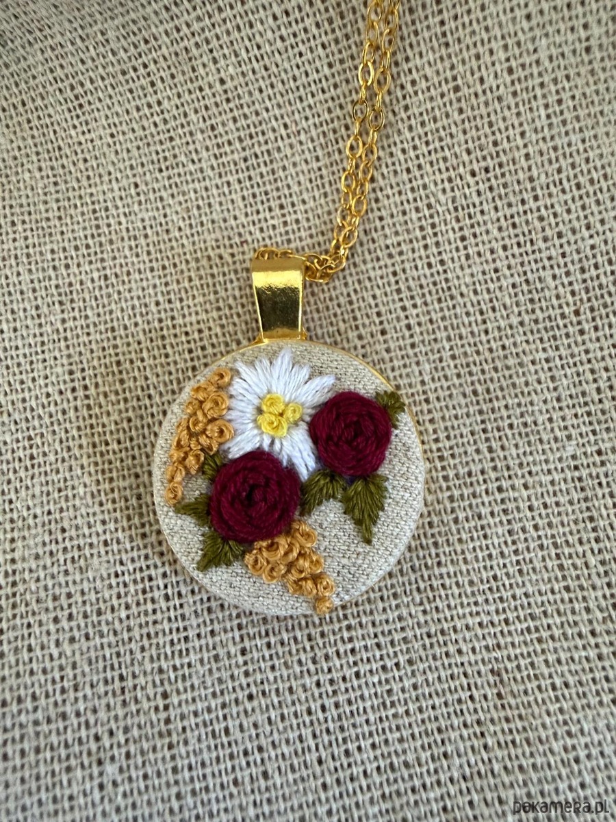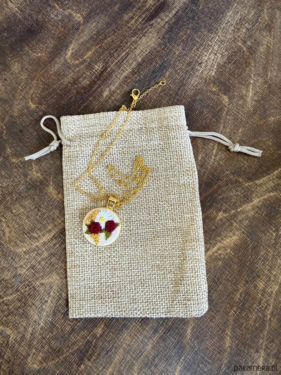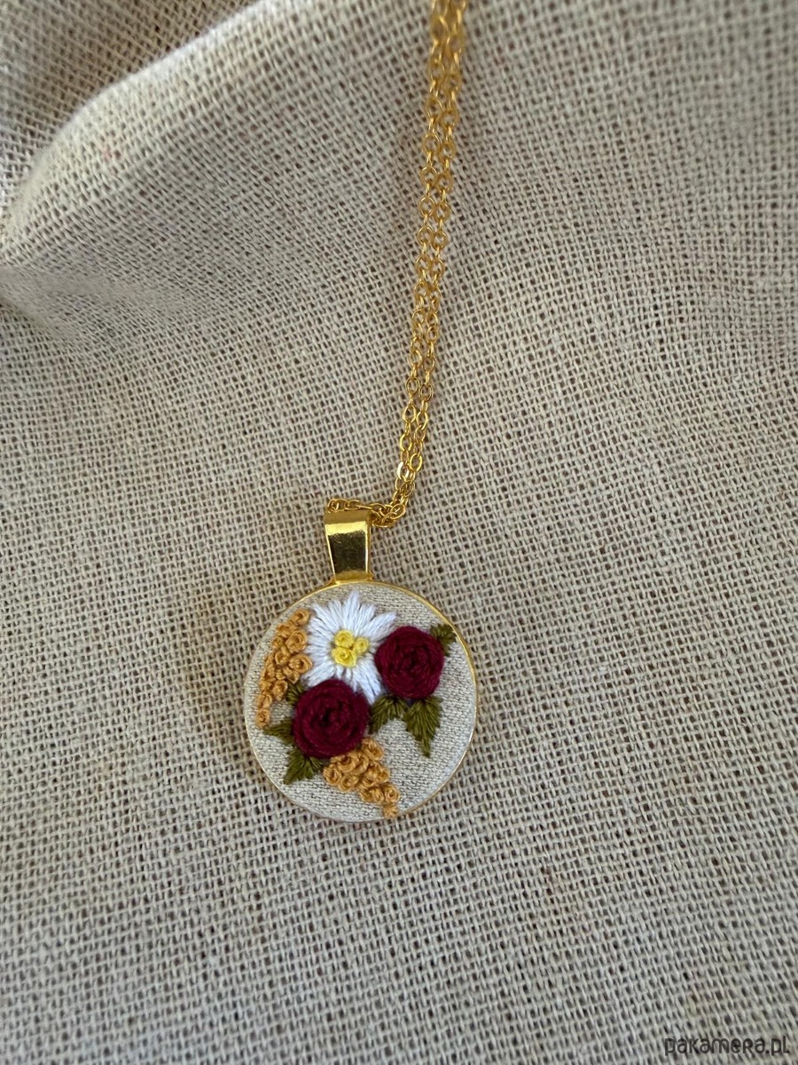 Poszukujesz nietuzinkowej biżuterii lub wyjątkowego prezentu dla żony, mamy, córki, babci, przyjaciółki ? Ten ręcznie wyszywany naszyjnik będzie idealnym wyborem ! Każdy naszyjnik wykonywany jest w pojedynczym egzemplarzu, dzięki czemu masz pewność, że nikt nie będzie posiadał takiego samego ! Haft wykonany na materiale bawełnianym w kolorze beżowym, wyszywany muliną bawełniana w pięknych kolorach. Medalion ze stali w kolorze złota, długi łańcuszek w tym samym kolorze.