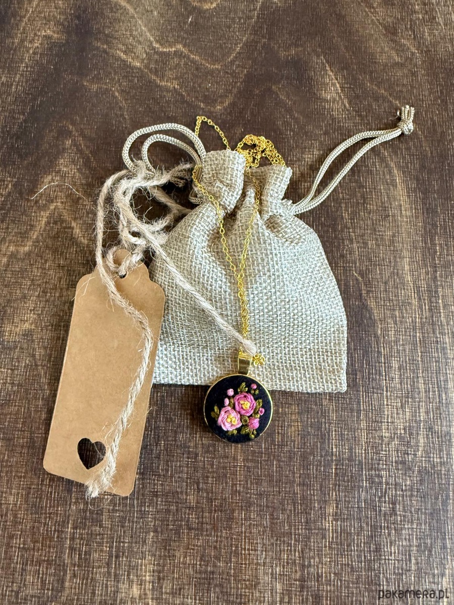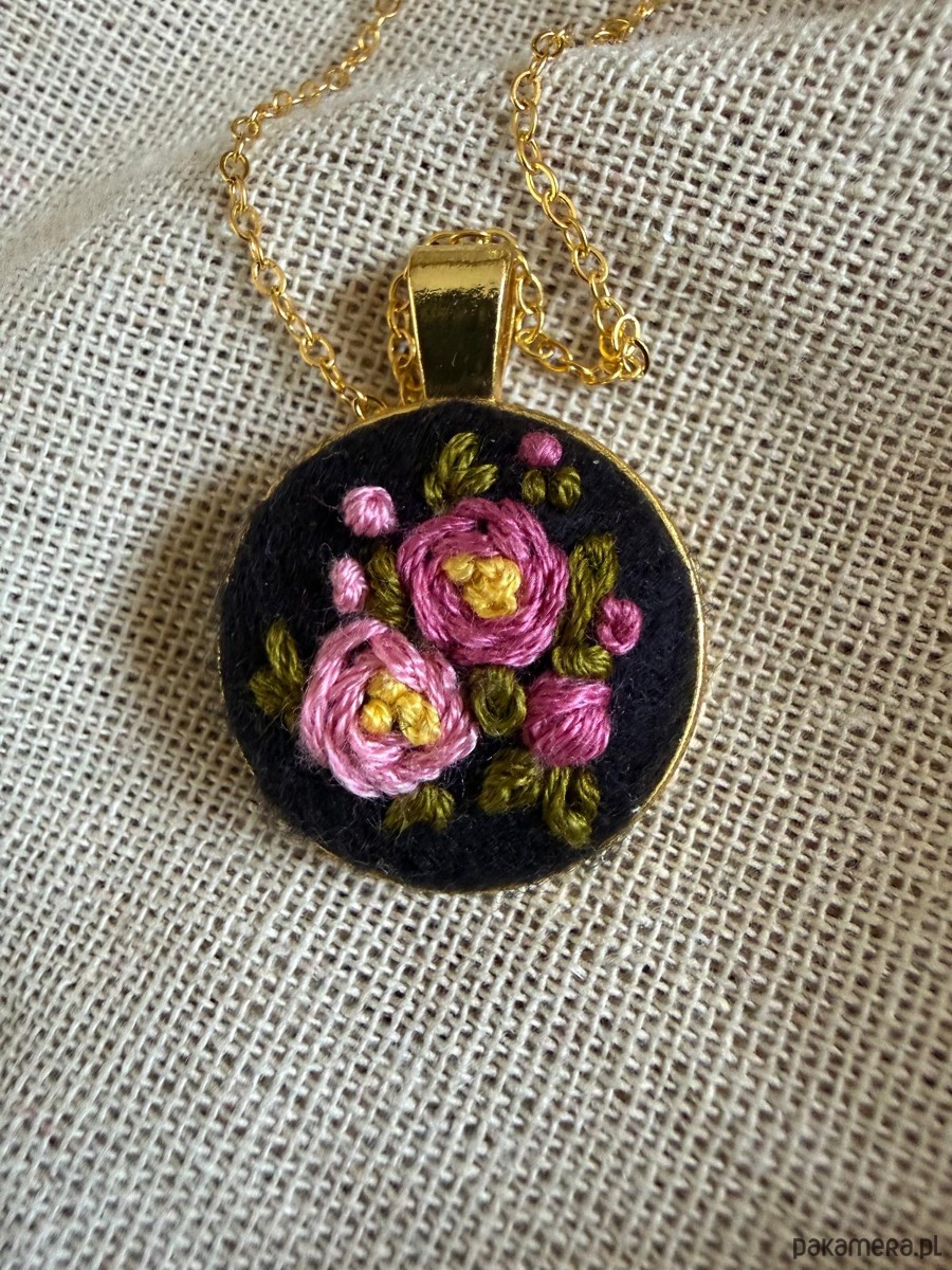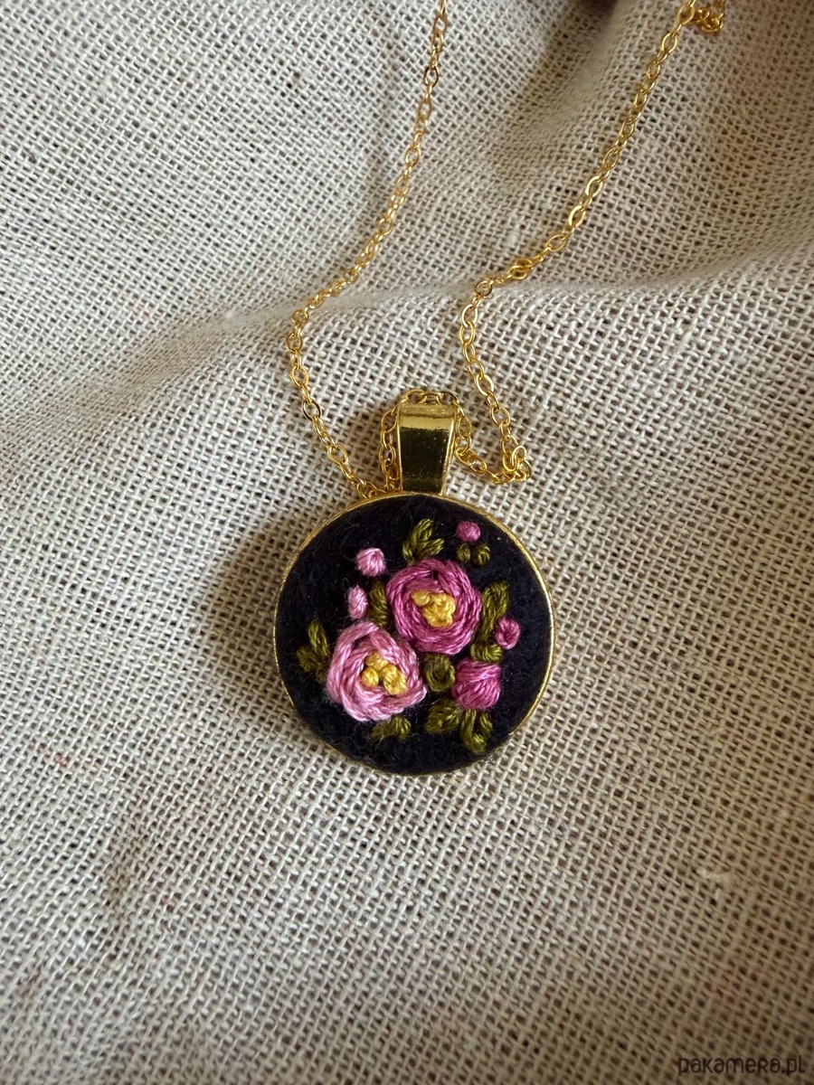 Poszukujesz nietuzinkowej biżuterii lub wyjątkowego prezentu dla żony, mamy, córki, babci, przyjaciółki ? Ten ręcznie wyszywany naszyjnik będzie idealnym wyborem ! Każdy naszyjnik wykonywany jest w pojedynczym egzemplarzu, dzięki czemu masz pewność, że nikt nie będzie posiadał takiego samego ! Haft wykonany na filcu w kolorze czarnym, wyszywany muliną bawełniana w pięknych kolorach. Medalion ze stali w kolorze złota, długi łańcuszek w tym samym kolorze.