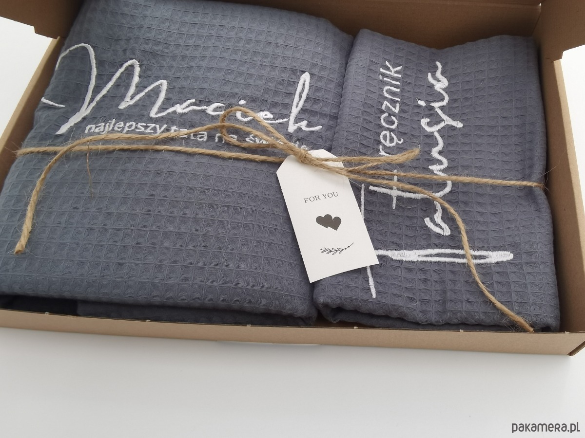 Personalizowany ręcznik to także doskonały pomysł na wyjątkowy i praktyczny prezent na różne okazje. Polecamy go w zestawie z dużym ręcznikiem kąpielowym, lub /i z turbanem do włosów, z myjką do ciała.