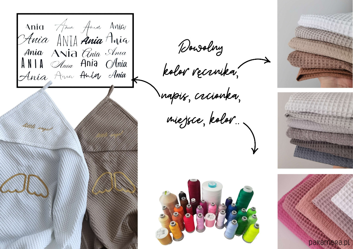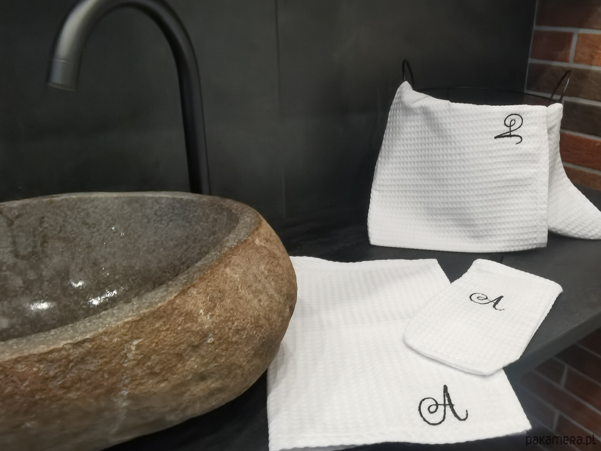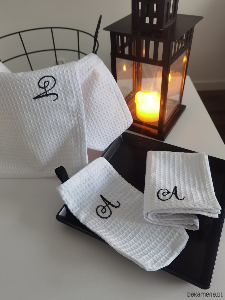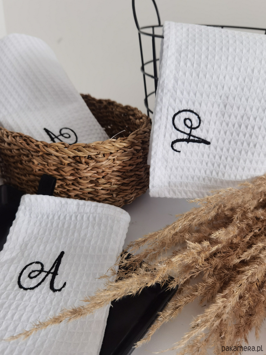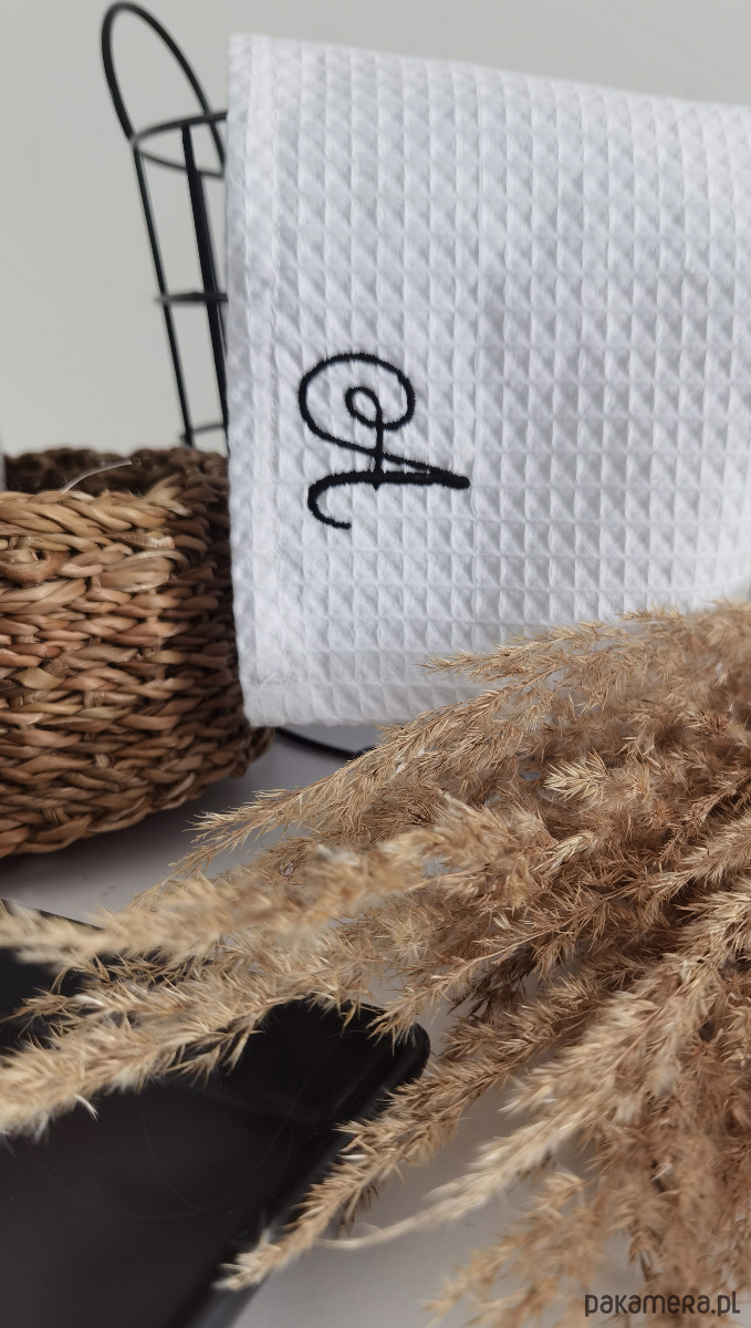 Ręcznik do rąk. Niezbędny element w każdym domu. Nasz ręcznik wykonany jest z naturalnej grubej tkaniny o ciekawej fakturze - wafla bawełnianego. Kolor ręcznika do uzgodnienia. Na ręczniku haftujemy dowolny krótki napis, obrazek, logo pensjonatu. Mogą być to zarówno inicjały jak i imię, lub np. home sweet home, mamy siebie mamy wszystko, ręcznik dla gości, ręcznik najlepszego taty na świecie itp. Napis przygotowujemy w kilku wersjach do wyboru. Wymiary ręcznika: 60x40cm