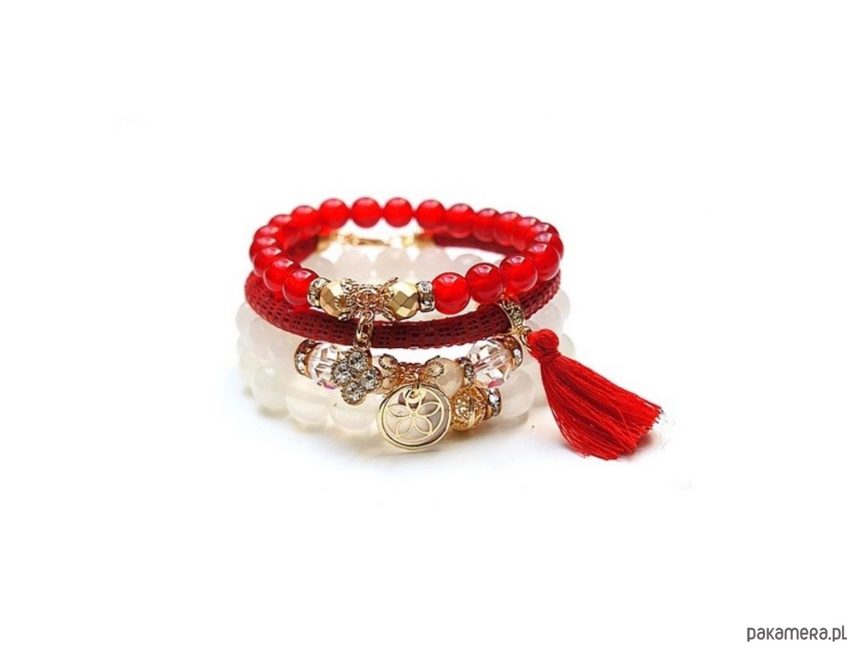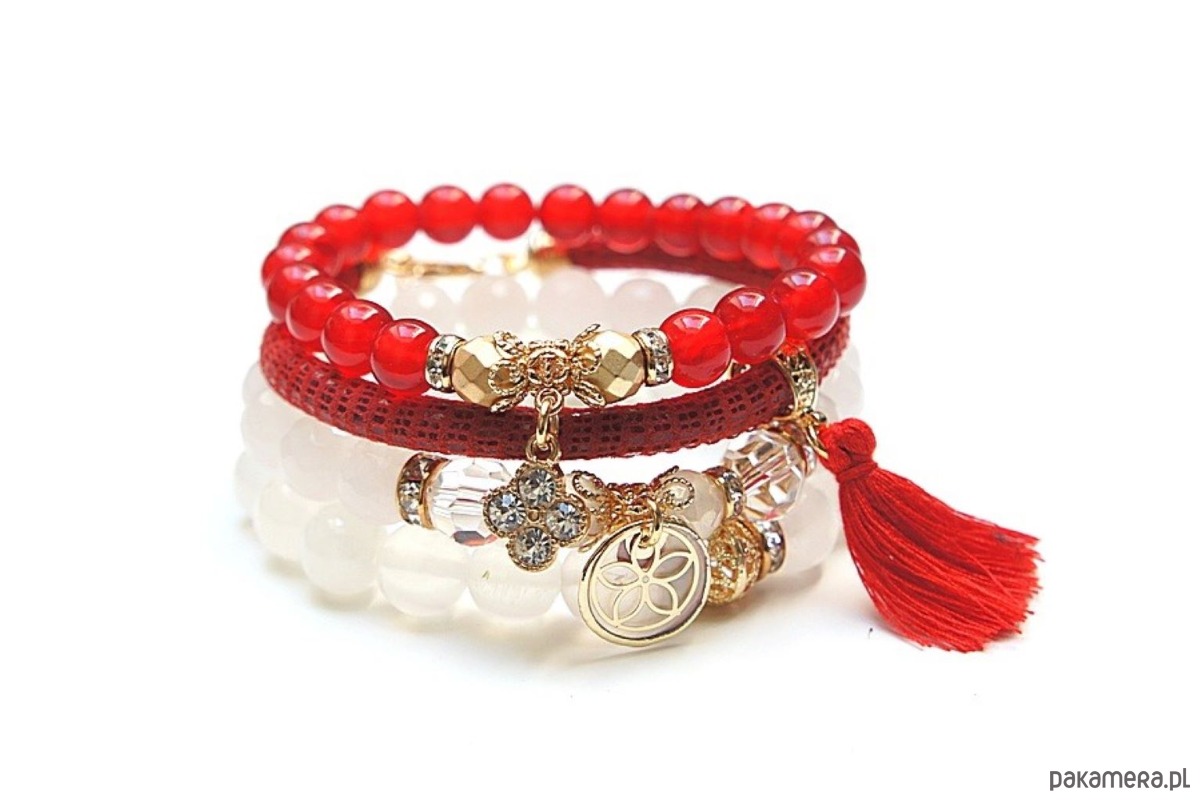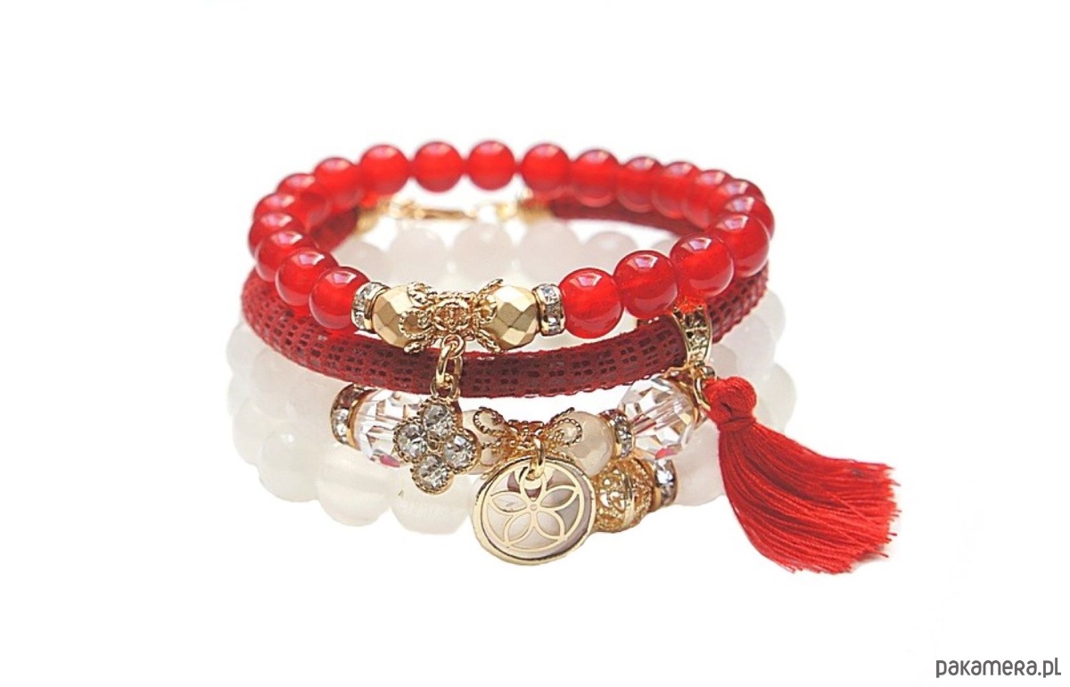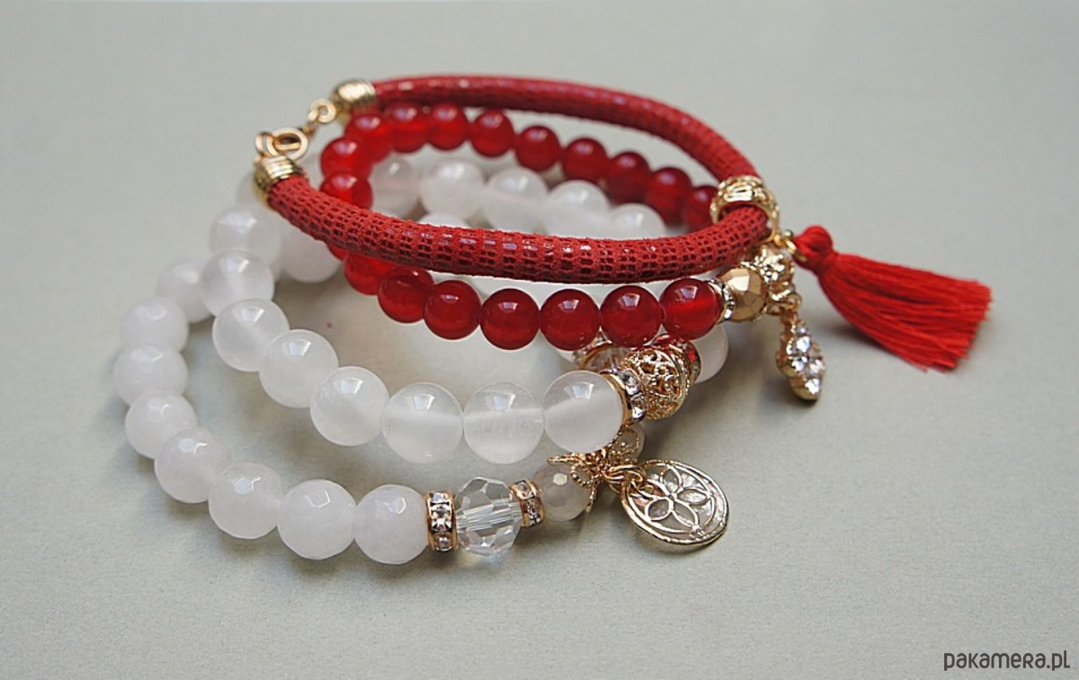 Komplet czterech bransoletek wykonanych z naturalnych kamieni: jadeity fasetowane [10mm], marmur szklisty [10mm], jadeity [8mm], hematyt fasetowany, platerowany [8mm], agaty fasetowane, platerowane [8mm], kryształki fasetowane [10mm], rzemienia z naturalnej, cielęcej skórki, zawieszki z cyrkoniami, chwostu oraz elementów metalowych w kolorze złota. Bransoletki pasują na nadgarstek 16 - 17cm. Możliwość dopasowania zestawu do innego nadgarstka - wcześniej prosimy o kontakt.Biżuteria ozdobnie zapakowana