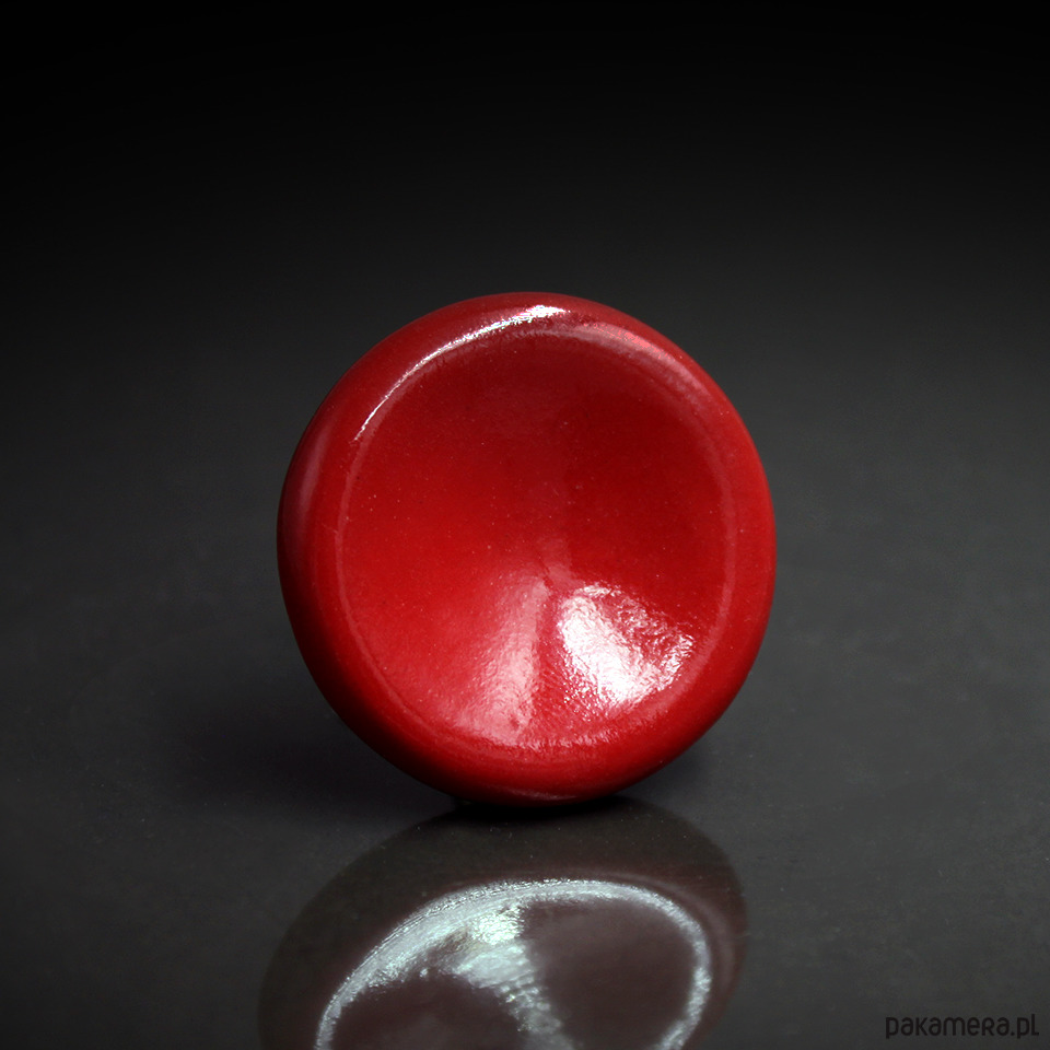 Oryginalna ceramiczna broszka, wykonana z delikatnej porcelany, szkliwiona mieszanką czerwonych błyszczących szkliw, zapięcie w kolorze starego złota. Średnica około 3,2cm, grubość około 1,2, broszka pomimo miękkich kształtów jest bardzo lekka, świetnie prezentuje się również na grubszych okryciach jak swetry czy płaszcze. Polecam