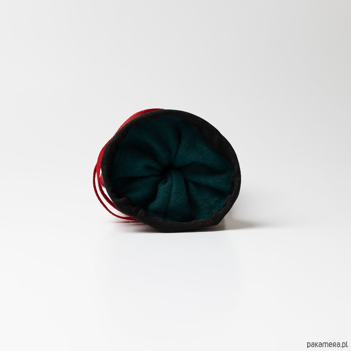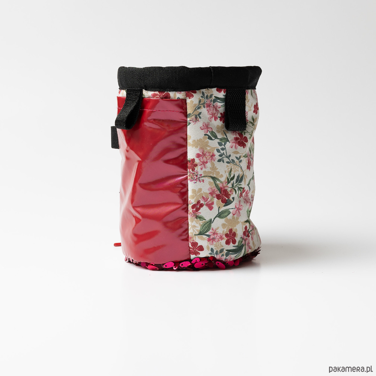 Woreczek wspinaczkowy na magnezję wykonany z różnej jakości tkanin.
