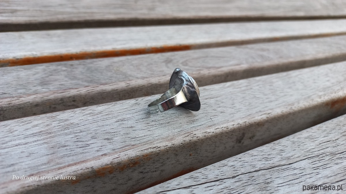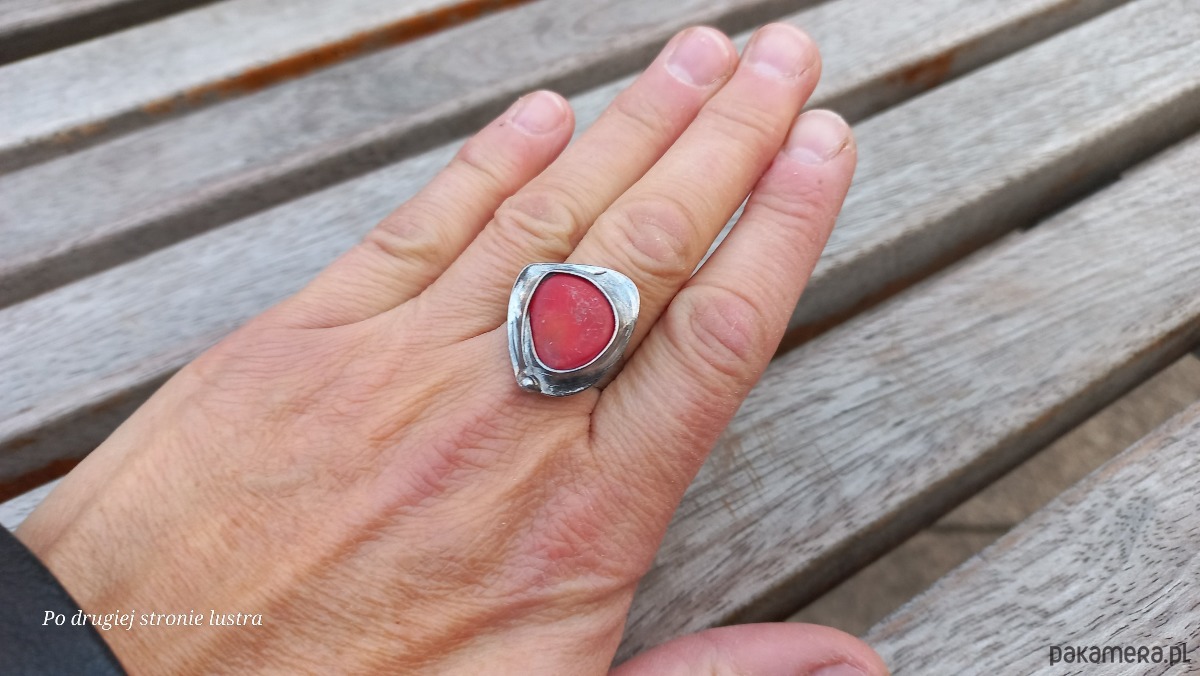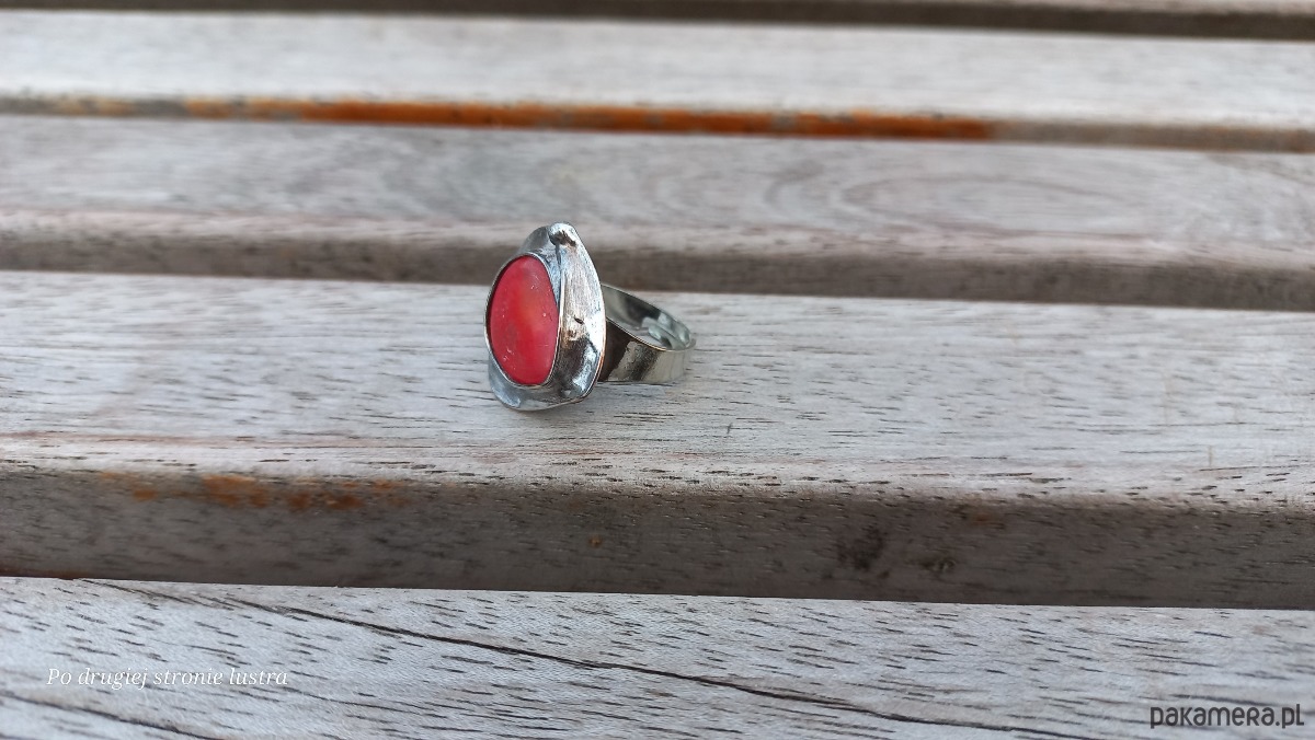 Pierścionek wykonany z miedzi, cyny i koralowca. Wymiary ok. 2 na 2 cm. Regulowany.