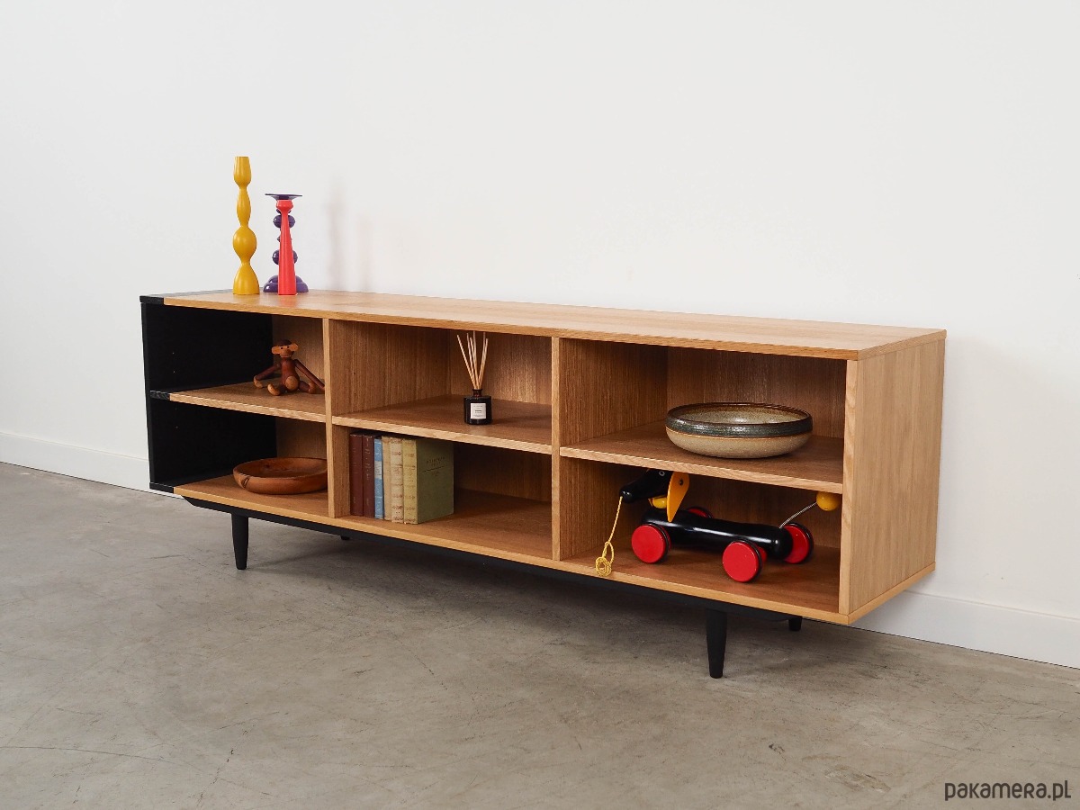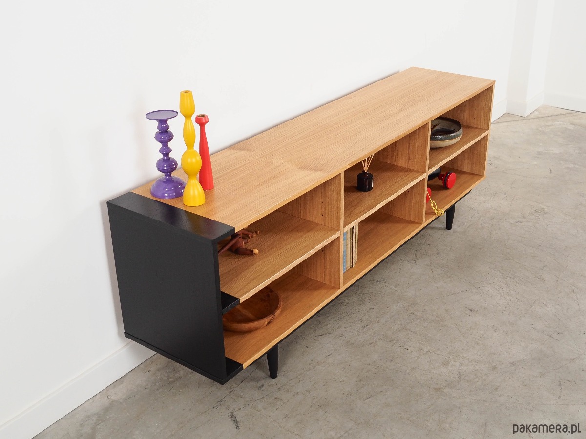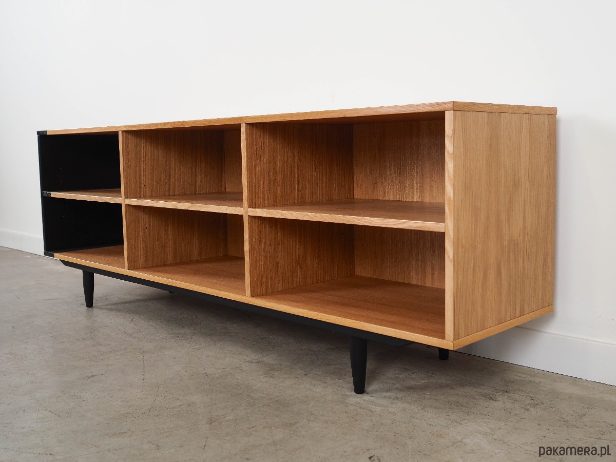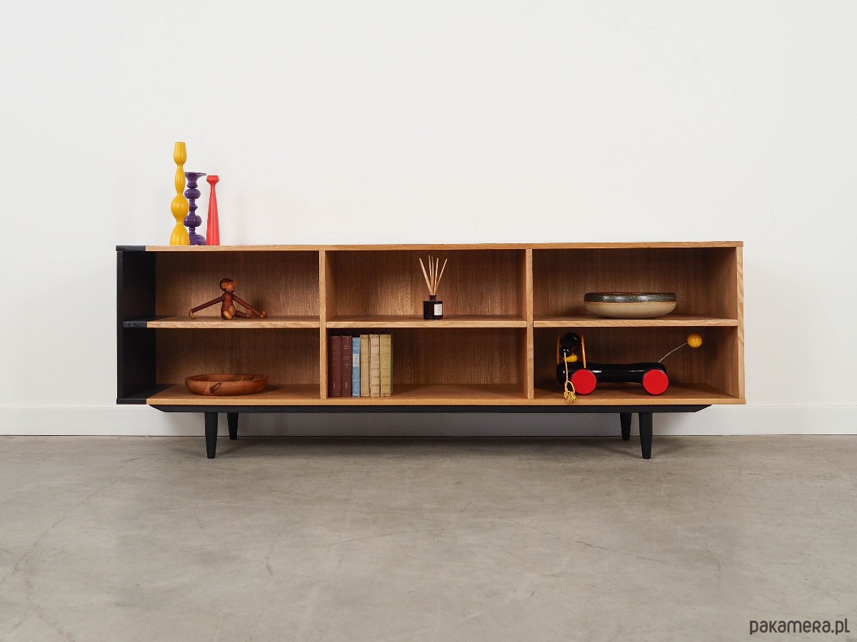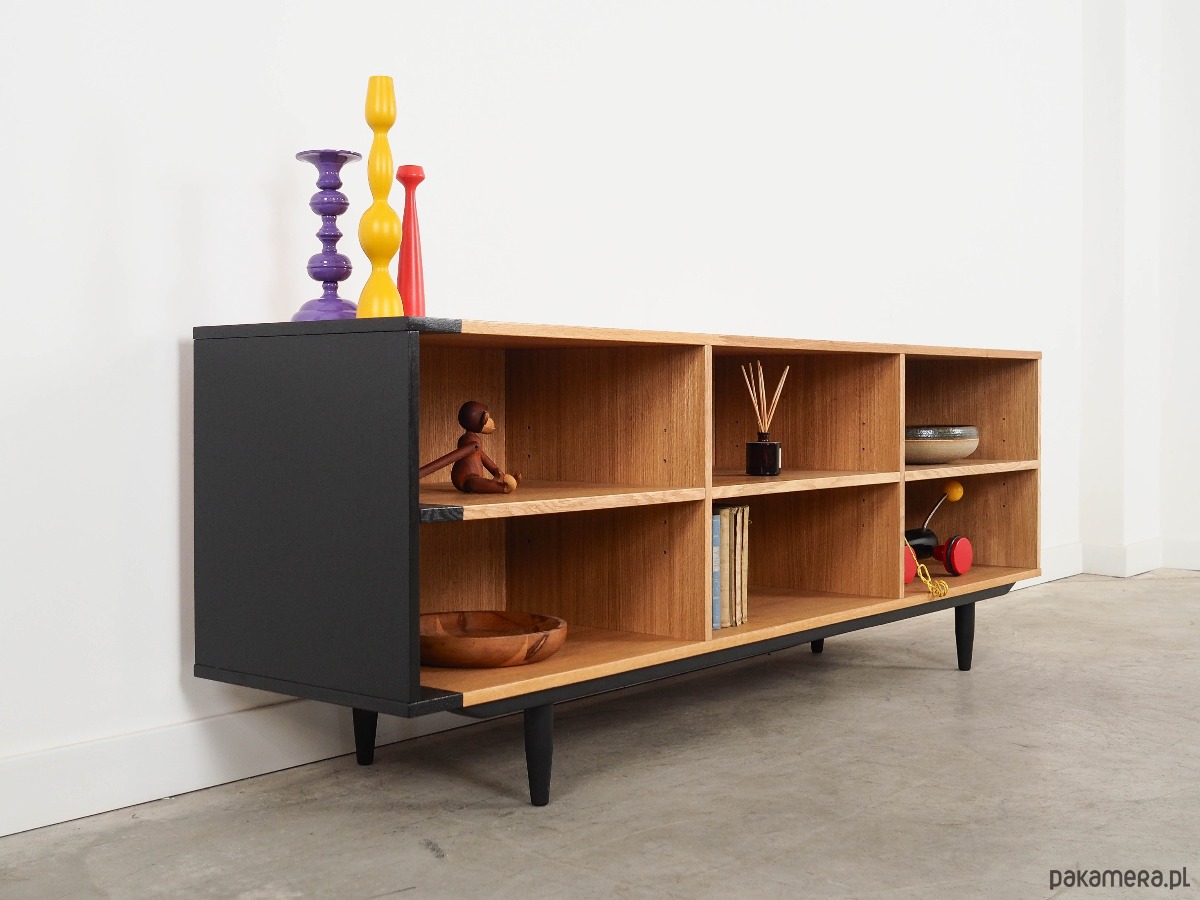 Konstrukcja pokryta jest fornirem dębowym. Nogi wykonane są z litego drewna wybarwionego na kolor czarny. Powierzchnia po odświeżeniu. Wewnątrz przestrzeń została wypełniona trzema praktycznymi półkami z możliwością regulacji wysokości. Regał jest idealnym rozwiązaniem na zbiór książek do zagospodarowania w małej przestrzeni mieszkalnej. Dodatkowo świetnie spełni funkcję regału na przedmioty kolekcjonerskie.