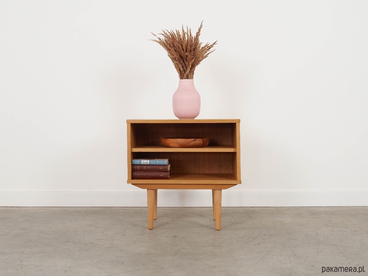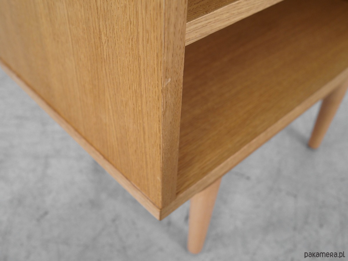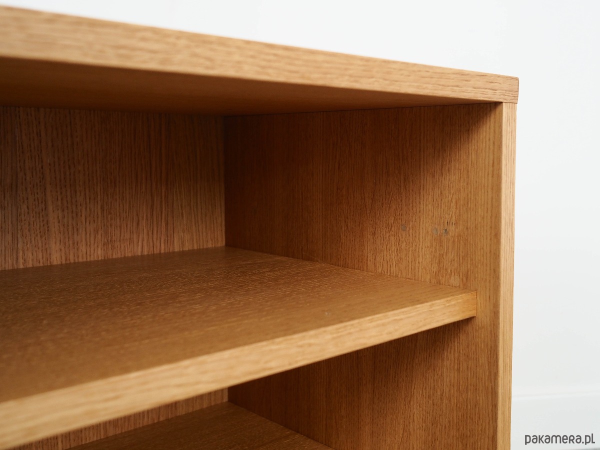 Konstrukcja pokryta jest fornirem dębowym. Nogi wykonane są z litego drewna. Powierzchnia po odświeżeniu. Wewnątrz przestrzeń została wypełniona praktyczną półką. Regał jest idealnym rozwiązaniem na zbiór książek do zagospodarowania w małej przestrzeni mieszkalnej. Dodatkowo świetnie spełni funkcję regału na przedmioty kolekcjonerskie.