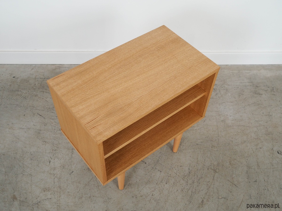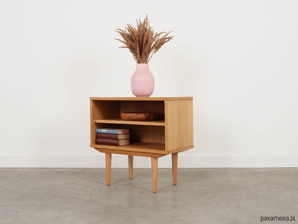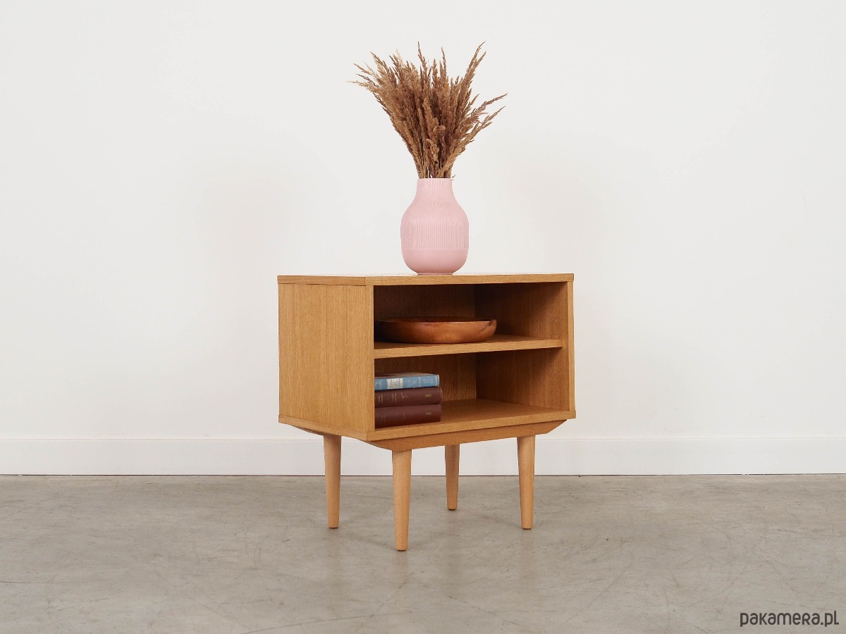 Konstrukcja pokryta jest fornirem dębowym. Nogi wykonane są z litego drewna. Powierzchnia po odświeżeniu. Wewnątrz przestrzeń została wypełniona praktyczną półką. Regał jest idealnym rozwiązaniem na zbiór książek do zagospodarowania w małej przestrzeni mieszkalnej. Dodatkowo świetnie spełni funkcję regału na przedmioty kolekcjonerskie.