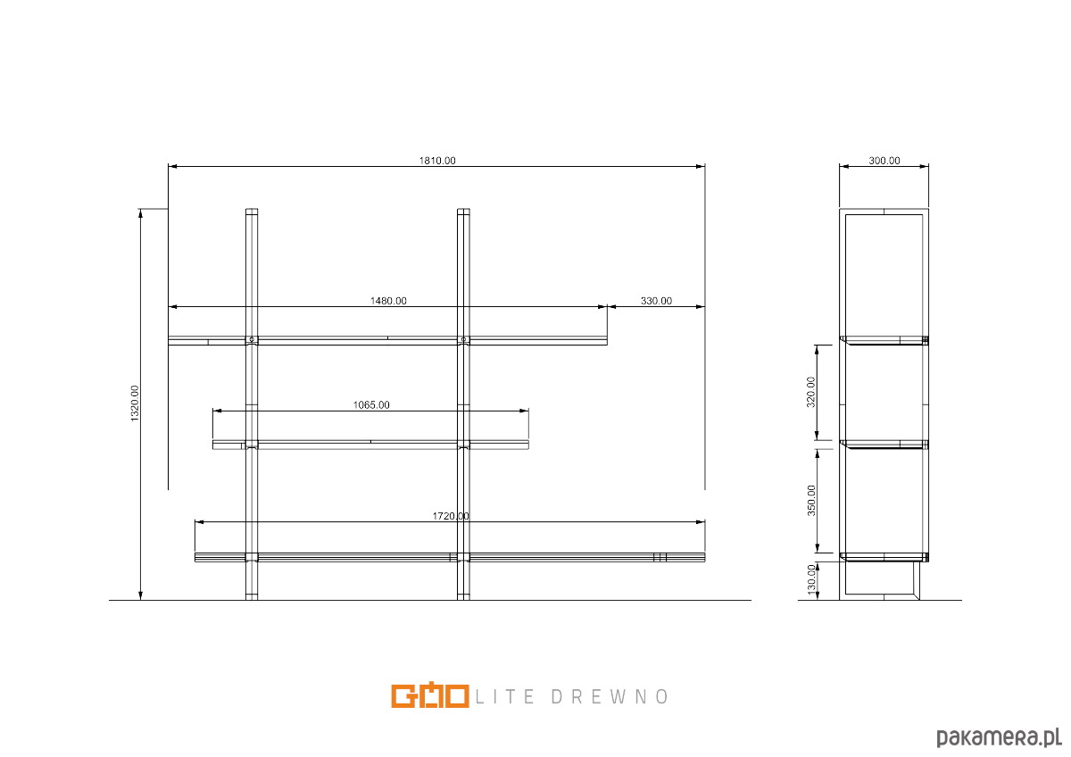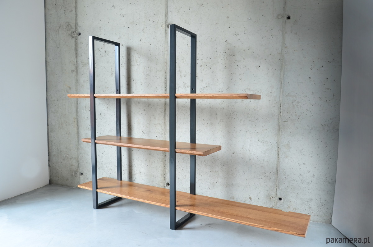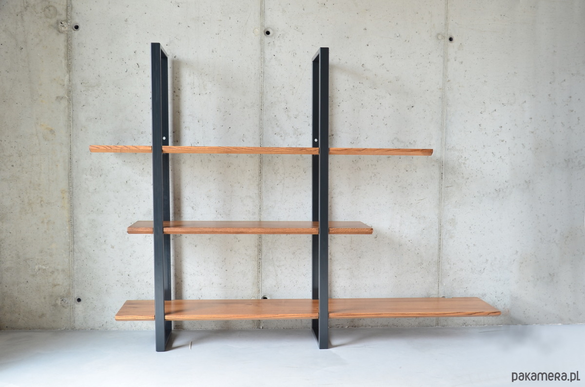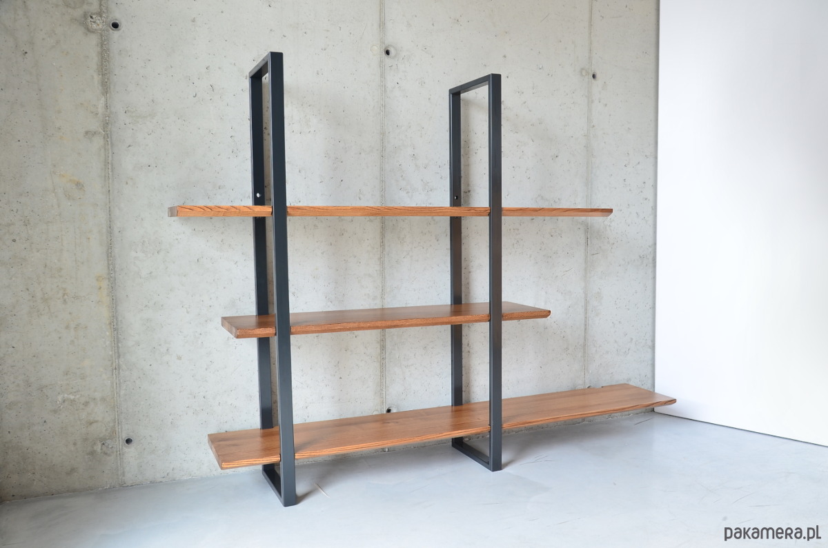 Geometryczny, niesymetryczny regał do salonu, biura lub sypialni. Stalowa rama i grube półki z litego drewna, gwarantują świetny wygląd na lata.