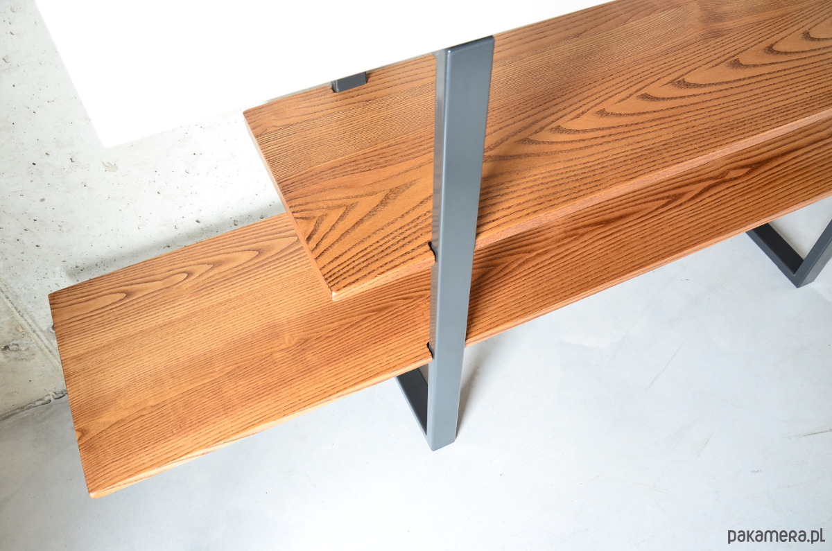 Geometryczny, niesymetryczny regał do salonu, biura lub sypialni. Stalowa rama i grube półki z litego drewna, gwarantują świetny wygląd na lata.