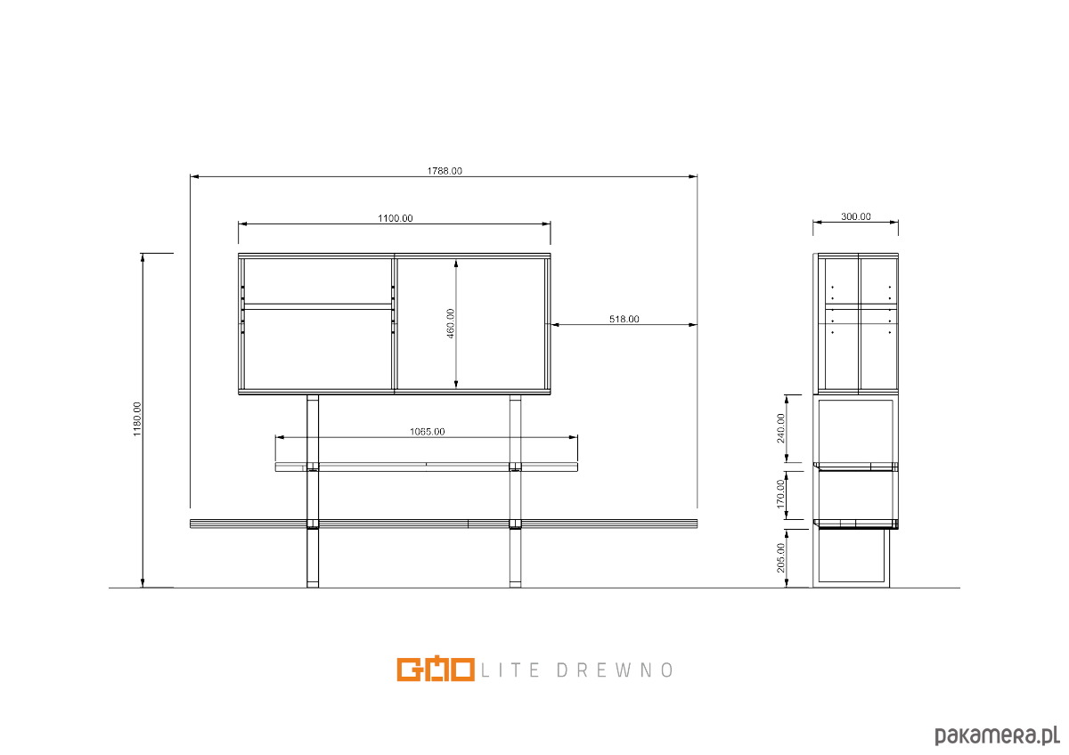 Funkcjonalności: Półki otwarte i jedna szafka z drzwiami barkowymi. Za drzwiami jedna przegroda i jedna półka.