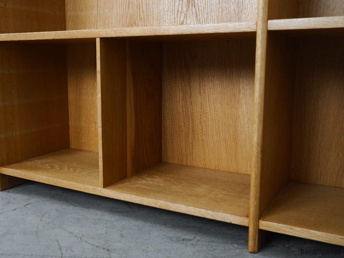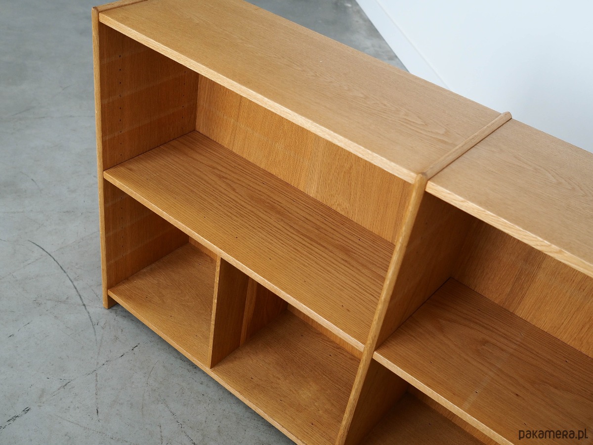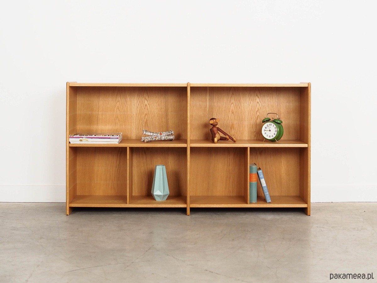 Konstrukcja pokryta jest fornirem jesionowym. Powierzchnia po odświeżeniu. Wewnątrz przestrzeń została wypełniona praktycznymi półkami i przegródkami. Zarówno półki, jak i przegródki, posiadają możliwość regulacji. Regał jest idealnym rozwiązaniem na zbiór książek do zagospodarowania w małej przestrzeni mieszkalnej.