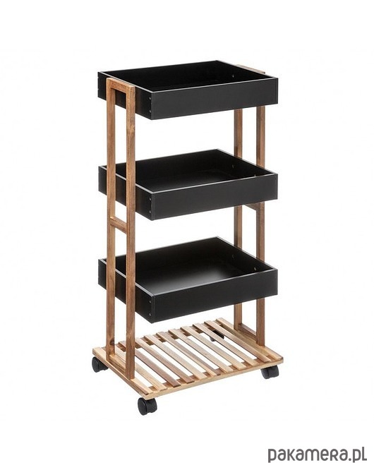 Regał łazienkowy na kółkach składający się z 4 poziomów. 3 szufladowe półki wykonane są z MDF, w kolorze czarnym lub białym. Dolna składa się ze szczebli w jasnym kolorze całego stelaża. Bardzo wygodny mebel zarówno do łazienki, jak i do kuchni lub pokoju.