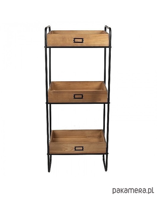Ciekawy stojak wykonany z metalu w kolorze czarnym. Posiada trzy półki w formie tac wykonanych z drewna jodłowego.