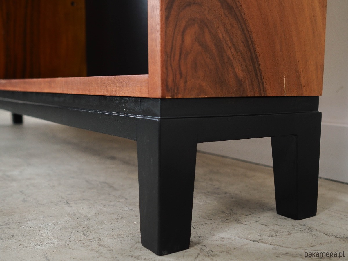 Konstrukcja pokryta jest fornirem orzechowym. Nogi wykonane zostały z litego drewna wybarwionego na kolor czarny. Powierzchnia po odświeżeniu. Wewnątrz przestrzeń została wypełniona czterema praktycznymi półkami z możliwością regulacji wysokości. Regał jest idealnym rozwiązaniem na zbiór książek do zagospodarowania w małej przestrzeni mieszkalnej. Dodatkowo świetnie spełni funkcję regału na przedmioty kolekcjonerskie.