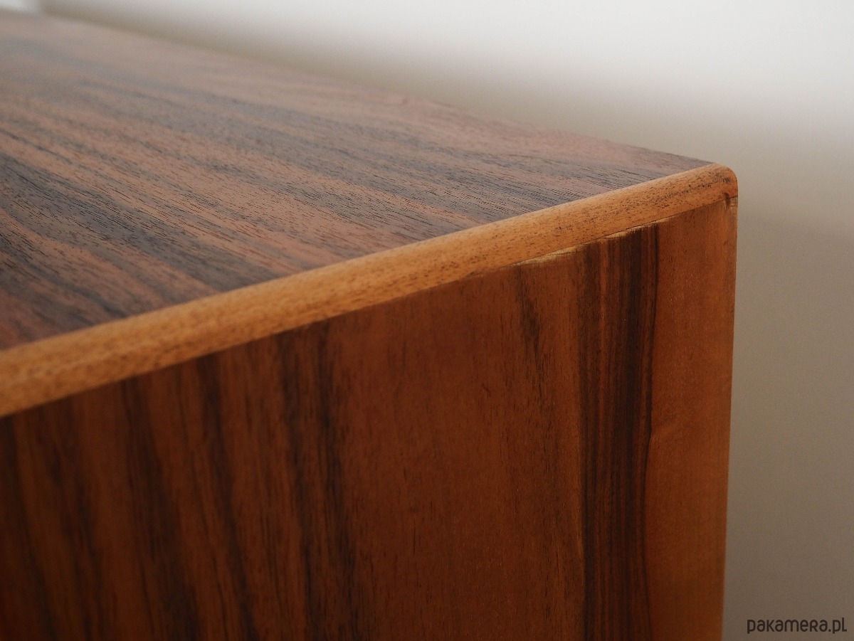 Stan: Powierzchnia mebla po odświeżeniu. Widoczne drobne zarysowania, obicia oraz wypełnione ubytki forniru. Większe ślady użytkowania zawsze przedstawiamy na zdjęciach. Produkt przygotowany bezpośrednio do użytkowania.