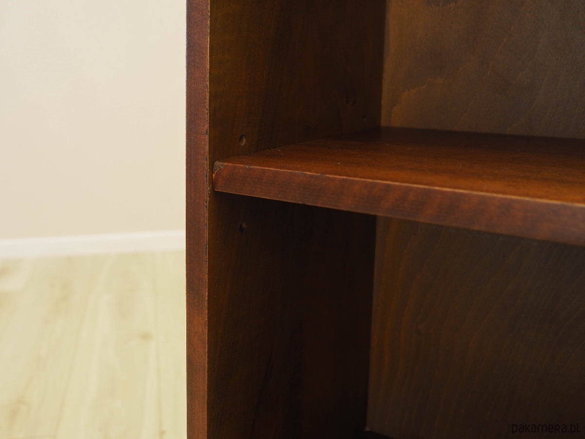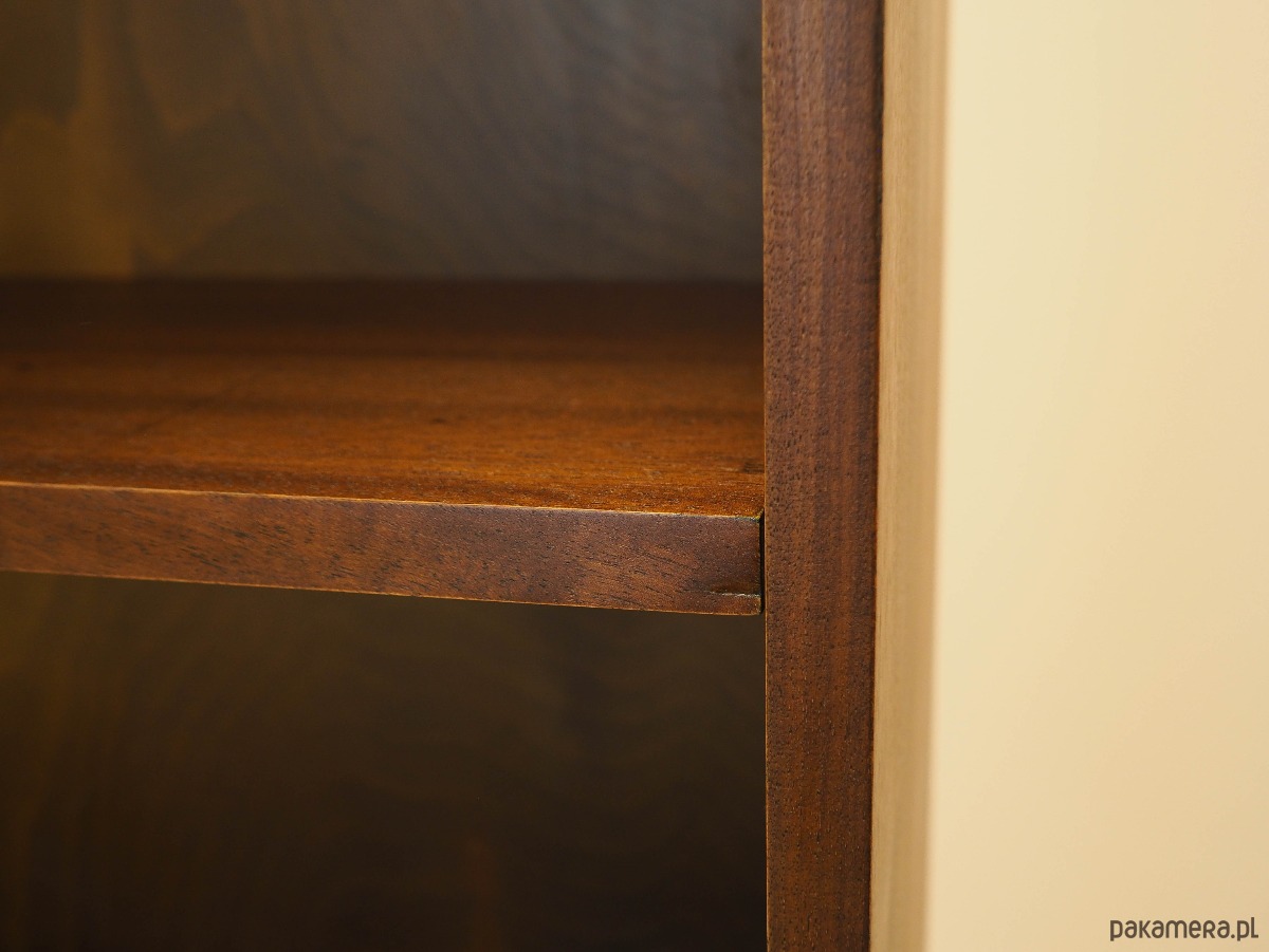 Konstrukcja pokryta jest fornirem orzechowym. Nogi zostały wykonane z litego drewna. Wewnątrz przestrzeń została wypełniona czterema praktycznymi półkami. Druga półka od dołu nie posiada możliwości regulacji wysokości. Regał jest idealnym rozwiązaniem na duży zbiór książek do zagospodarowania w małej przestrzeni mieszkalnej.