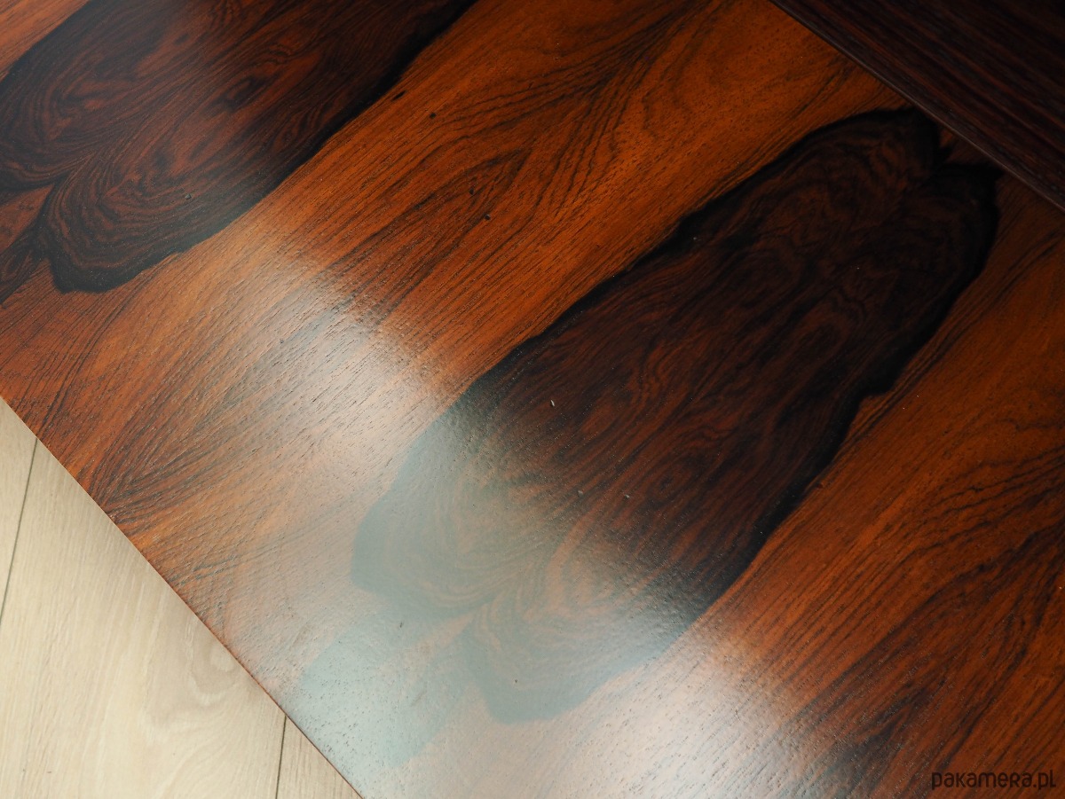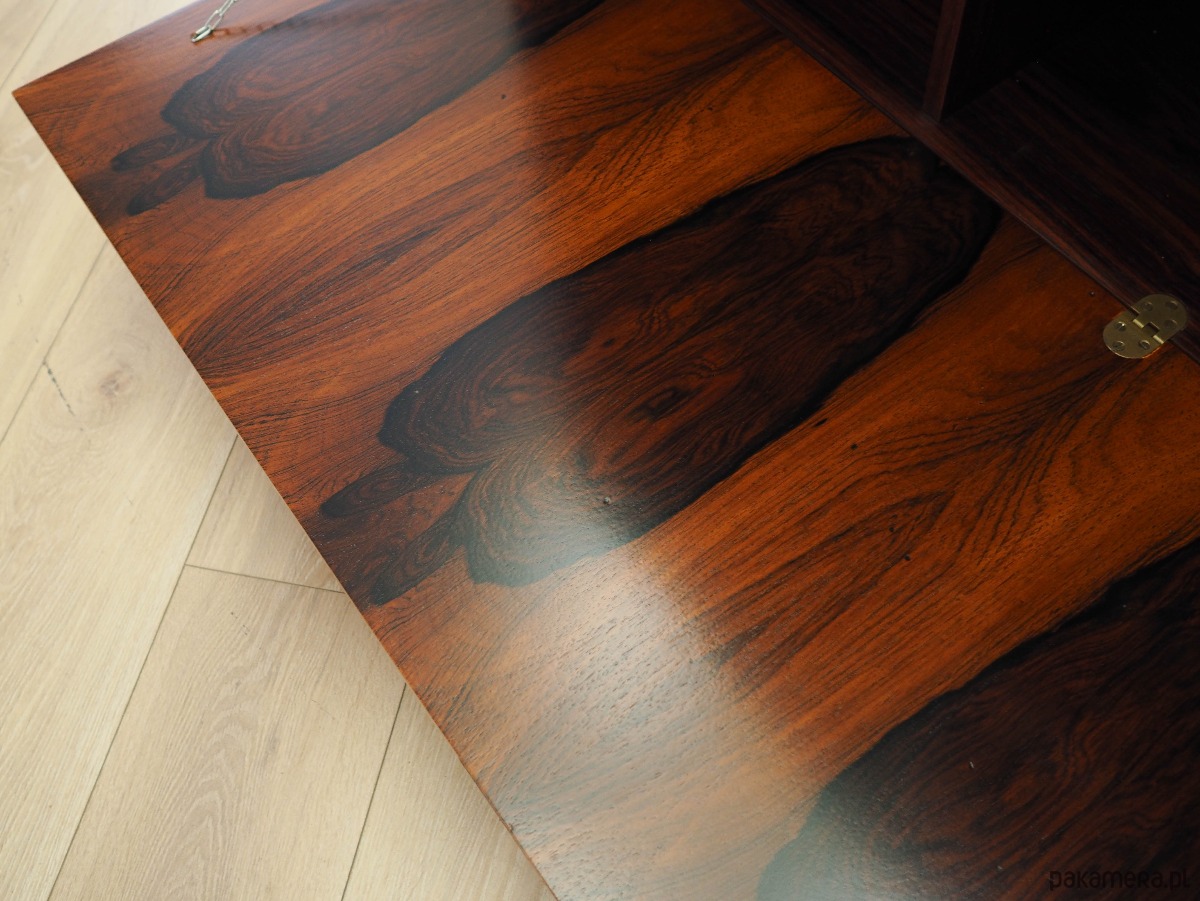 Konstrukcja pokryta jest fornirem palisandrowym. Nogi wykonane z litego drewna wybarwionego na kolor czarny. Powierzchnia po odświeżeniu. Wewnątrz przestrzeń została wypełniona dwiema praktycznymi półkami z możliwością regulacji wysokości. Regał jest idealnym rozwiązaniem na zbiór książek do zagospodarowania w małej przestrzeni mieszkalnej. Dodatkowym atutem mebla jest uniwersalny barek, wewnątrz którego znajdują się dwie regulowane półki oraz dwie praktyczne szufladki. Klucz w zestawie. Mebel posiada otwór w płycie tylnej, przeznaczony na kabel.