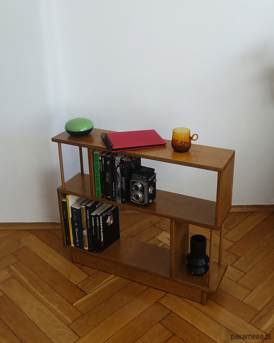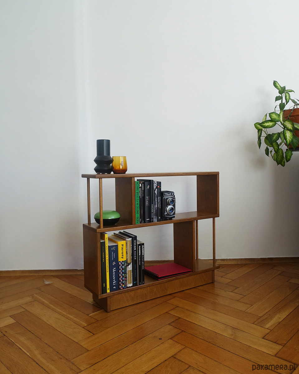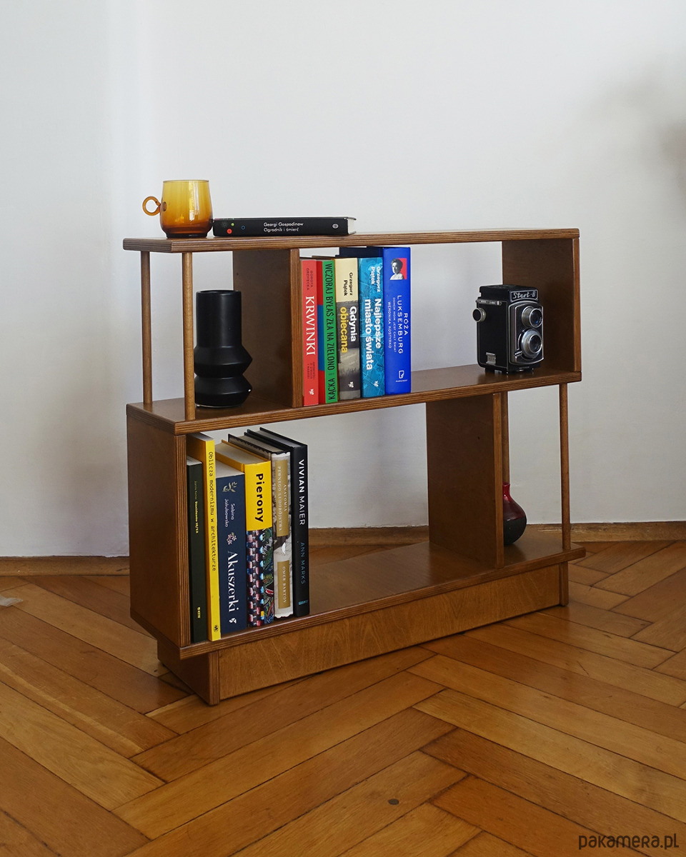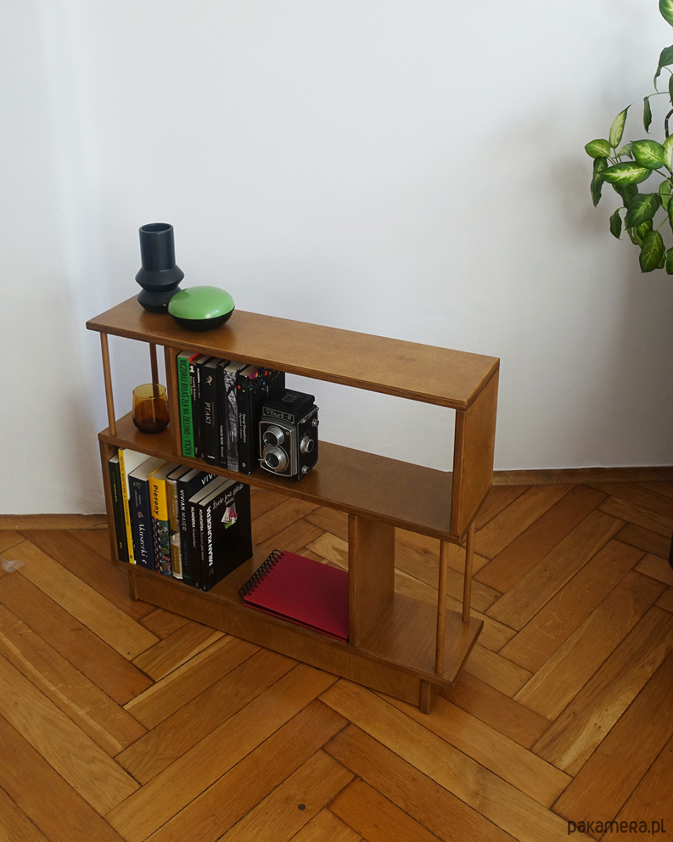 Regał R12 wykonany jest ze sklejki o grubości 18mm. Idealnie sprawdzi się stojąc obok sofy w pokoju dziennym, szczególnie w sytuacji, gdy brakuje miejsca na stolik pomocnik lub szafkę.