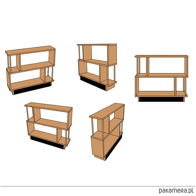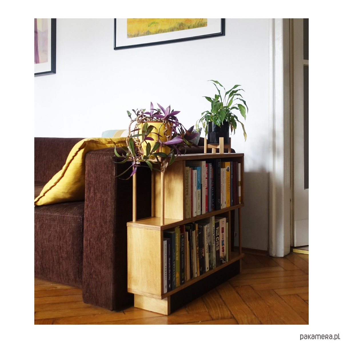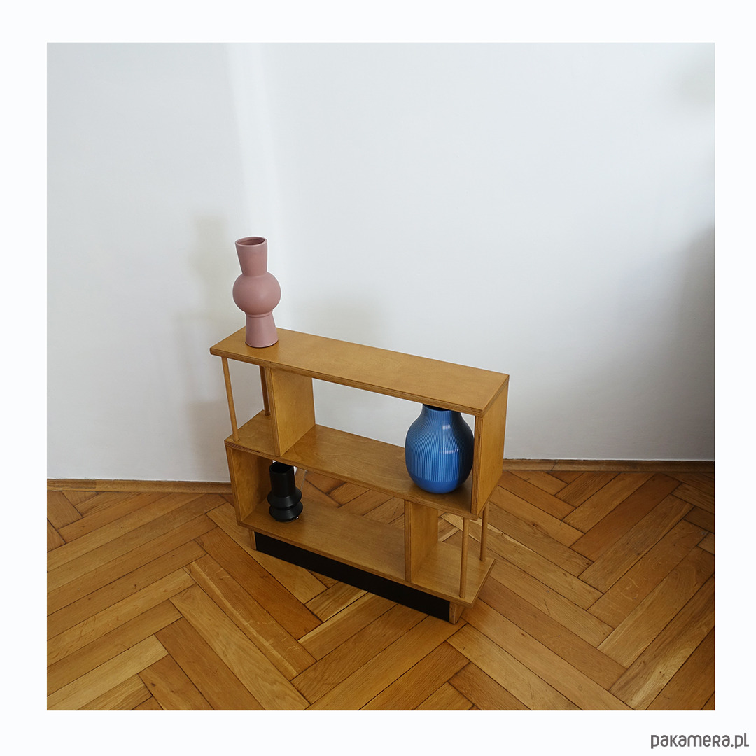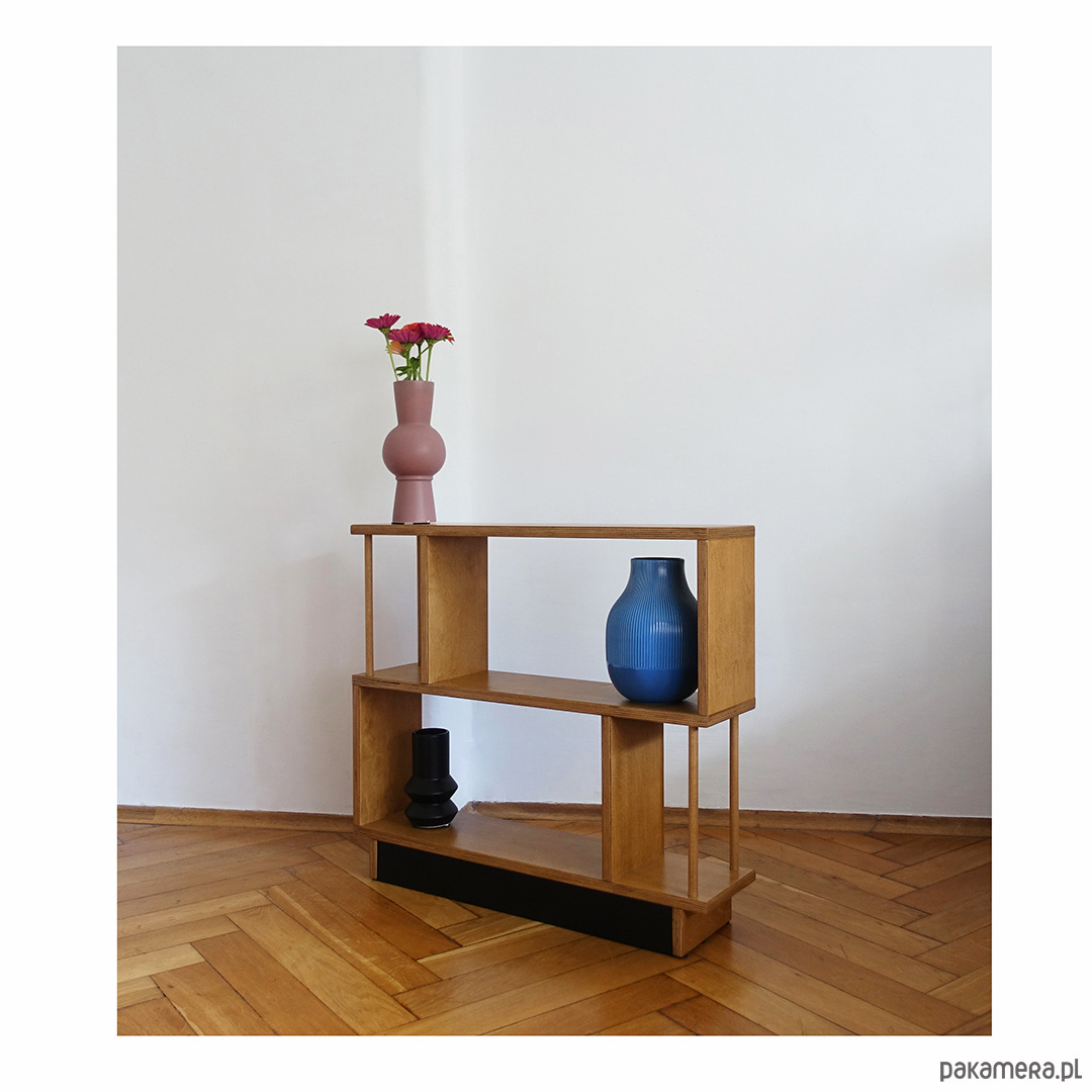 Regał R2 wykonany jest ze sklejki o grubości 18mm. Idealnie sprawdzi się stojąc obok sofy w pokoju dziennym, szczególnie w sytuacji, gdy brakuje miejsca na stolik pomocnik lub szafkę.