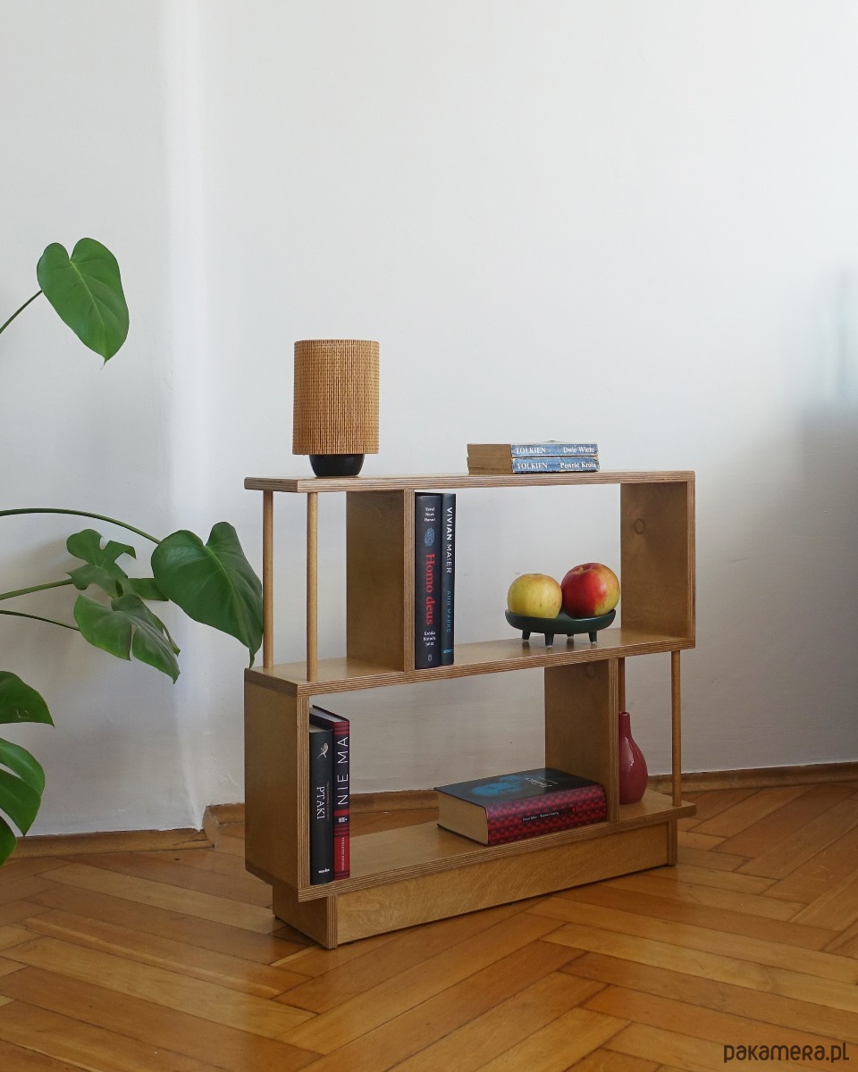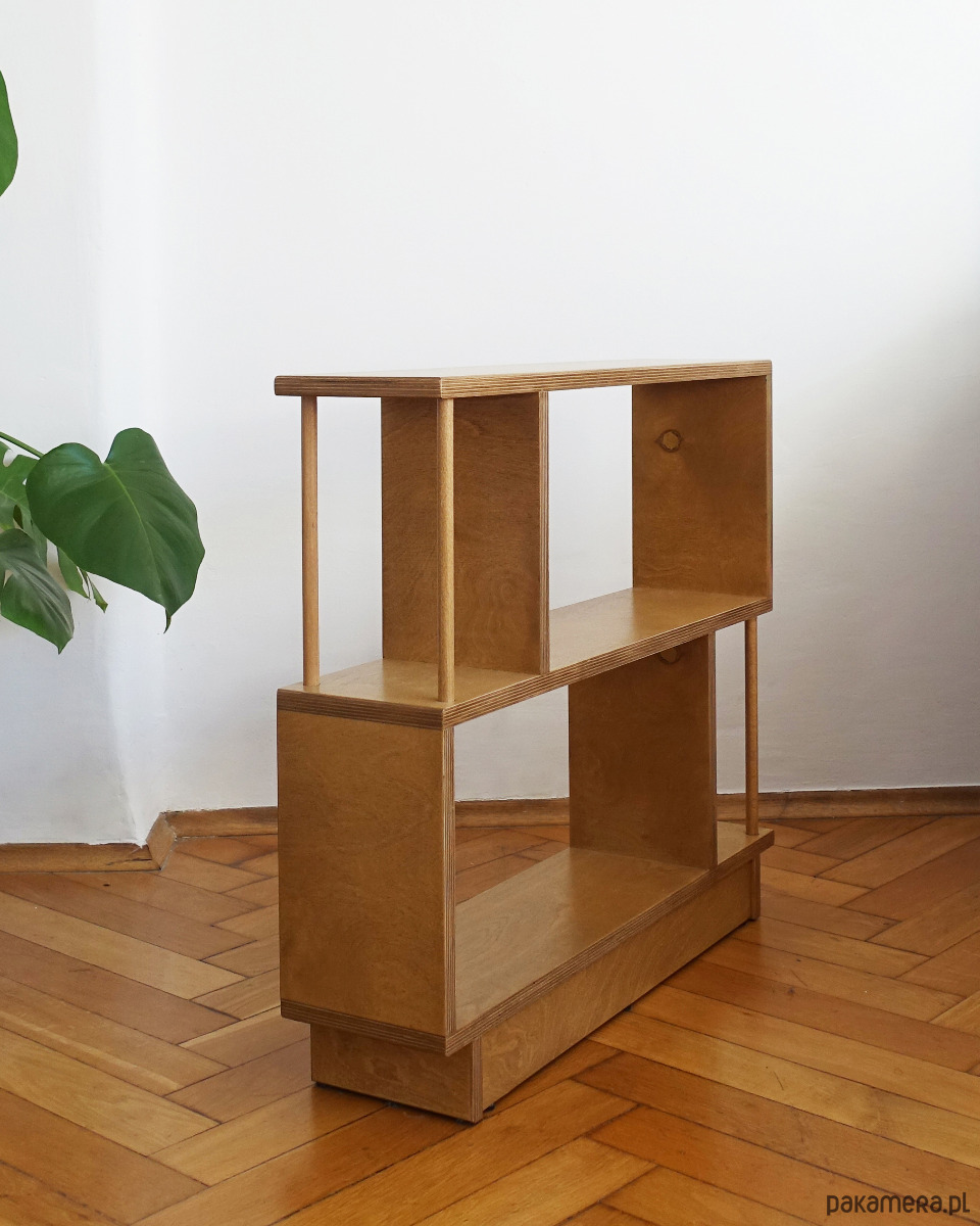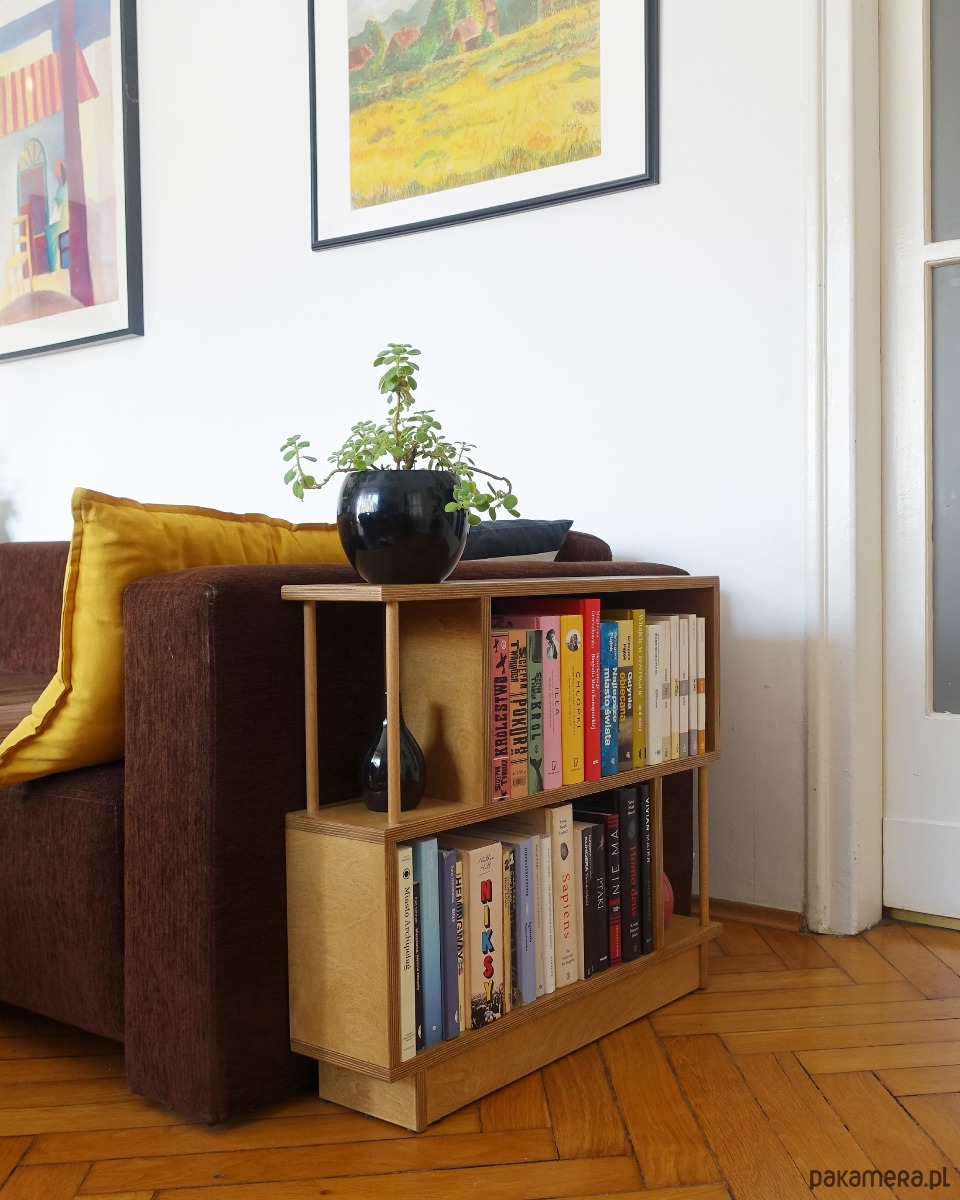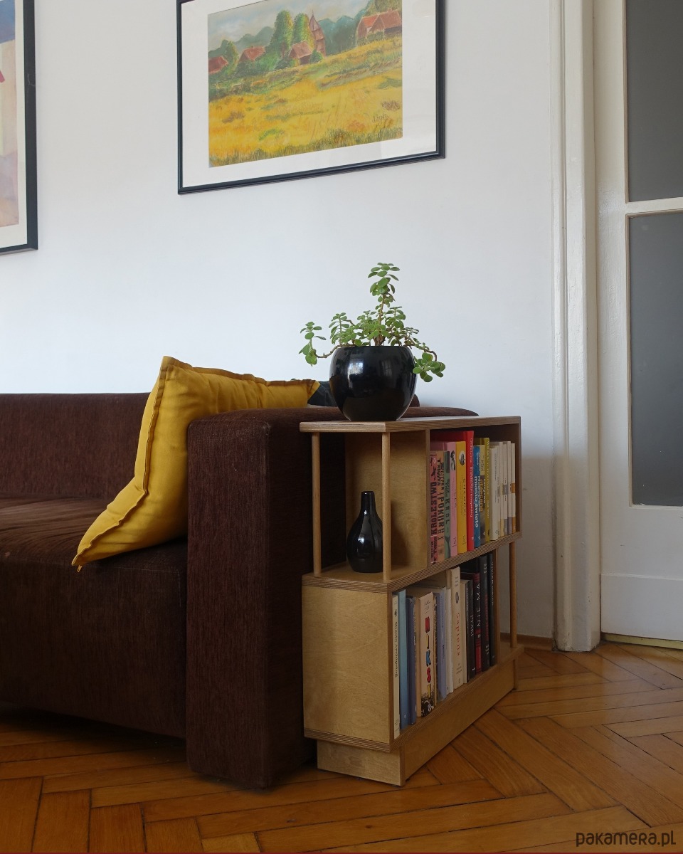 Regał R2 wykonany jest ze sklejki o grubości 18mm. Idealnie sprawdzi się stojąc obok sofy w pokoju dziennym, szczególnie w sytuacji, gdy brakuje miejsca na stolik pomocniczy lub szafkę.