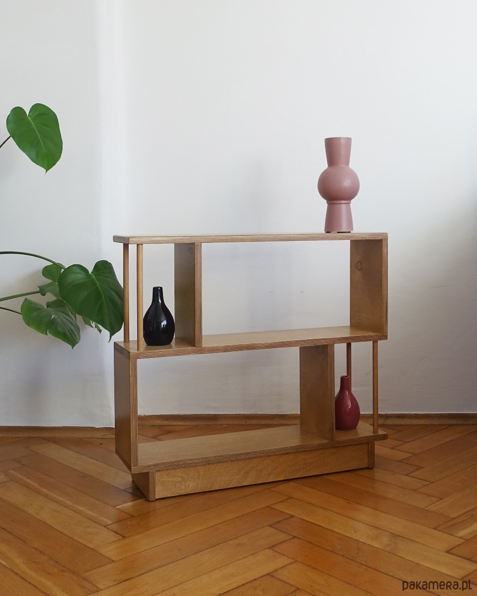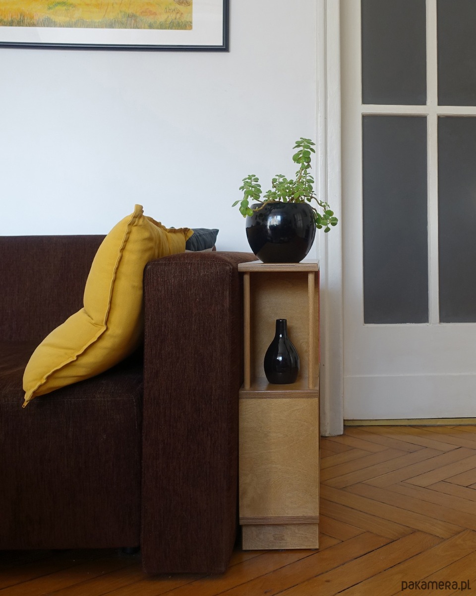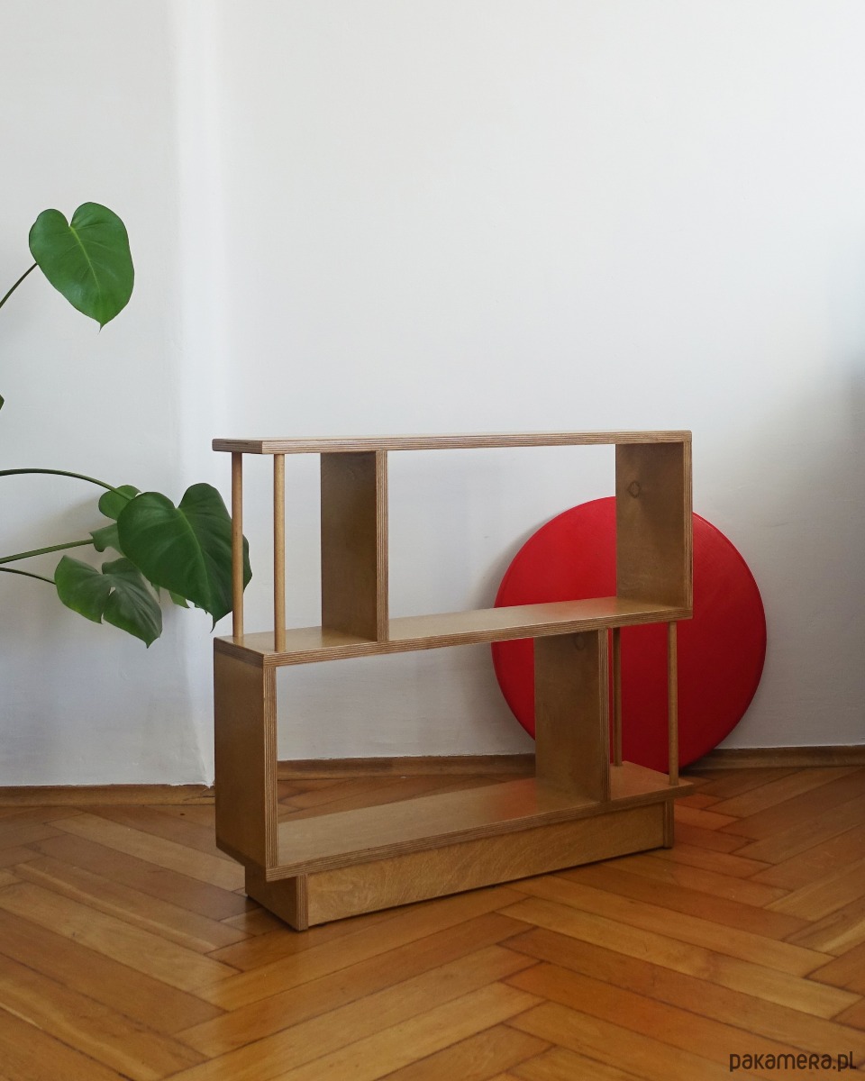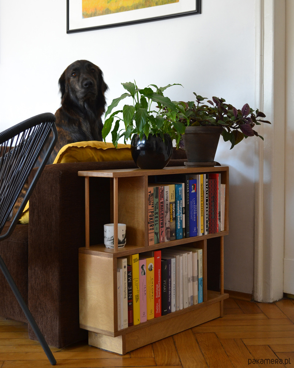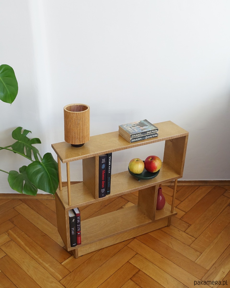 Regał R2 wykonany jest ze sklejki o grubości 18mm. Idealnie sprawdzi się stojąc obok sofy w pokoju dziennym, szczególnie w sytuacji, gdy brakuje miejsca na stolik pomocniczy lub szafkę.