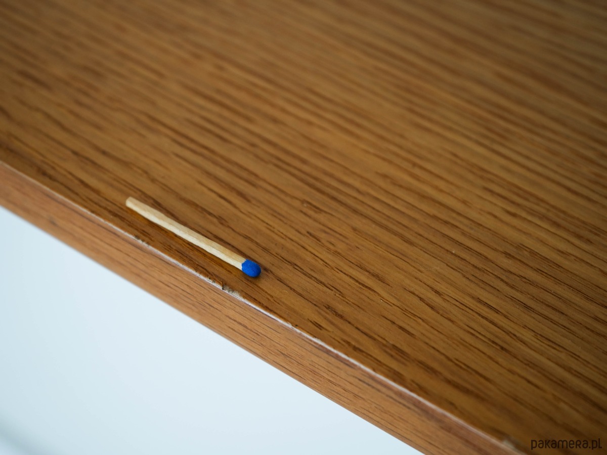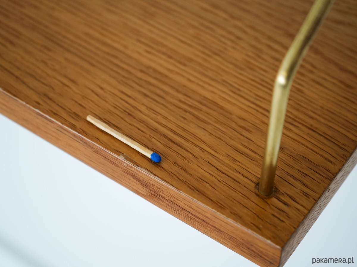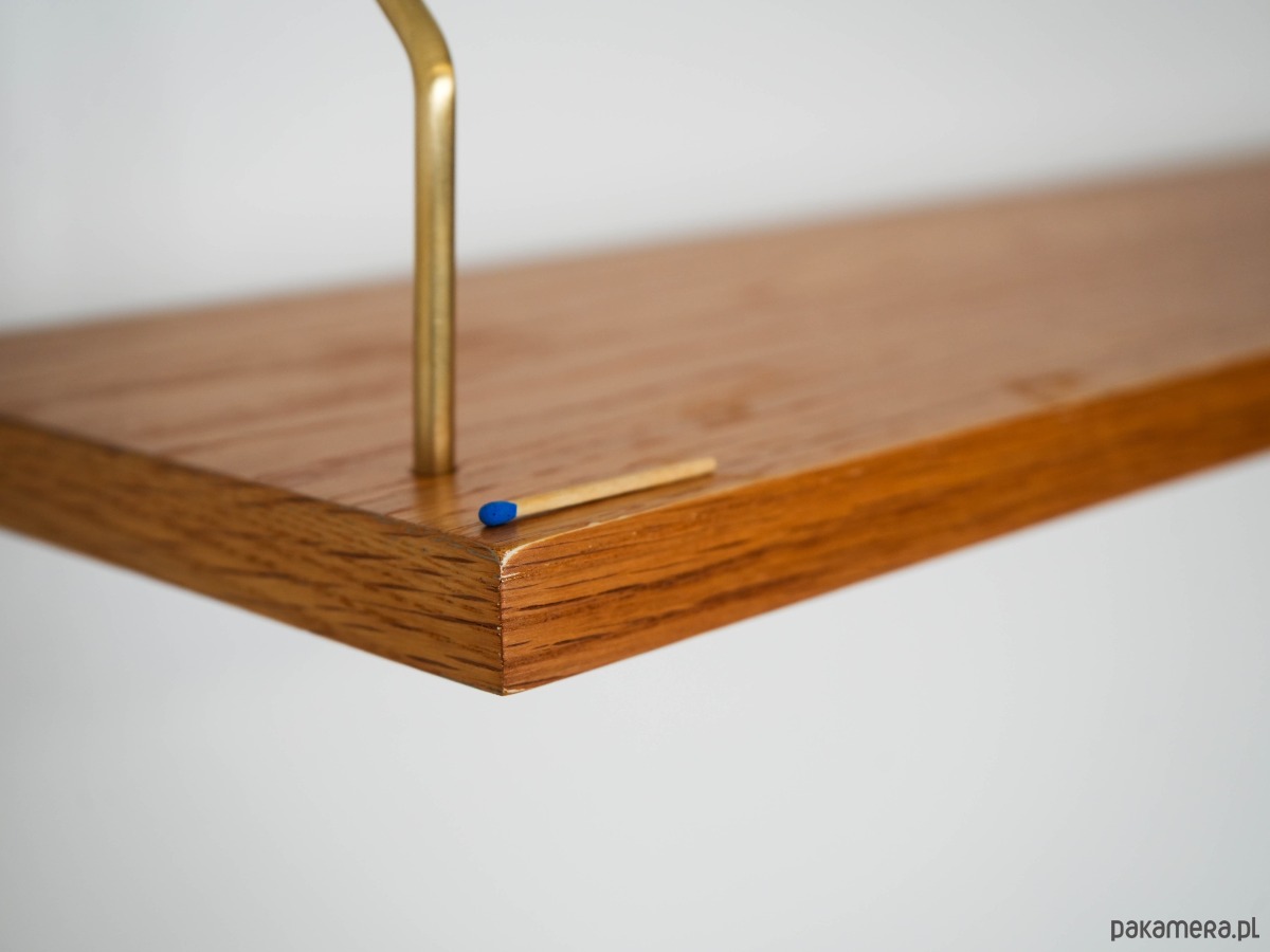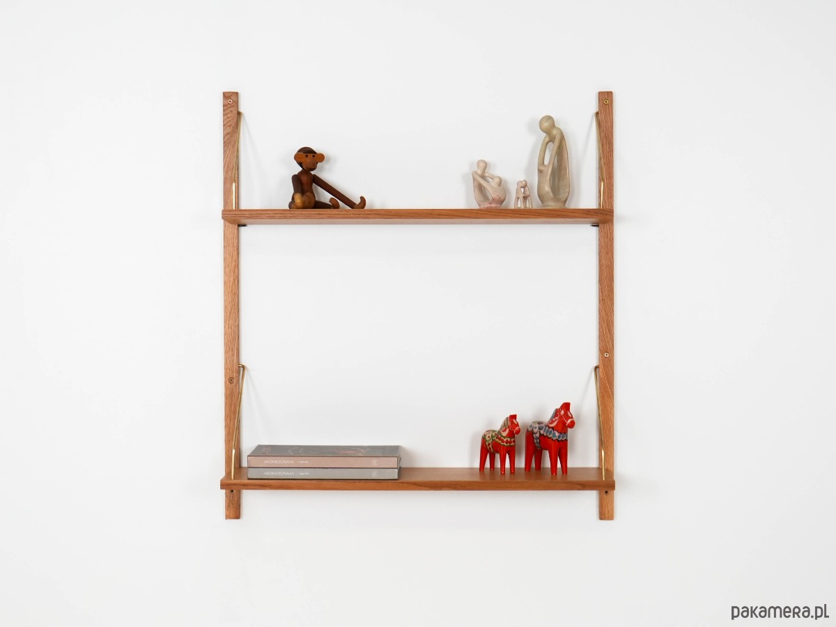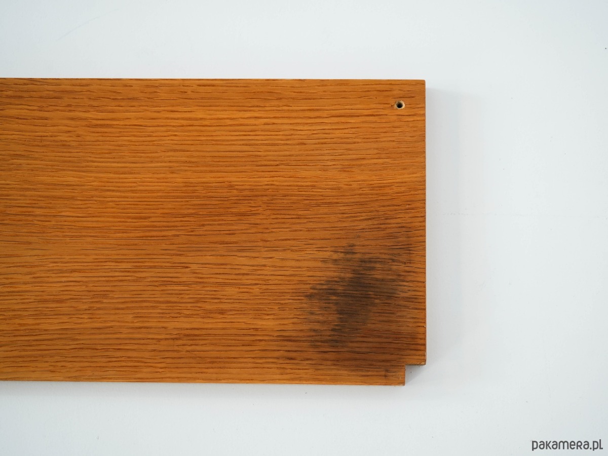 Konstrukcja pokryta została fornirem dębowym. Powierzchnia po odświeżeniu. Mebel składa się z dwóch praktycznych półek, których wysokość można regulować. Mebel jest idealnym rozwiązaniem na zbiór książek do zagospodarowania w małej przestrzeni mieszkalnej. Dodatkowo świetnie spełni funkcję regału na przedmioty kolekcjonerskie.